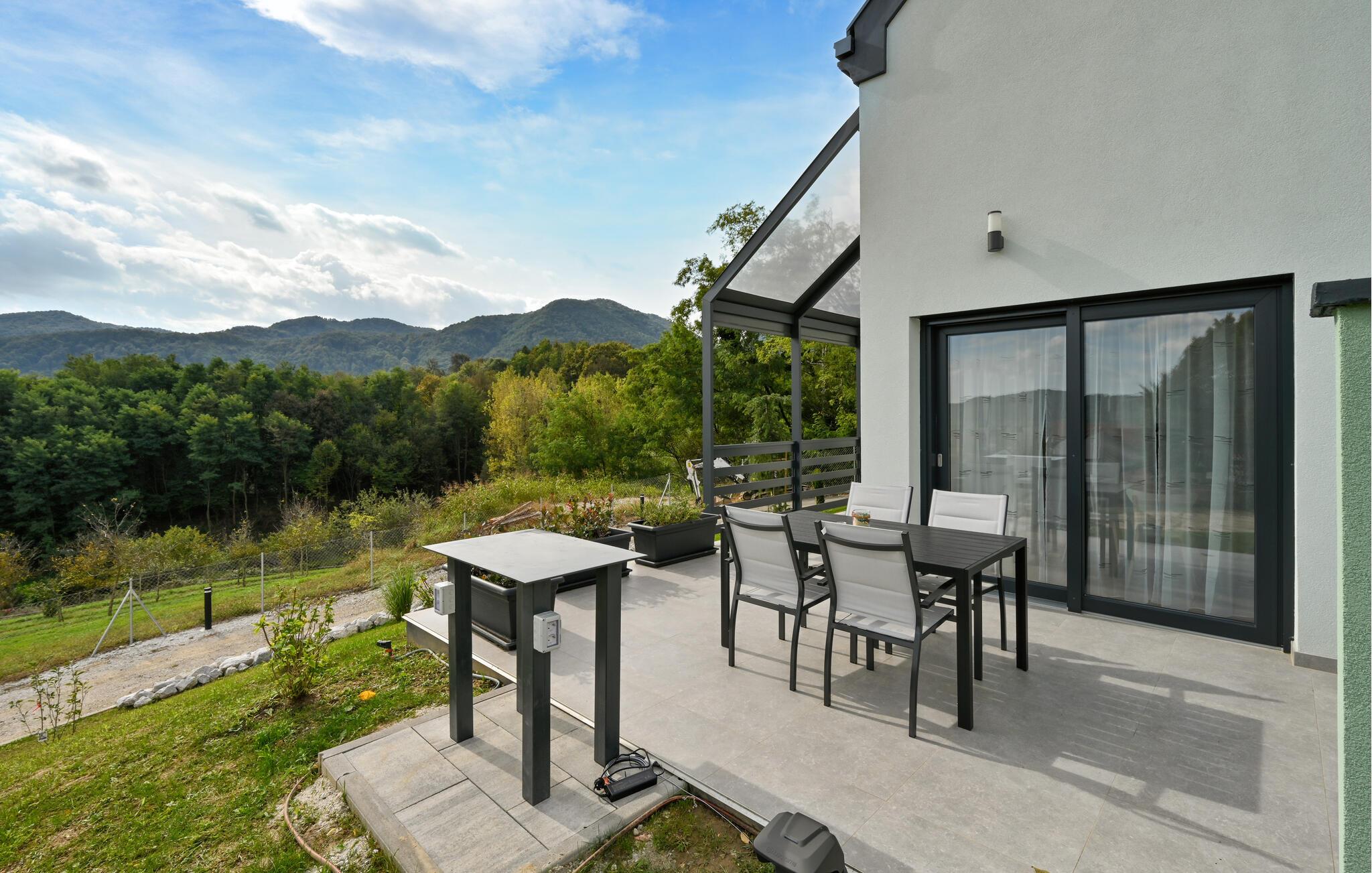 Genießen Sie Ihre Mahlzeiten auf der Terrasse, die Ihnen einen herrlichen Blick über die umliegende Natur bietet. Schmieden Sie dabei Ihre nächsten Unternehmungen.