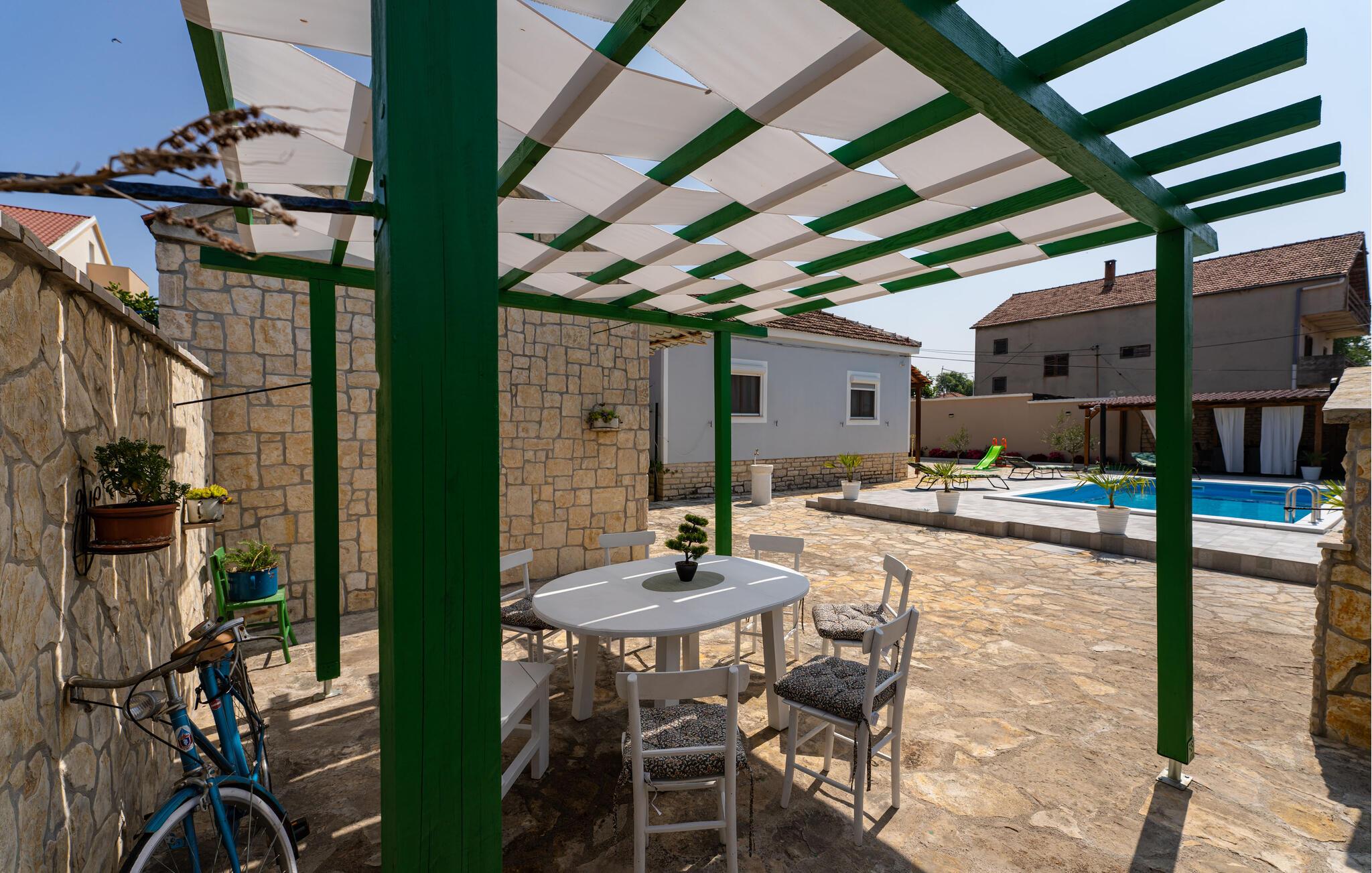 Der sonnige Außenbereich bietet schöne Spielmöglichkeiten für Ihre Kinder und lauschige Schattenplätze, auf denen Sie die mediterrane Atmosphäre bei stimmungsvollen Grillabenden genießen können. Erfrischen Sie sich nach Lust und Laune im herrlichen Pool, spielen Sie Tischtennis oder Badminton mit der ganzen Familie.