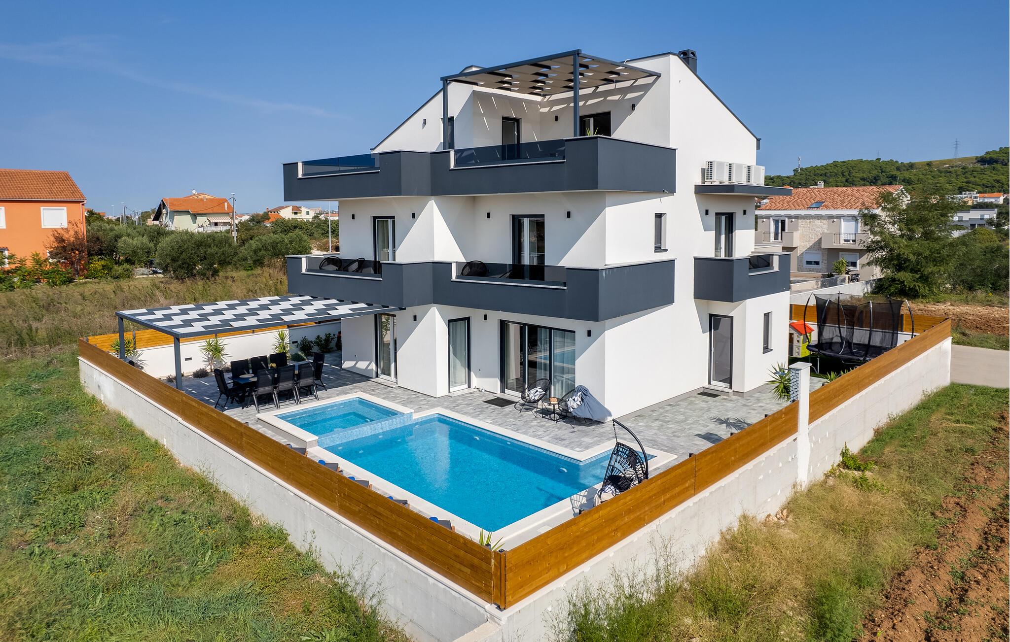 Willkommen in diesem geräumigen und sehr gut ausgestatteten Haus mit hochwertiger Einrichtung und großen Zimmern. Hier können Sie sich auf eine stilvolle und detailreiche Ausstattung freuen, die das Wohnerlebnis zu einer unvergesslichen Zeit macht. Auf mehreren Etagen, mit zahlreichen Balkonen und einer großen Terrasse können Sie Ihre Zeit mit Kaffeetrinken, Lessen und Yogaübungen verbringen. Schauen Sie Ihren Kindern beim Plantschen im Pool oder Hüpfen auf dem Trampolin zu und kommen auf der überdachten Terrasse für gesellige Abende mit leckerem Essen zusammen.