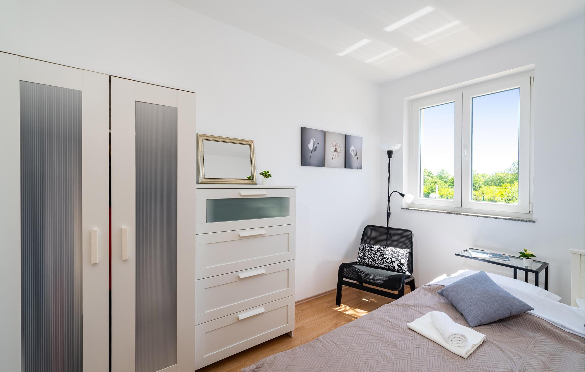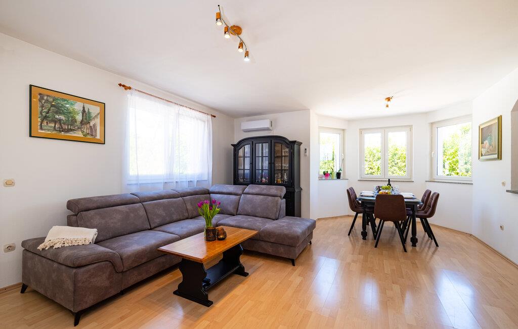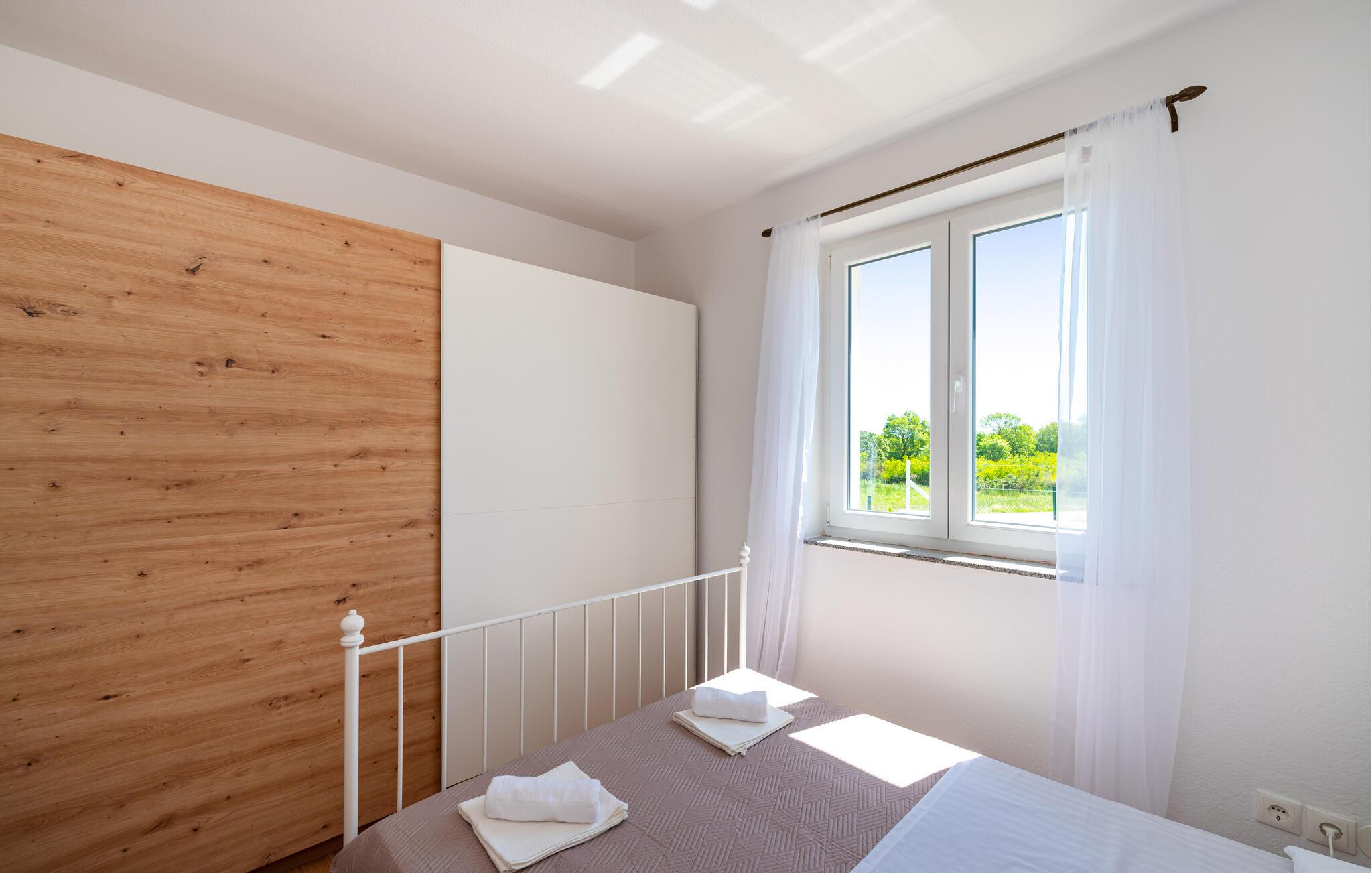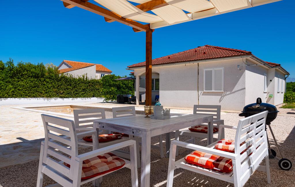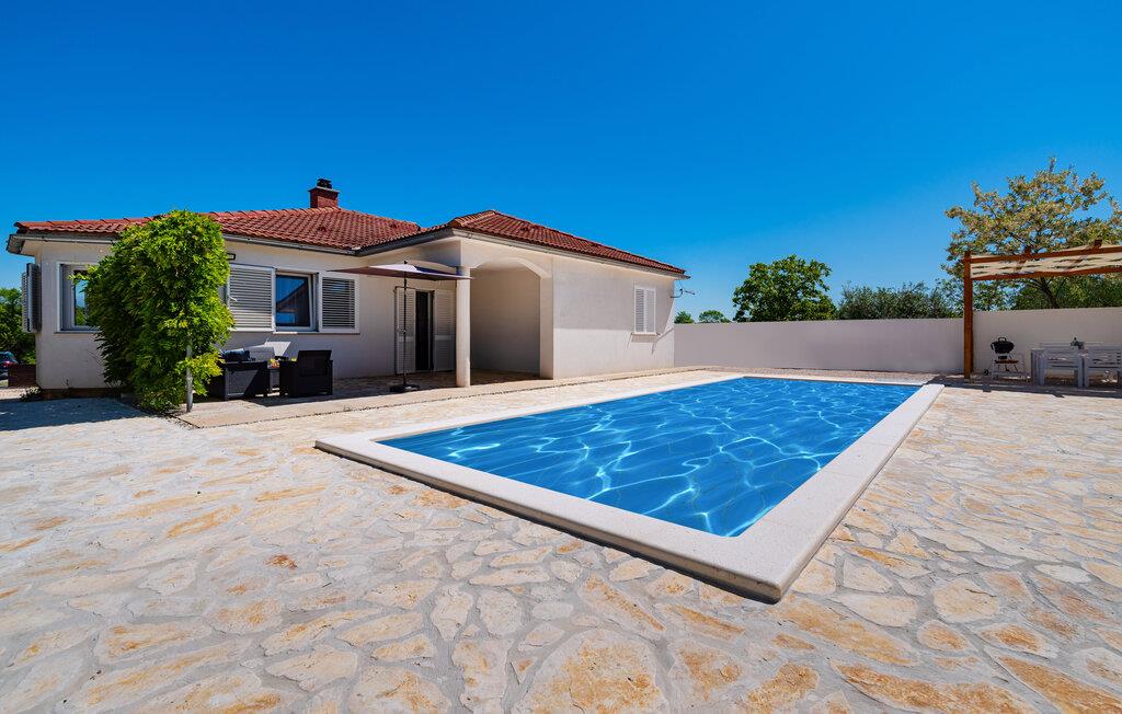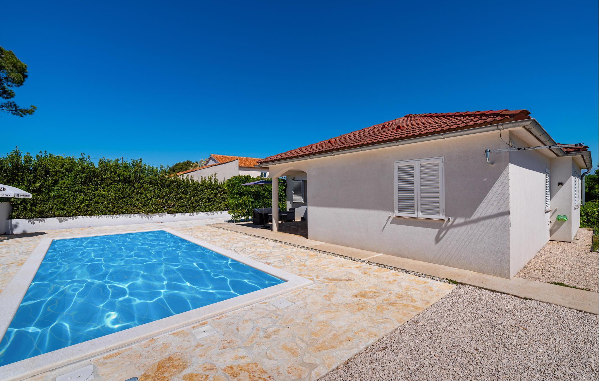 Inmitten der ruhigen Landschaft von Brisevo erwartet Sie dieses stilvolle Ferienhaus mit einem großzügigen Außenbereich und einem herrlichen Pool. Die moderne Einrichtung kombiniert klare Linien mit warmen Akzenten und sorgt für eine gemütliche Atmosphäre. Die offene Küche ist bestens ausgestattet und lädt Sie zu geselligen Abenden mit Ihren Liebsten ein. Im Wohnbereich genießen Sie Komfort und Eleganz, während die Schlafzimmer Ihnen erholsame Nächte versprechen. Besonders einladend ist die große überdachte Terrasse mit Blick auf den Pool – der perfekte Ort, um den Tag entspannt ausklingen zu lassen.