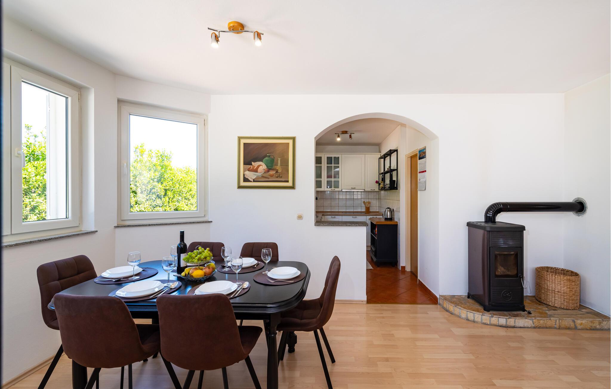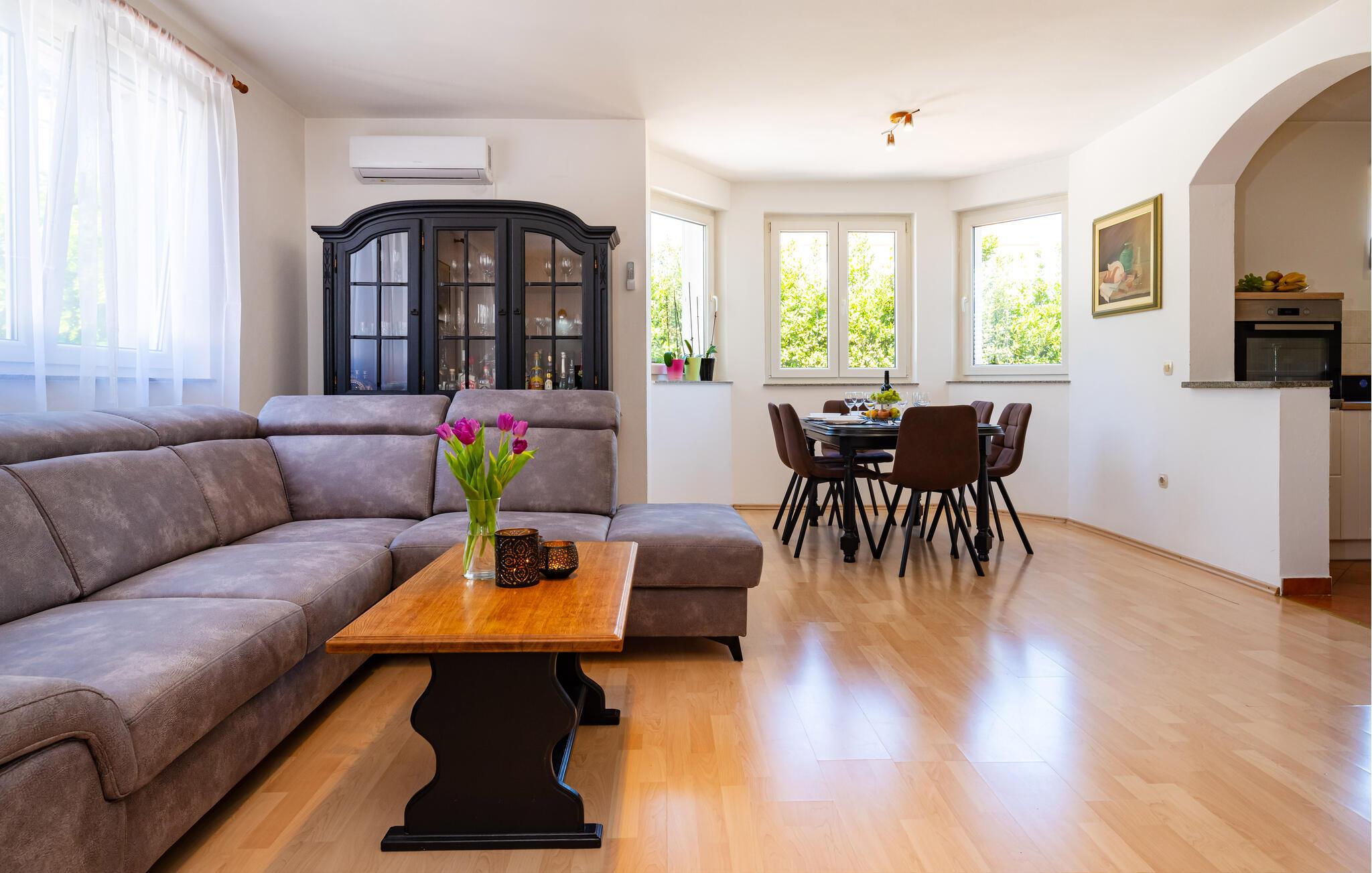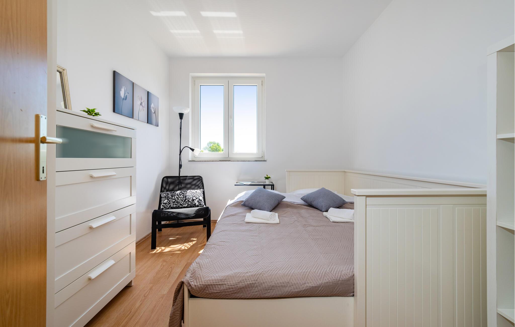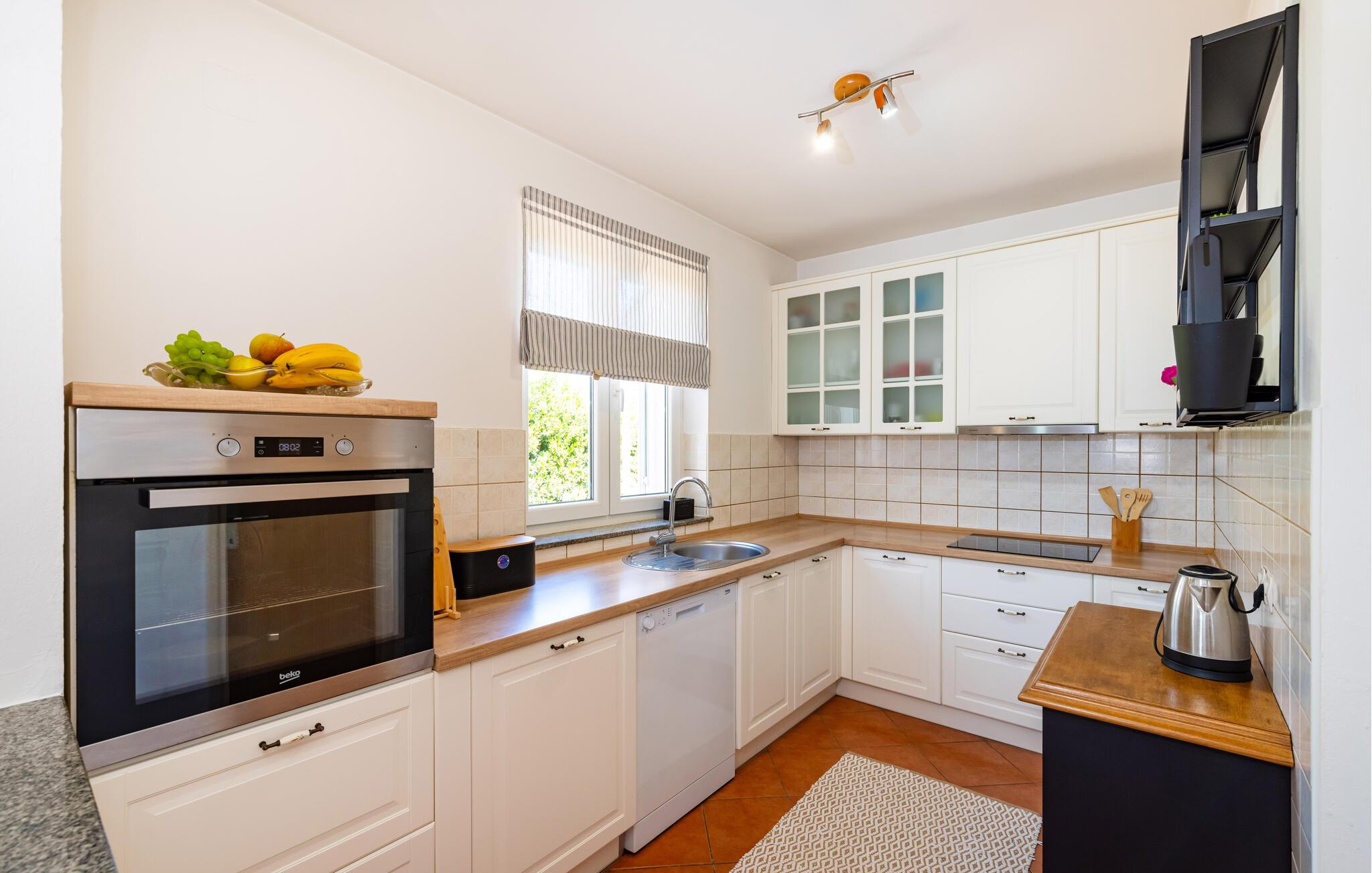 Inmitten der ruhigen Landschaft von Brisevo erwartet Sie dieses stilvolle Ferienhaus mit einem großzügigen Außenbereich und einem herrlichen Pool. Die moderne Einrichtung kombiniert klare Linien mit warmen Akzenten und sorgt für eine gemütliche Atmosphäre. Die offene Küche ist bestens ausgestattet und lädt Sie zu geselligen Abenden mit Ihren Liebsten ein. Im Wohnbereich genießen Sie Komfort und Eleganz, während die Schlafzimmer Ihnen erholsame Nächte versprechen. Besonders einladend ist die große überdachte Terrasse mit Blick auf den Pool – der perfekte Ort, um den Tag entspannt ausklingen zu lassen.