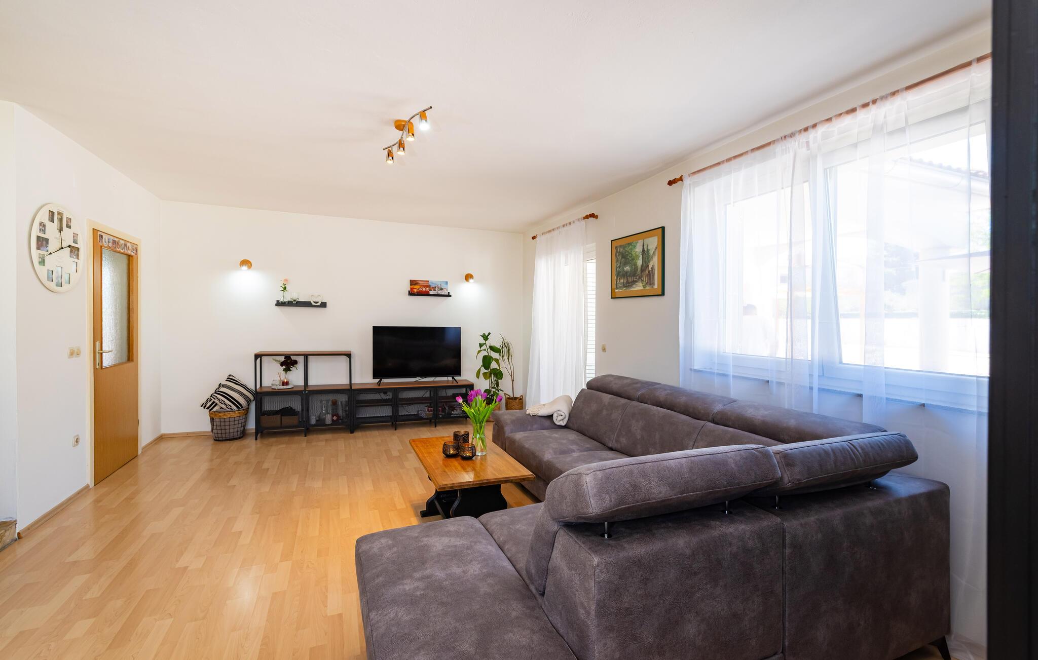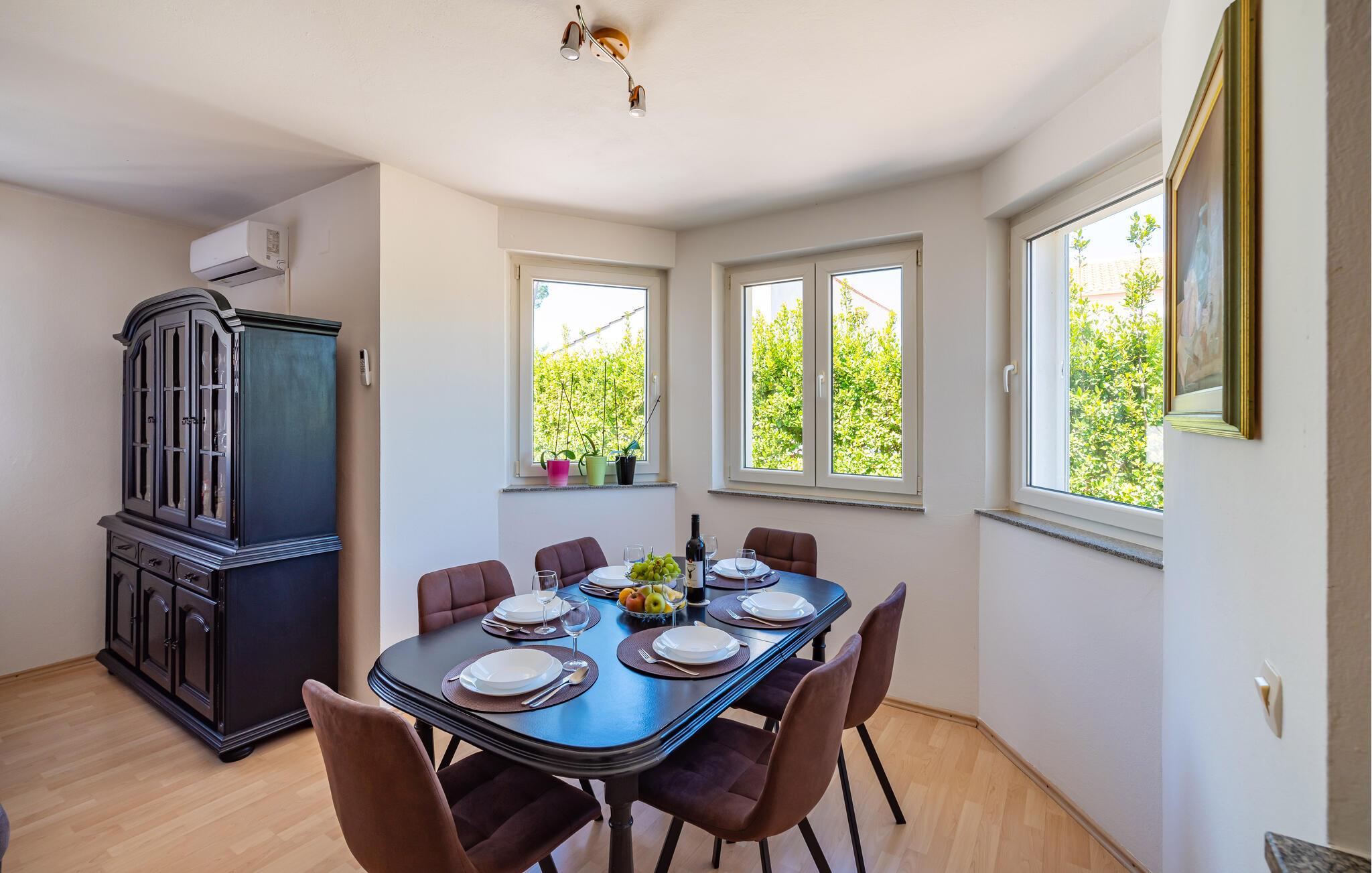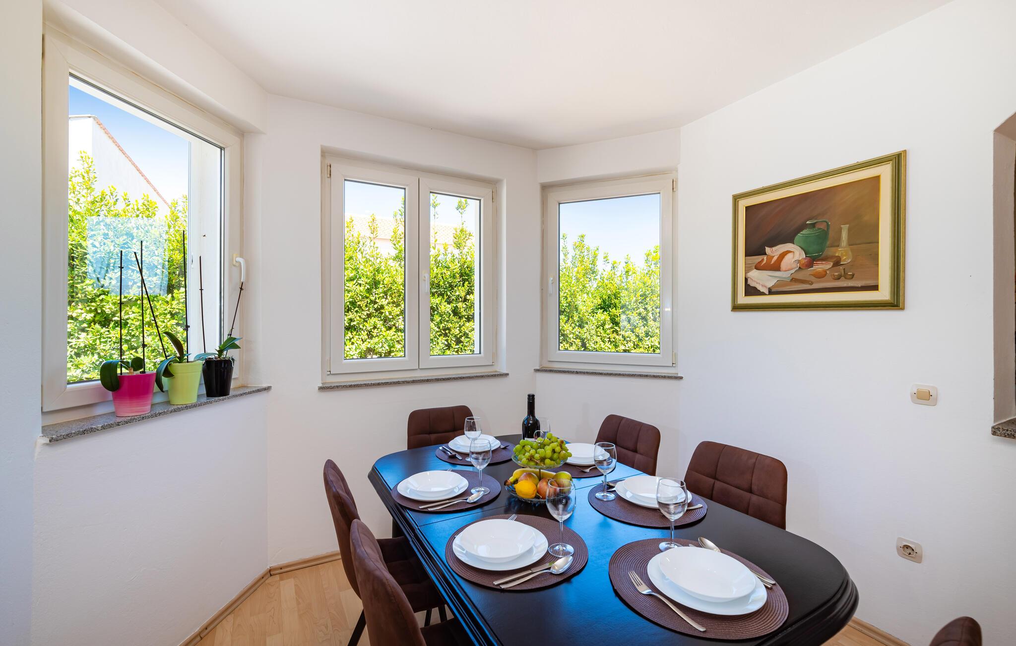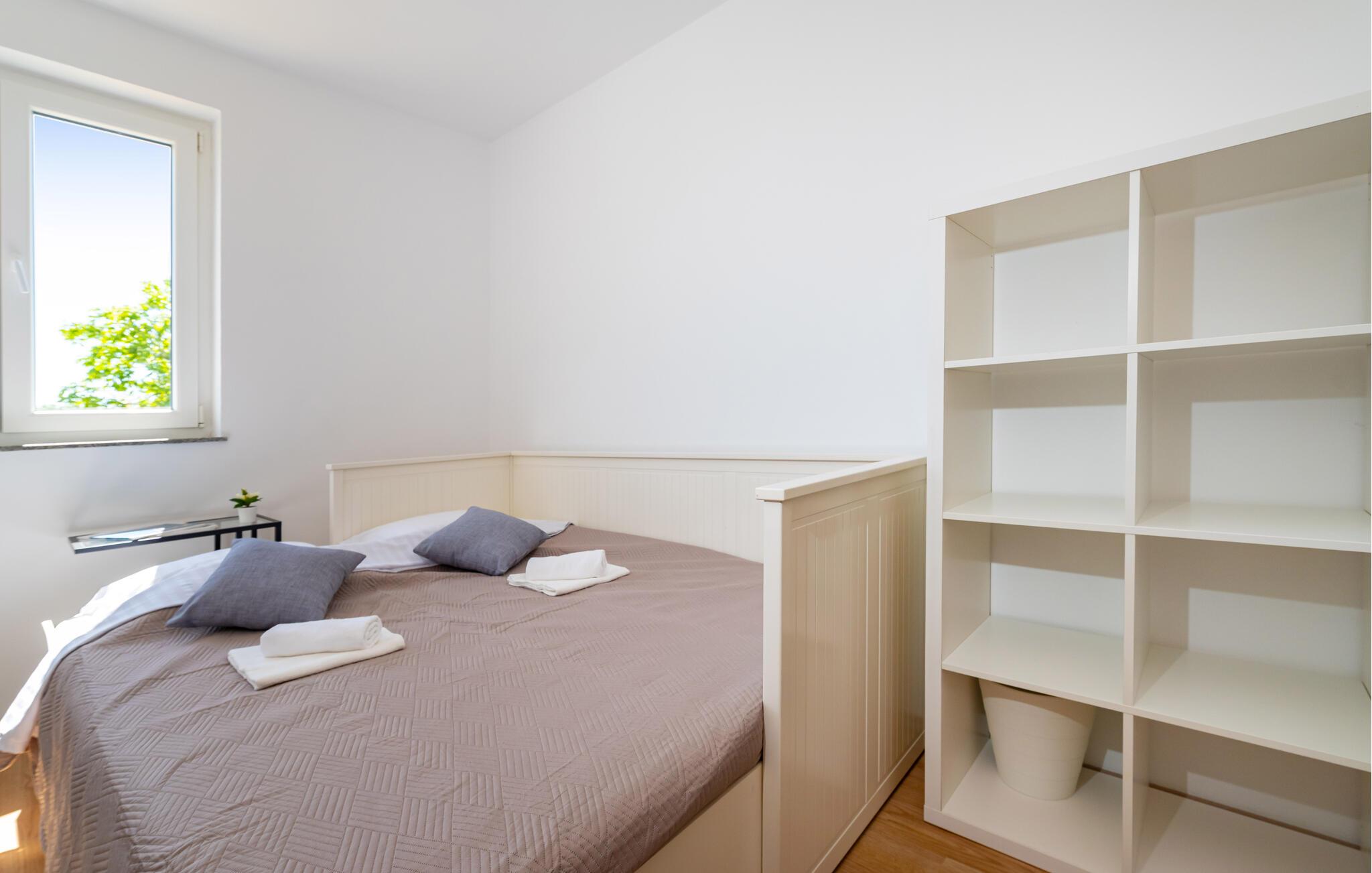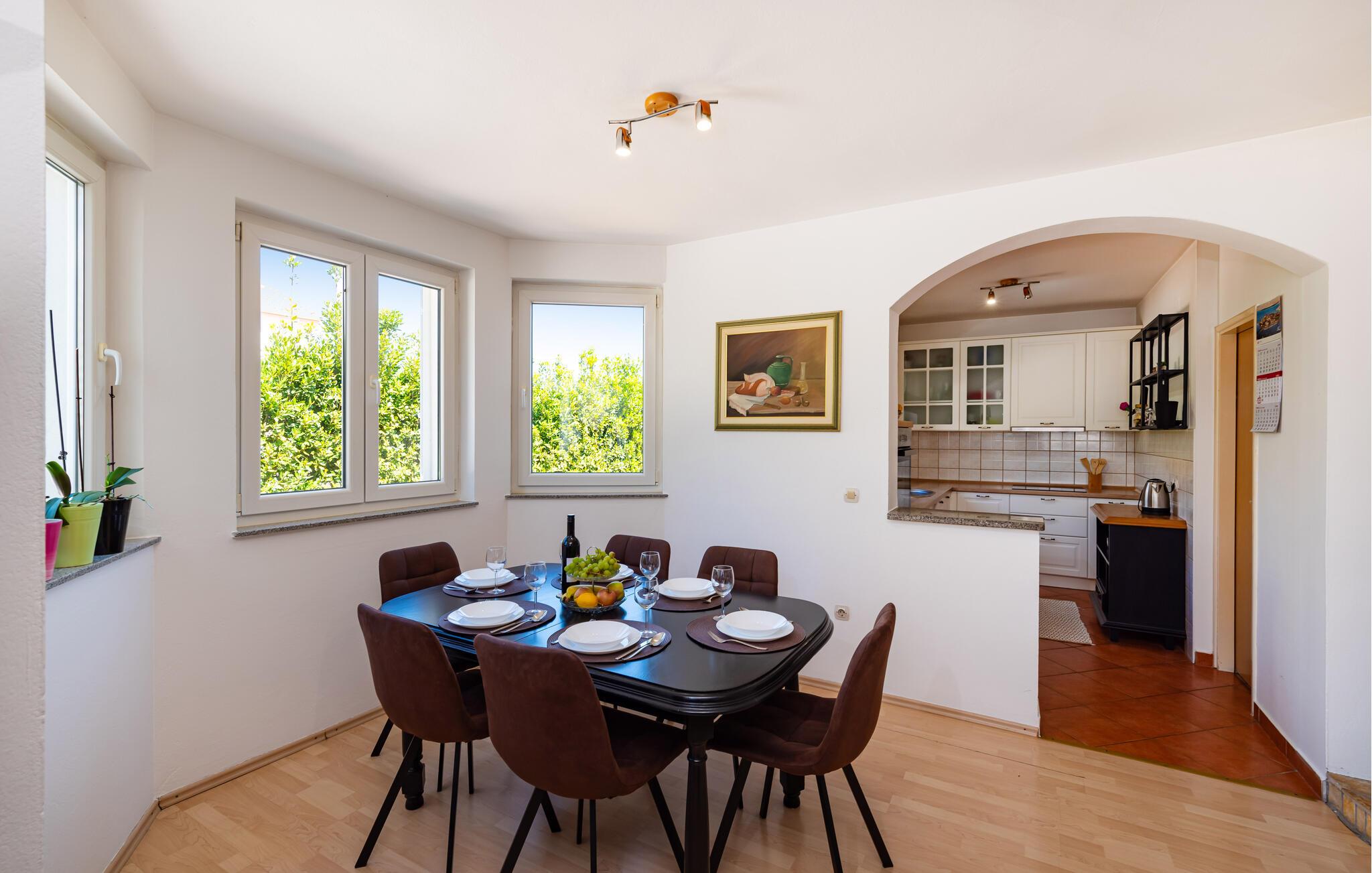 Inmitten der ruhigen Landschaft von Brisevo erwartet Sie dieses stilvolle Ferienhaus mit einem großzügigen Außenbereich und einem herrlichen Pool. Die moderne Einrichtung kombiniert klare Linien mit warmen Akzenten und sorgt für eine gemütliche Atmosphäre. Die offene Küche ist bestens ausgestattet und lädt Sie zu geselligen Abenden mit Ihren Liebsten ein. Im Wohnbereich genießen Sie Komfort und Eleganz, während die Schlafzimmer Ihnen erholsame Nächte versprechen. Besonders einladend ist die große überdachte Terrasse mit Blick auf den Pool – der perfekte Ort, um den Tag entspannt ausklingen zu lassen.