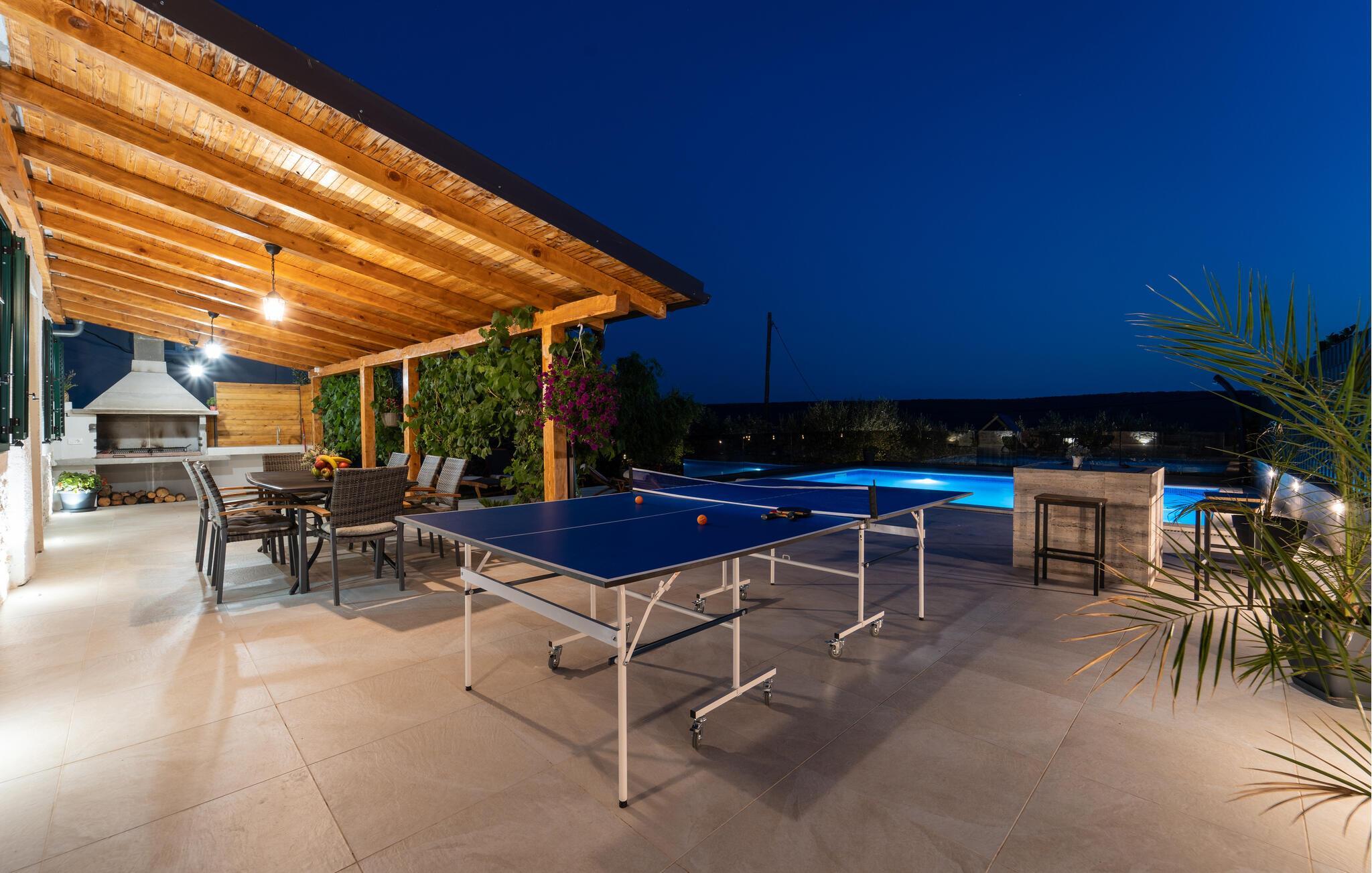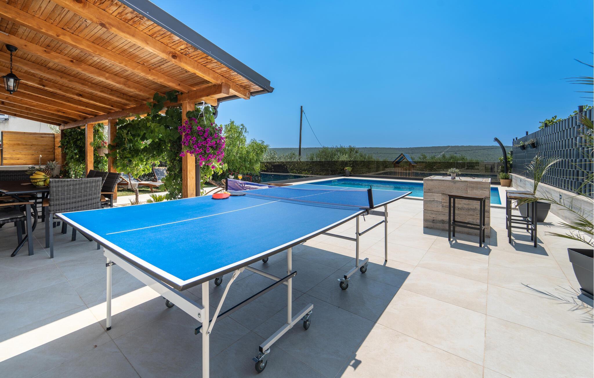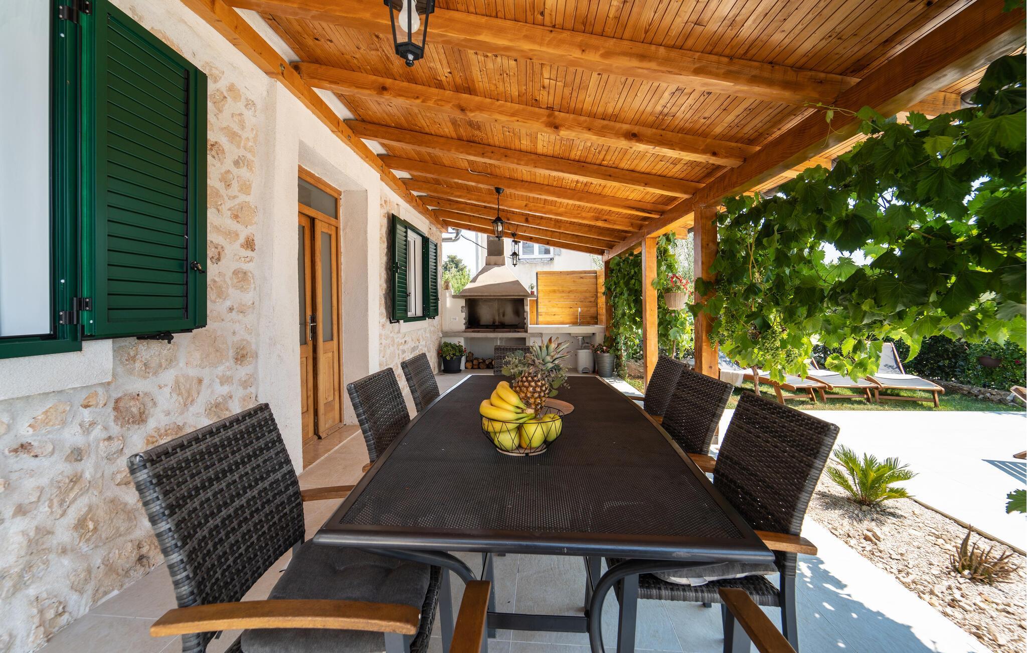 Die geräumige Veranda erweitert Ihren Wohnraum im Freien und lädt Sie zu Ihren Mahlzeiten unter dem Dach ein. Lesen Sie hier auch ein Buch, während Ihre Kinder im Pool baden und spielen oder sonnen sich am Beckenrand mit Blick auf die umliegende Landschaft.