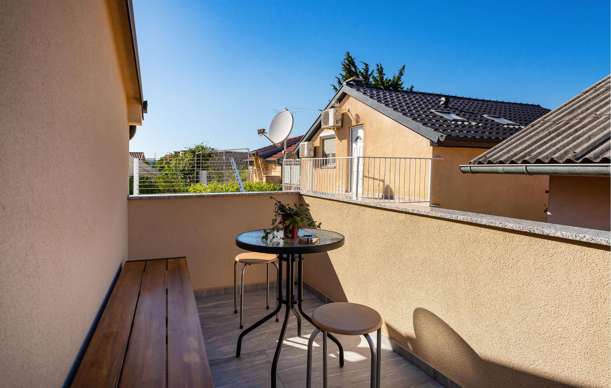 Treten Sie hinaus auf den Balkon und starten Sie mit einem Frühstück an der frischen Luft in den Tag. Verweilen Sie auf der Sitzbank oder an einem der kleinen Bistrotische. Das Haus ist umgeben von ruhigen Straßen und gepflegten Nachbargrundstücken und vermittelt ein angenehmes, sicheres Wohngefühl.