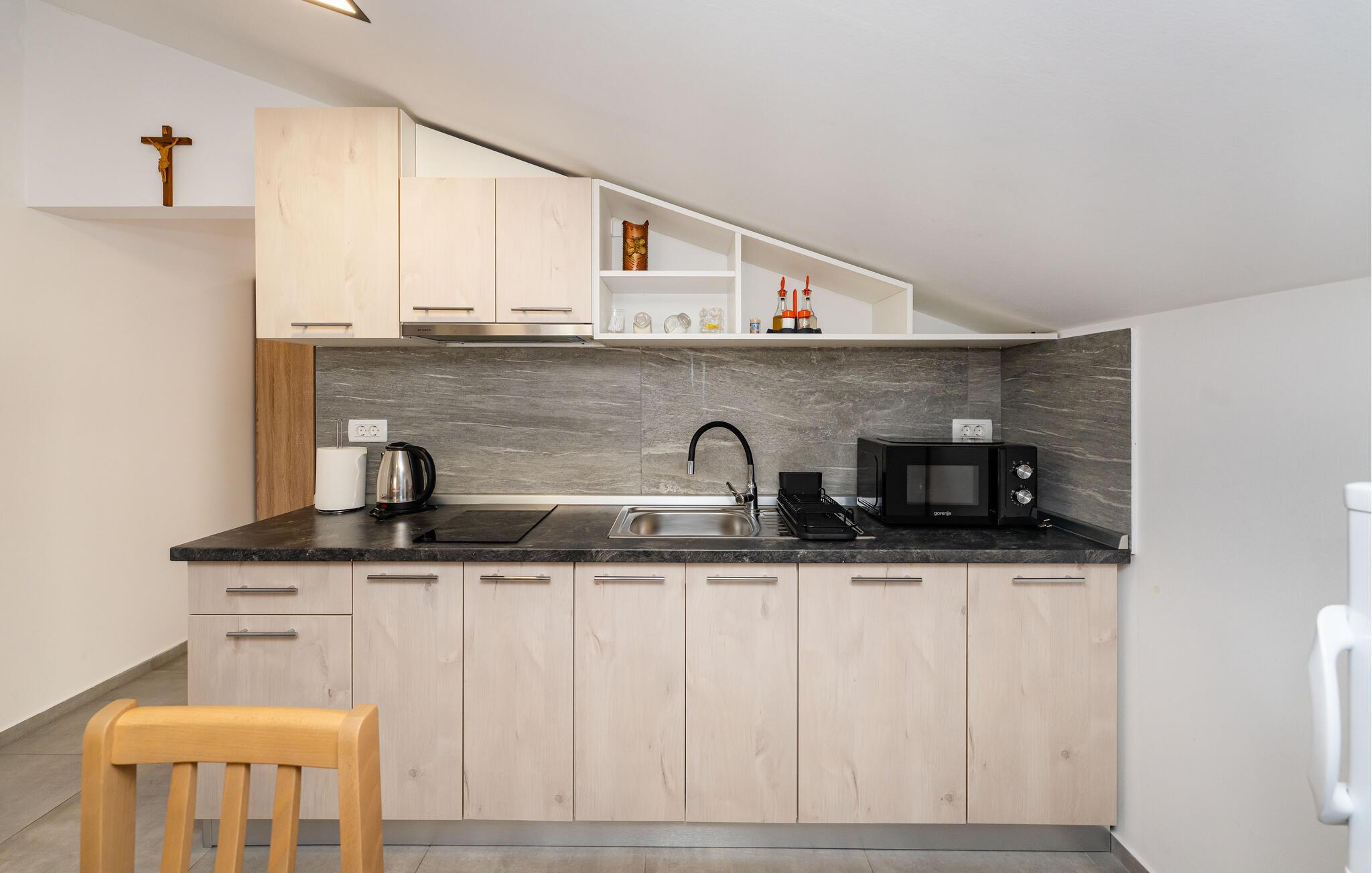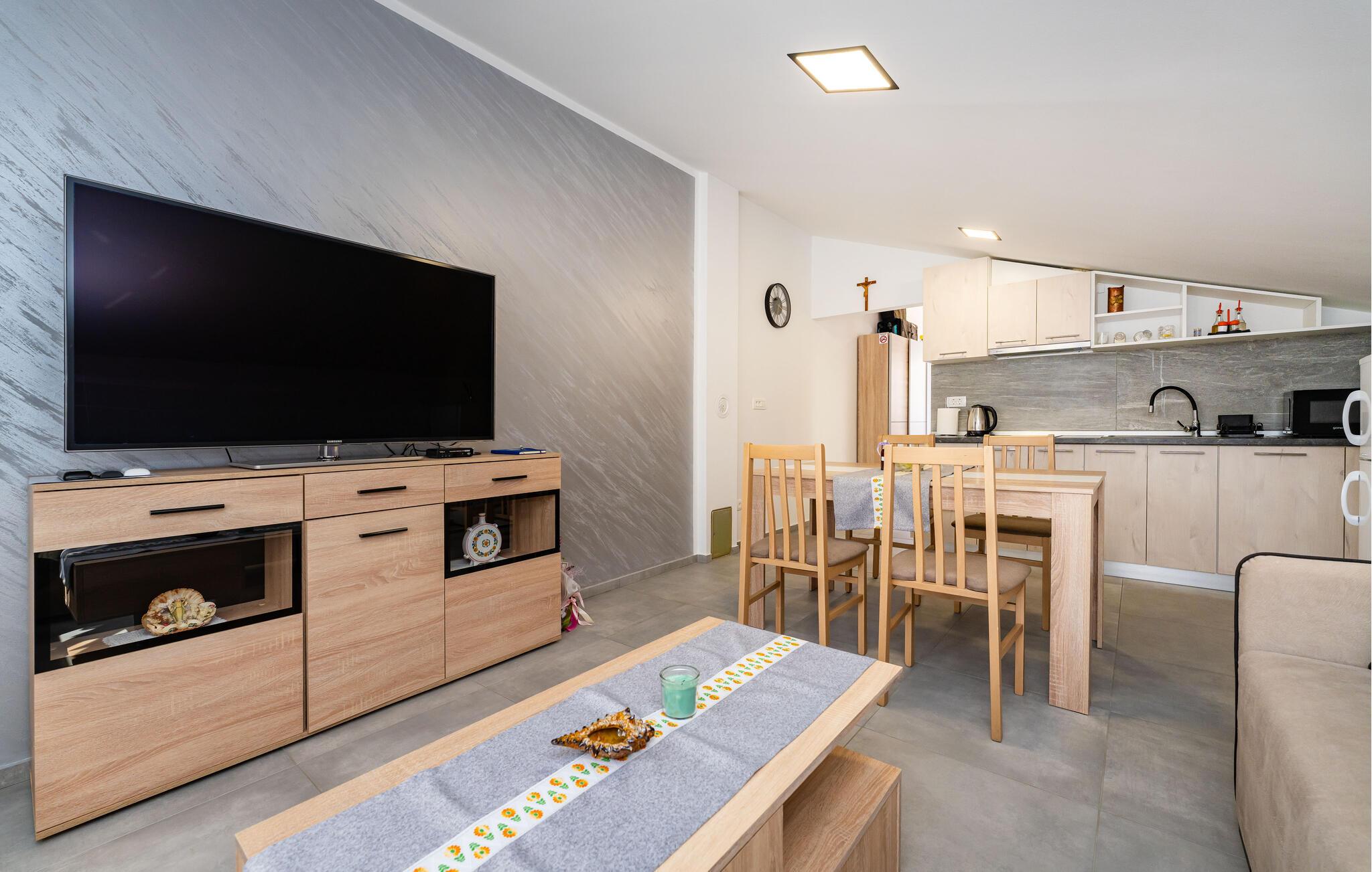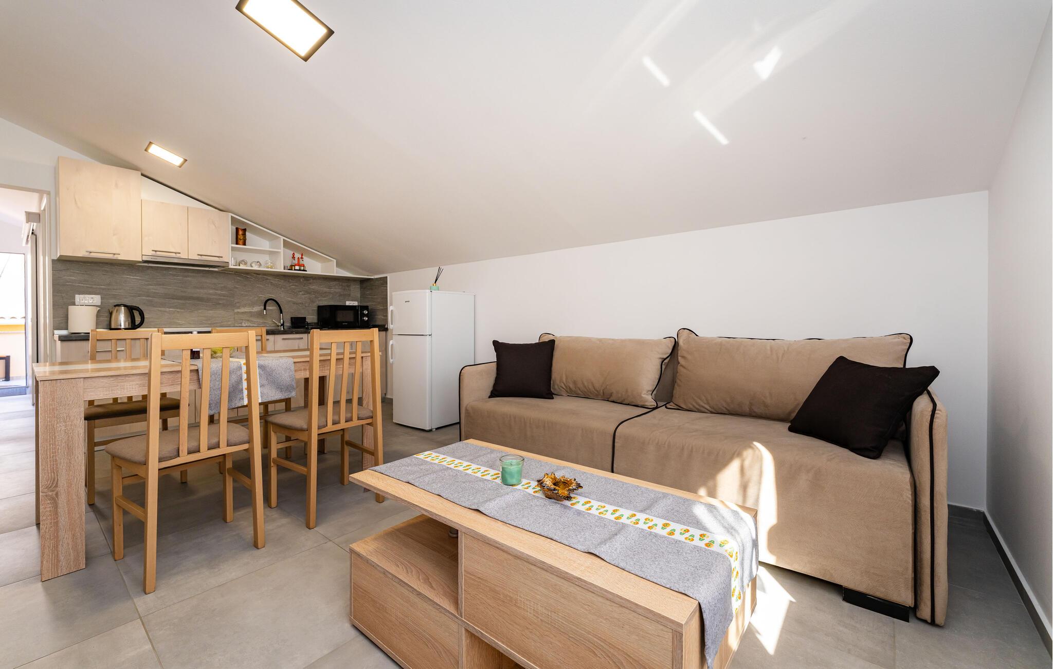 Die ruhige Wohnlage in Strandnähe und die durchdachte Ausstattung machen diese Ferienwohnung zur idealen Wahl für einen unbeschwerten Aufenthalt. Freuen Sie sich auf eine helle Wohnung mit offener Wohnküche, gemütlicher Sitzecke und TV. Nutzen Sie die kompakte Küchenzeile, um Ihre Urlaubsmahlzeiten zuzubereiten. Der Esstisch bietet Platz für zum Genießen Ihrer kulinarischen Kreationen, das Sofa lädt zum Entspannen ein.