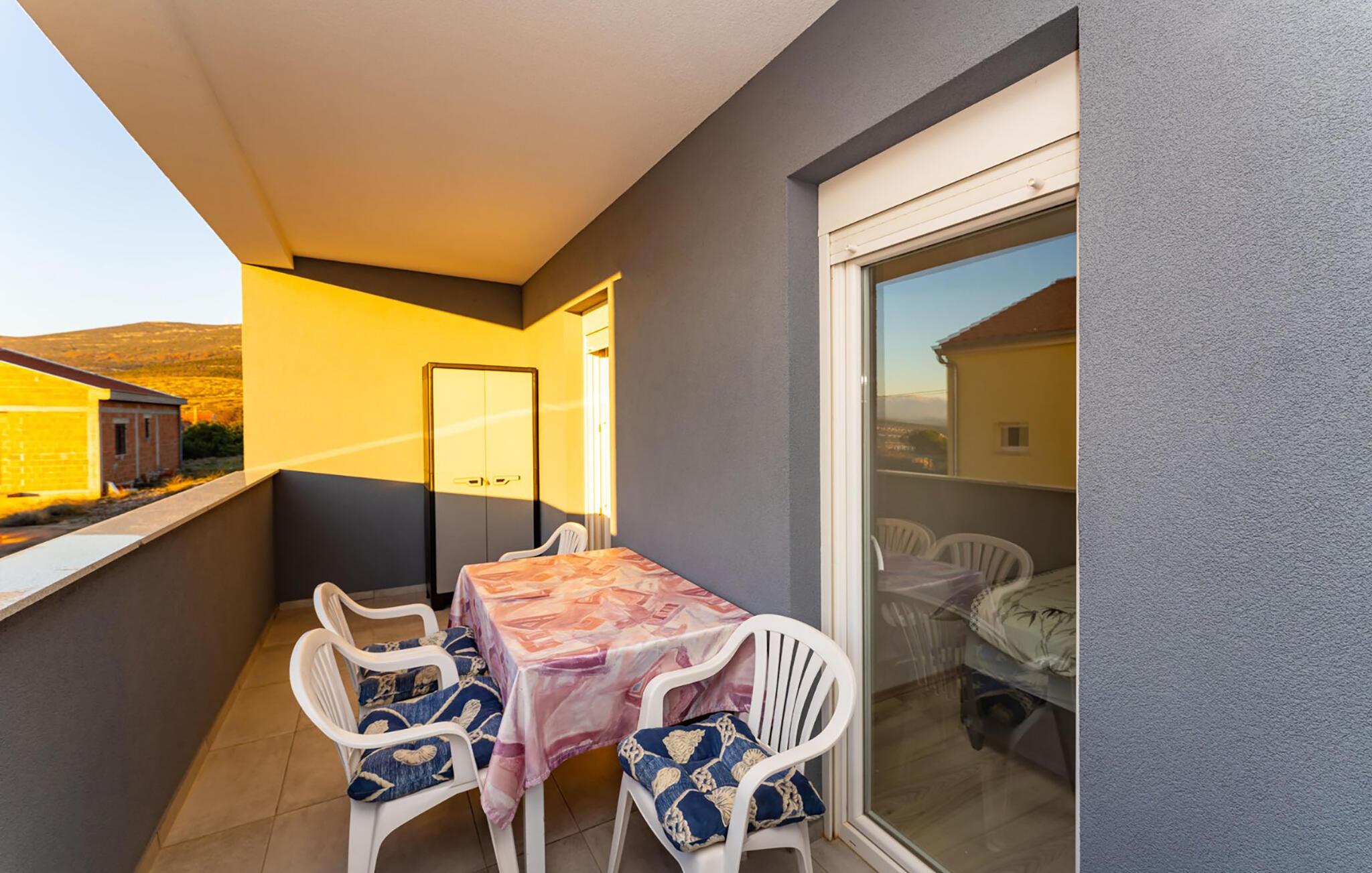 Gehen Sie auf den Balkon und starten Sie mit einem Kaffee im Freien in den Tag. Machen Sie es sich am Balkontisch bequem und lassen Sie den Blick über die Dächer Ihres Urlaubsortes bis zum Glitzern des Meeres am Horizont schweifen. Das gepflegte Wohnumfeld mit ruhigen Straßen sorgt für eine angenehme Atmosphäre und lädt zum Verweilen ein.