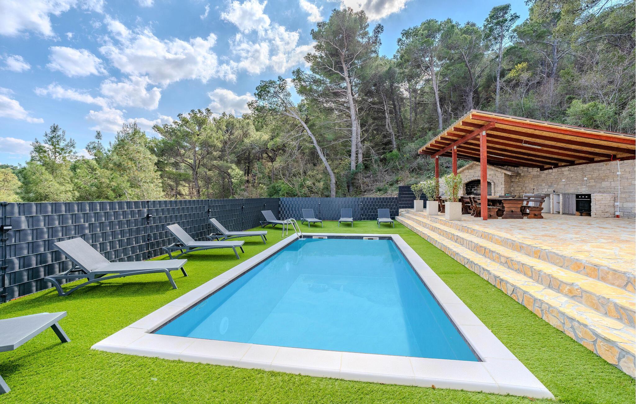Genießen Sie einen wunderbaren Meerblick von der Terrasse dieses Ferienhauses mit Pool.