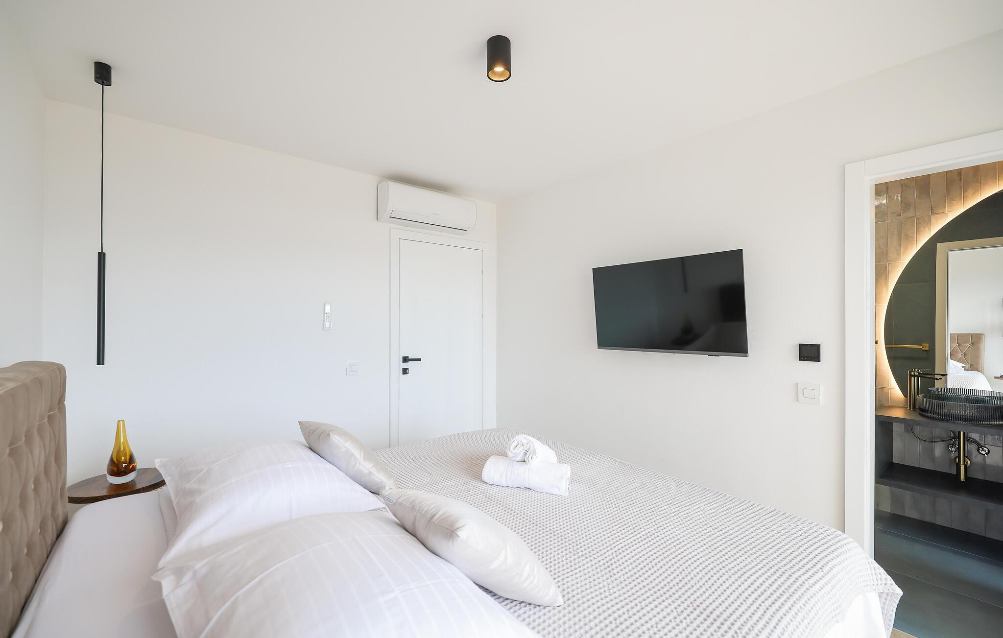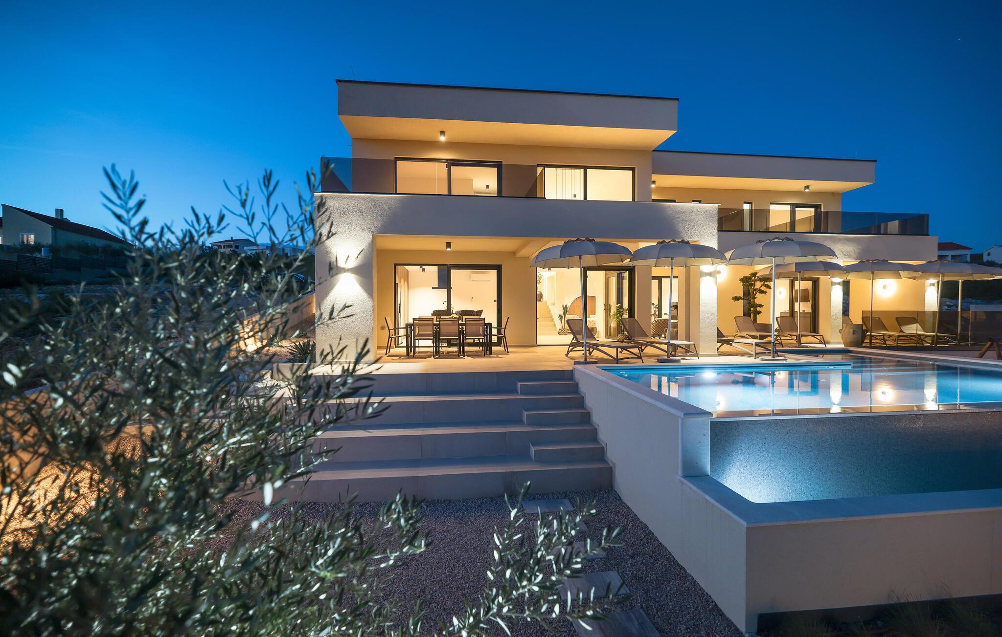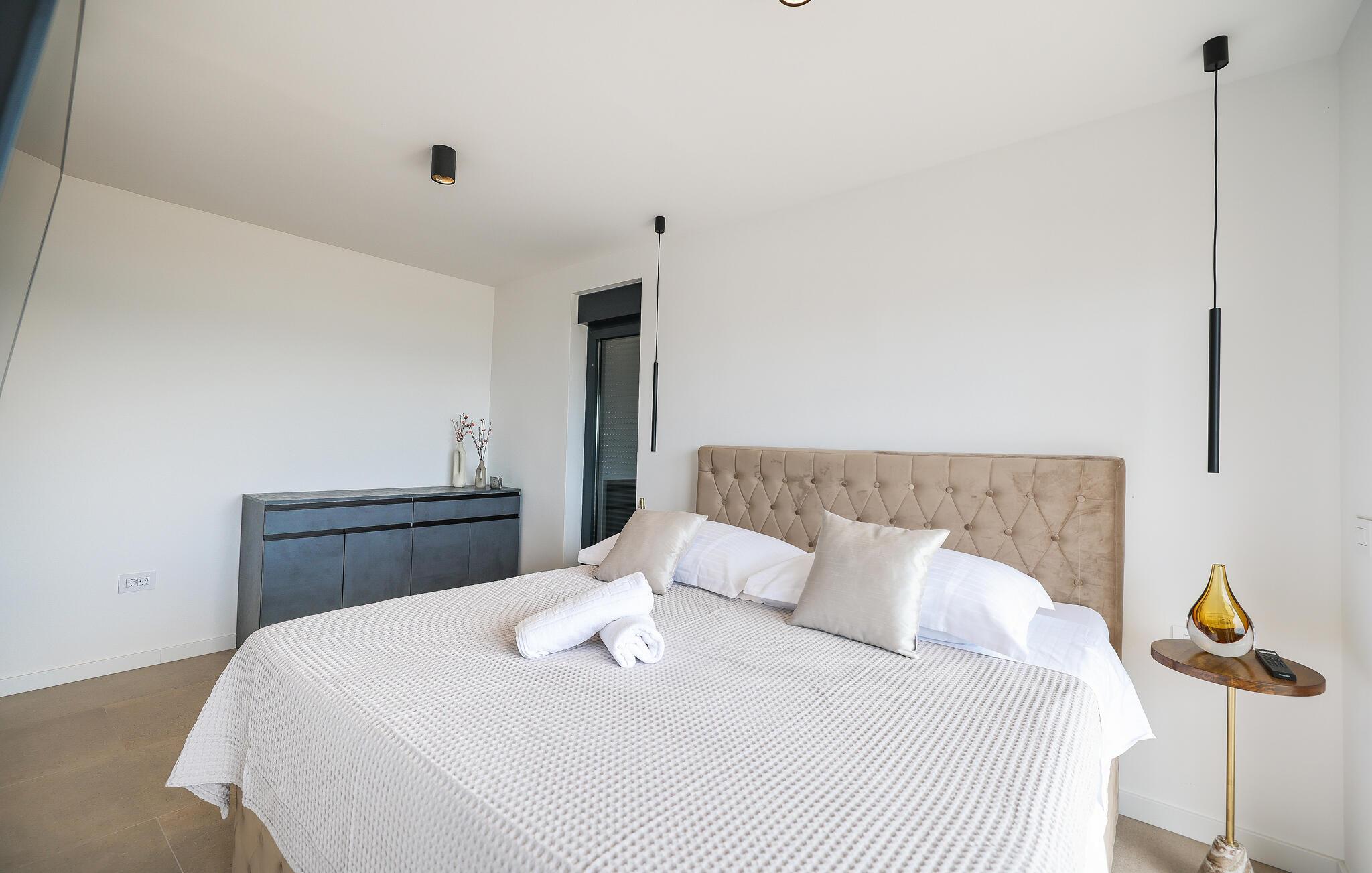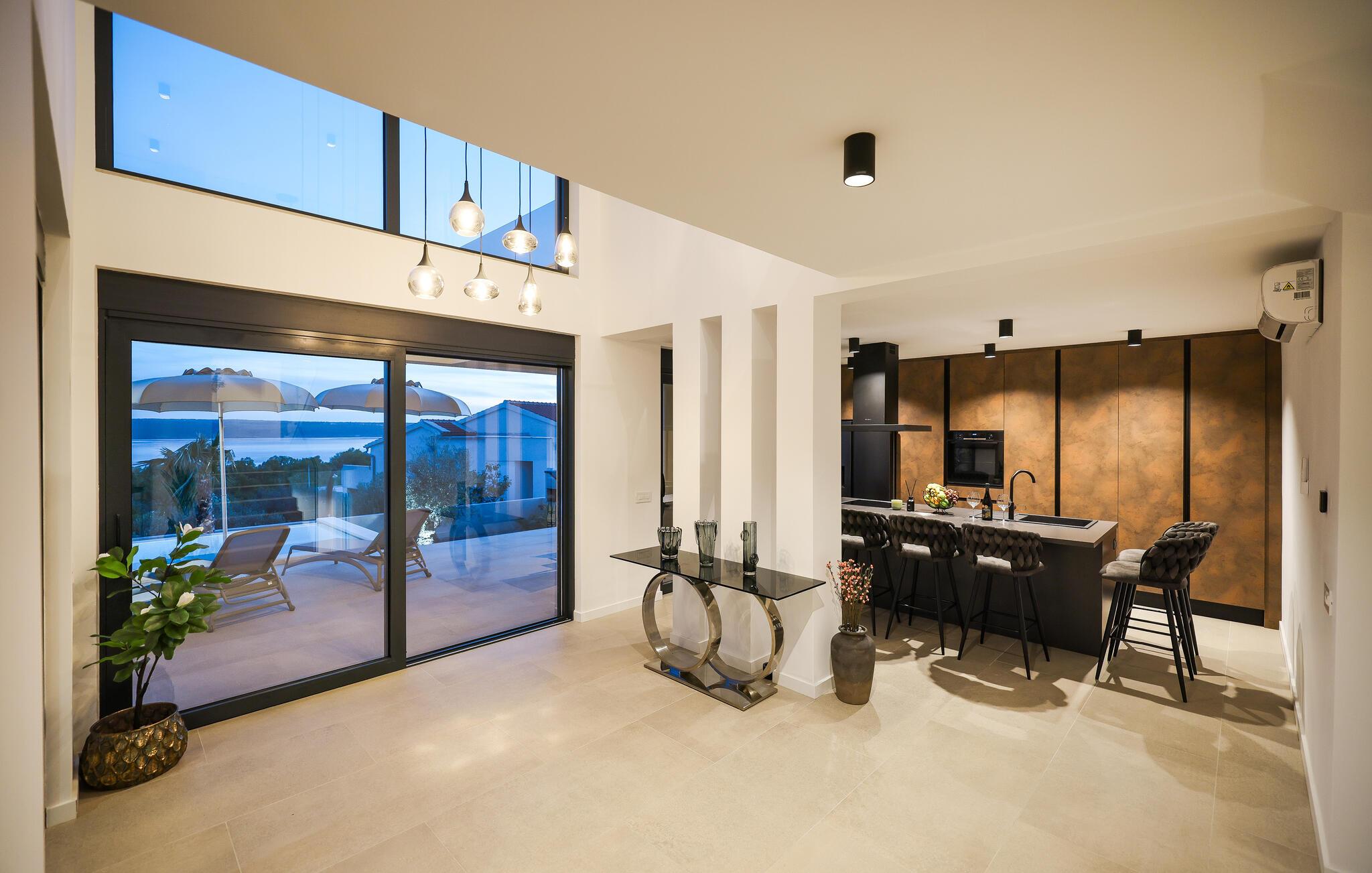 In diesem exquisiten Ferienhaus in Maslenica erleben Sie luxuriösen Komfort und elegantes Design. Die Innenräume sind mit hochwertigen Möbelstücken stilvoll eingerichtet, die ein Gefühl von Raffinesse und Wohlbehagen vermitteln. Verweilen Sie in den wunderschönen Räumen, kommen zur Ruhe oder zaubern in der großartig ausgestatteten, modernen Küche.