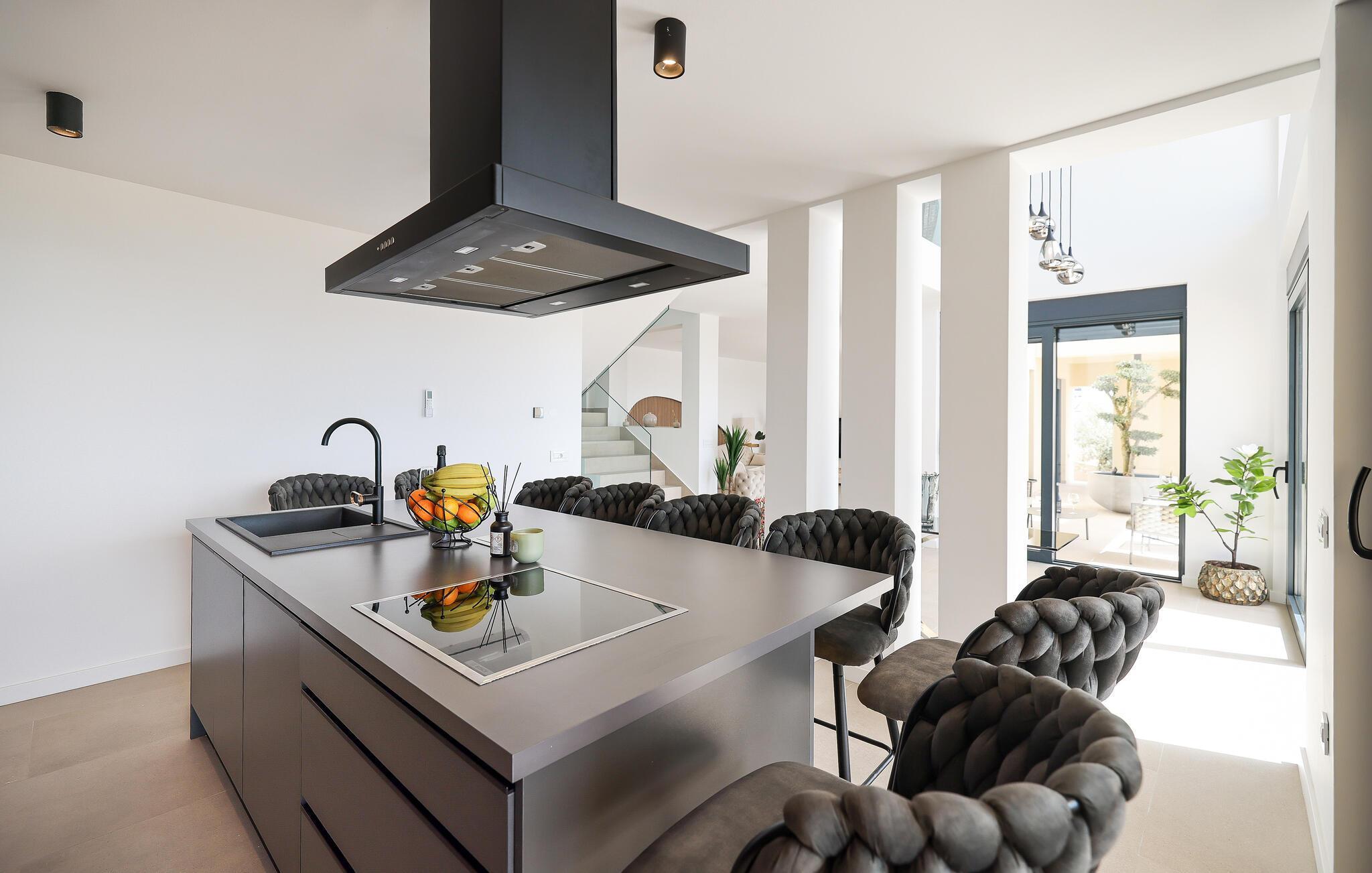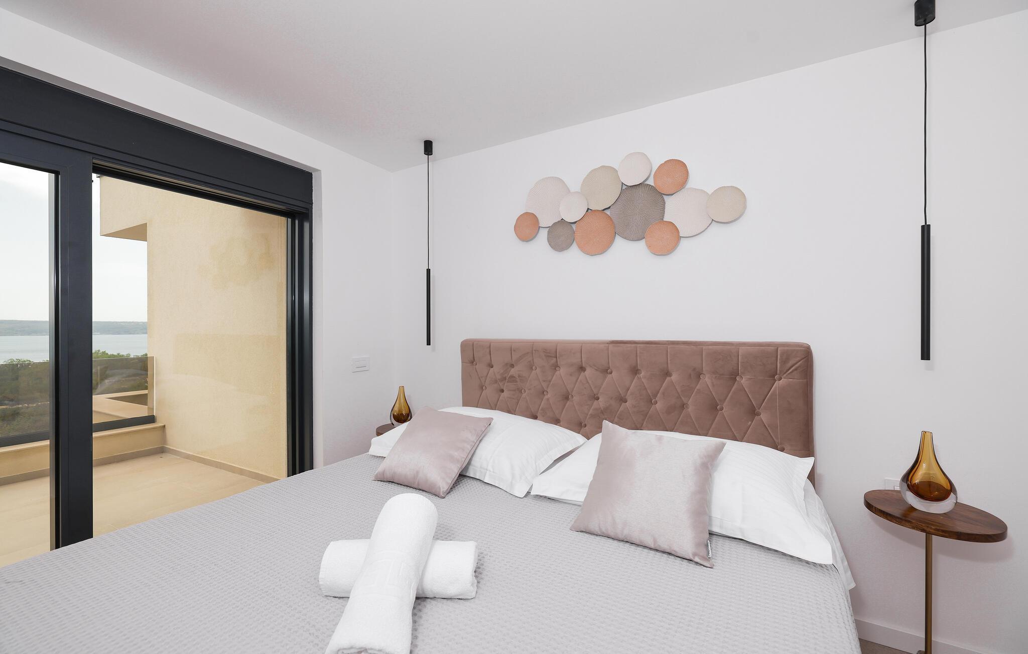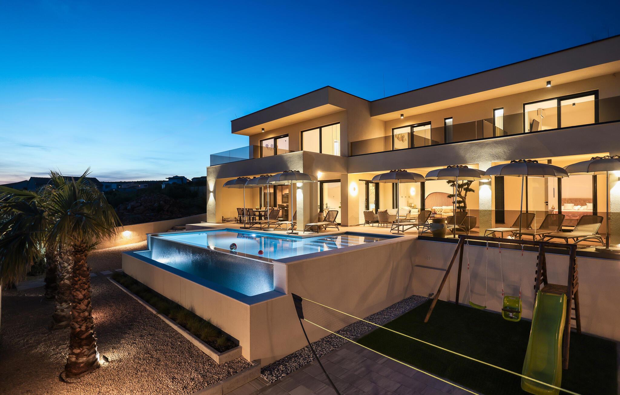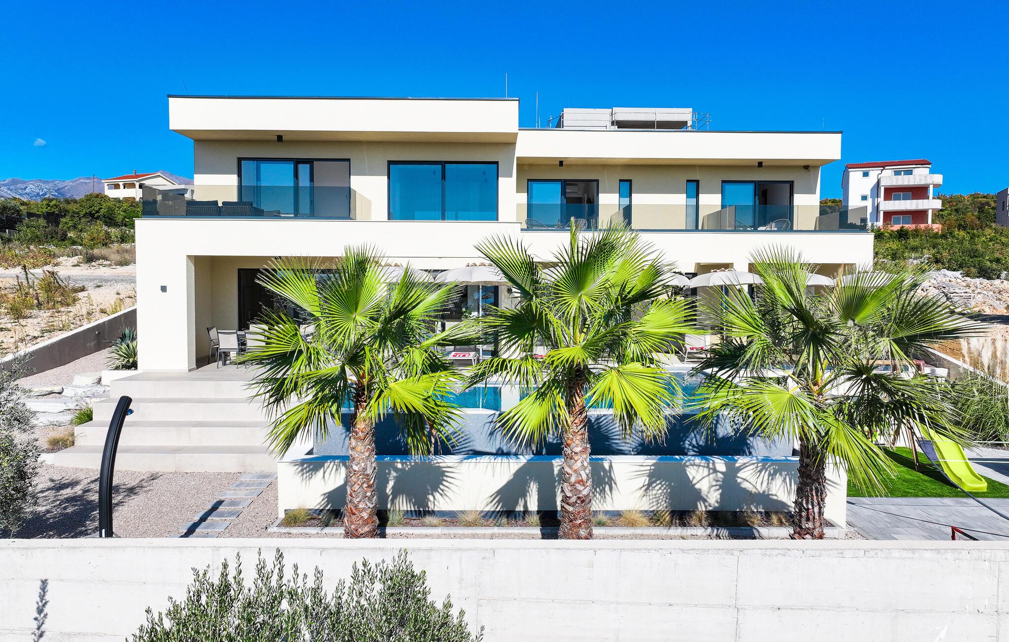 In diesem exquisiten Ferienhaus in Maslenica erleben Sie luxuriösen Komfort und elegantes Design. Die Innenräume sind mit hochwertigen Möbelstücken stilvoll eingerichtet, die ein Gefühl von Raffinesse und Wohlbehagen vermitteln. Verweilen Sie in den wunderschönen Räumen, kommen zur Ruhe oder zaubern in der großartig ausgestatteten, modernen Küche.
