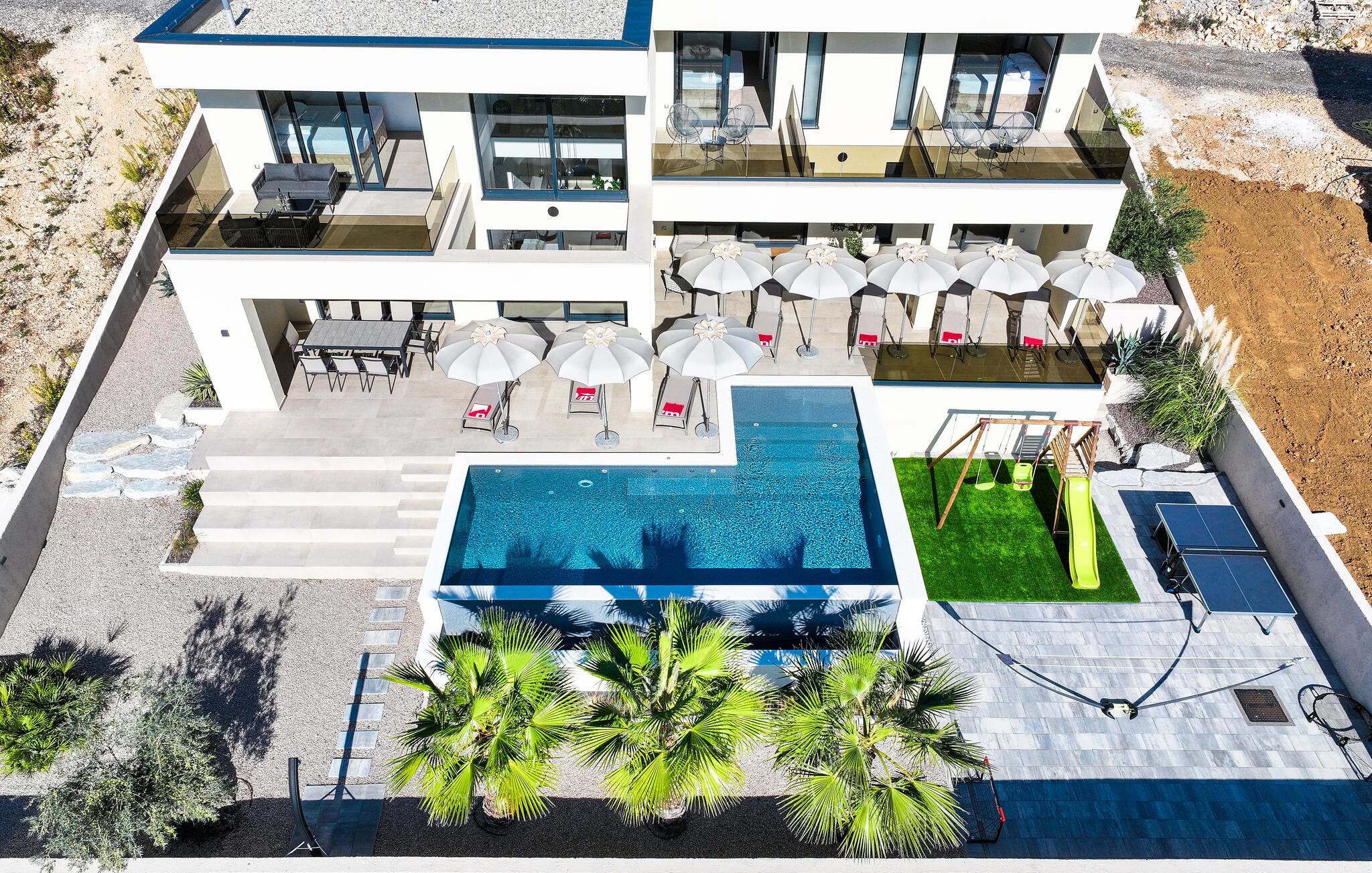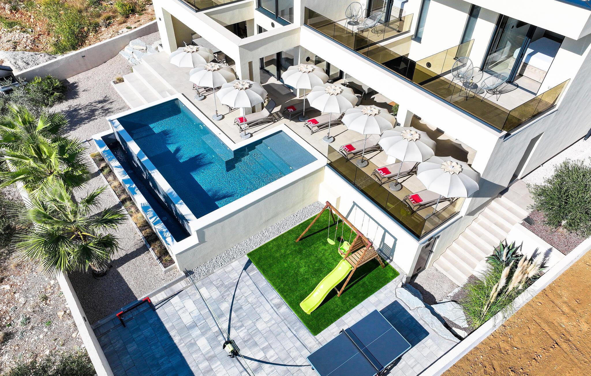 Genießen Sie den großzügigen Raum auf den Balkonen oder entspannen Sie auf der Panoramaterrasse mit Pool, die einen atemberaubenden Blick auf die Umgebung bietet. Der gepflegte Garten mit viel Platz zum Ballspielen sorgt für Spaß und Unterhaltung für die ganze Familie.