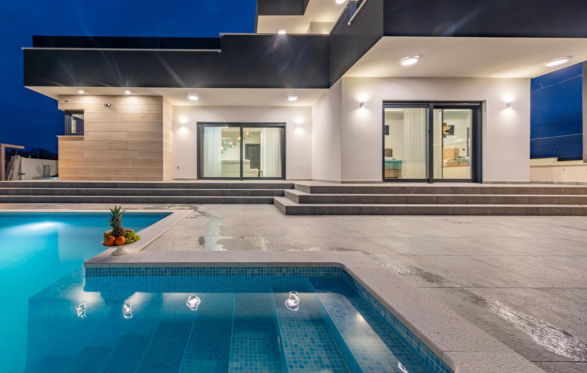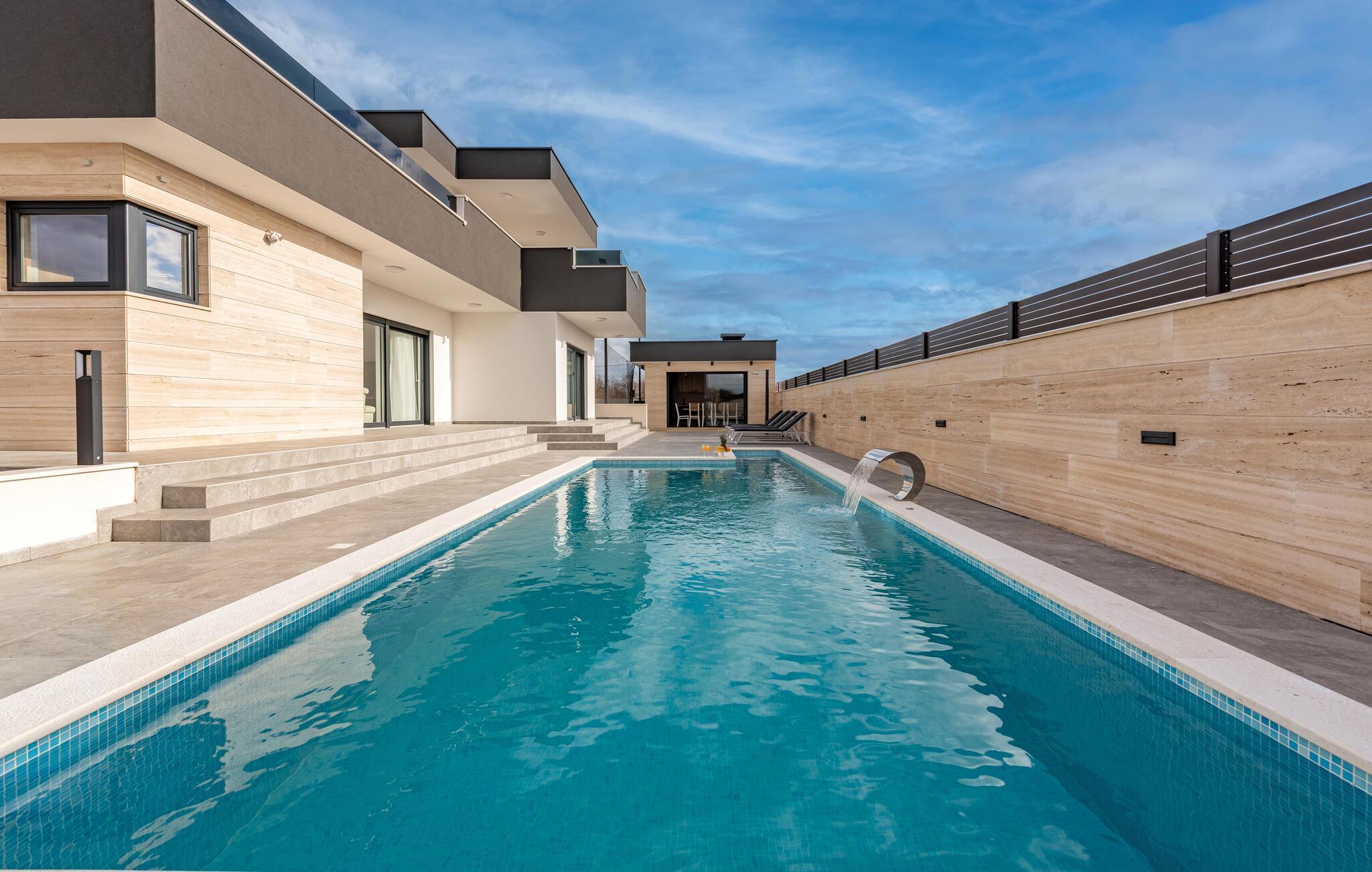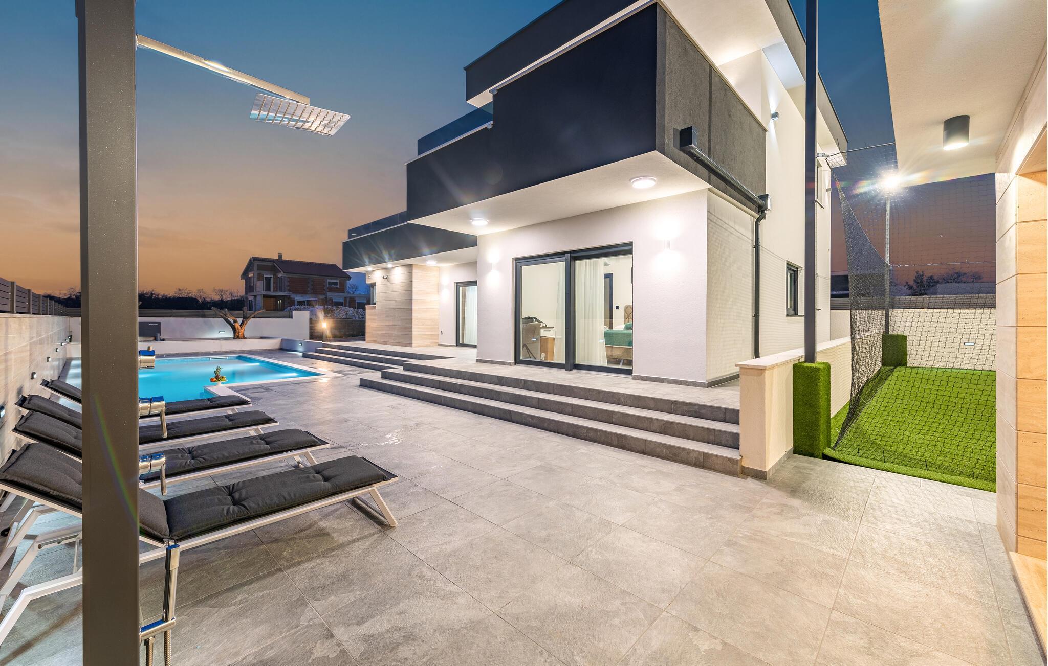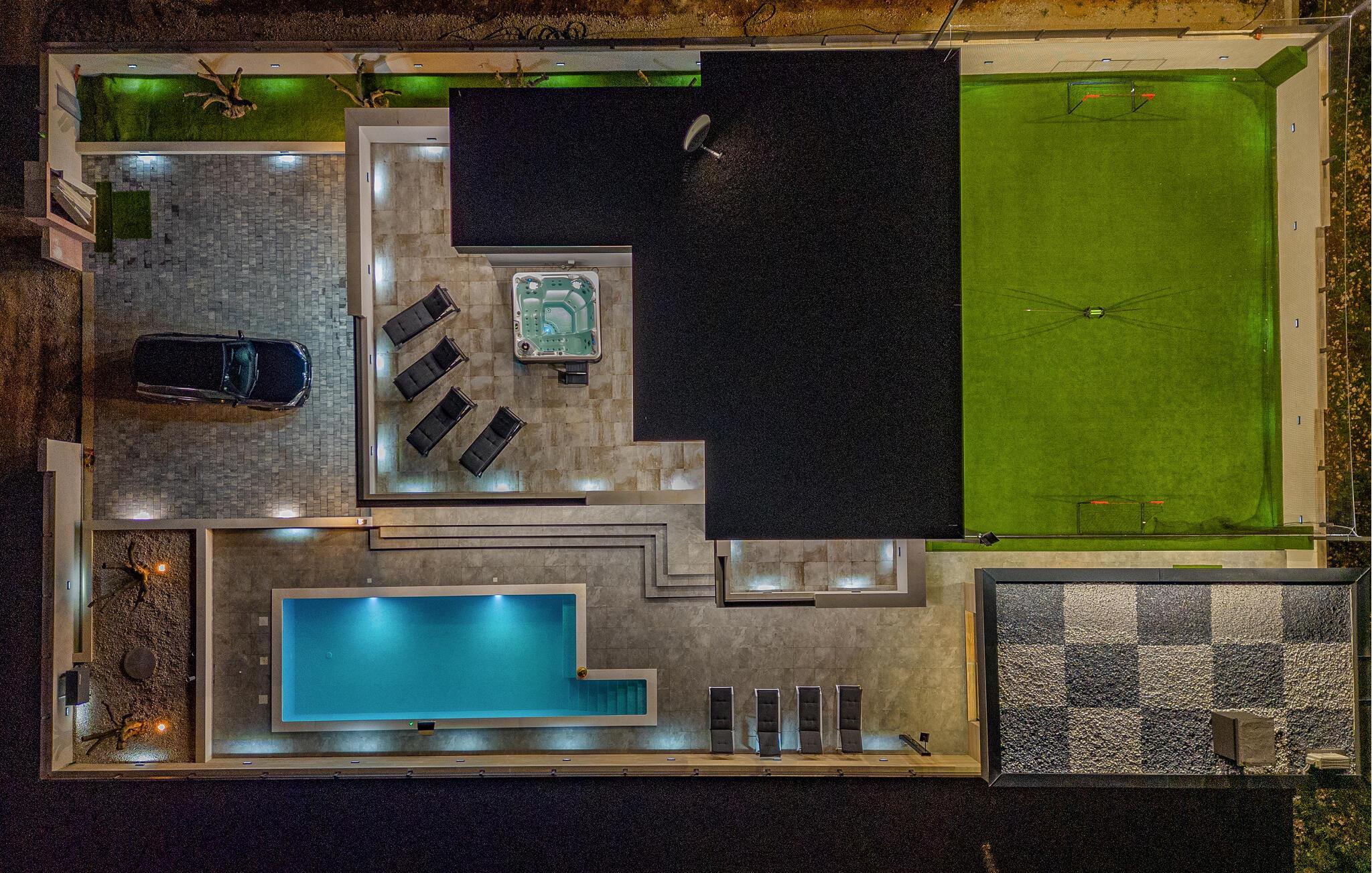Dieses geräumige und luxuriös anmutende Ferienhaus bietet Familien fantastische Urlaubserlebnisse. Freuen Sie sich auf die vielen Möglichkeiten, die Ihr Ferienhaus für Sie bereithält. Im beheizten Außenpool kommen kleine und große Wasserfreunde auf ihre Kosten. Und dank der großzügigen Außenbeleuchtung können Sie Ihren Pool auch abends nach Sonnenuntergang nutzen. Wenn Sie etwas Abwechslung wünschen, dann erwartet Sie auf der Terrasse im ersten Stock ein Whirlpool, der Entspannung pur verspricht. Genießen Sie von dort aus oder von den dort vorhandenen Sonnenliegen die Aussicht auf Ihre Urlaubsgegend. Auch sportliche Aktivitäten kommen hier nicht zu kurz. Auf dem direkt am Haus gelegenen Sportplatz können Sie mit Ihren Kindern sportliche Wettkämpfe in vielen verschiedenen Sportarten bestreiten. Ein ganz besonderes Highlight für alle Hobbyköche ist die Außenküche mit gemauertem Grill und Esstisch. Abends können Sie sich es bei einem gemeinsamen Filmabend auch in den Sitzgruppen gemütlich machen