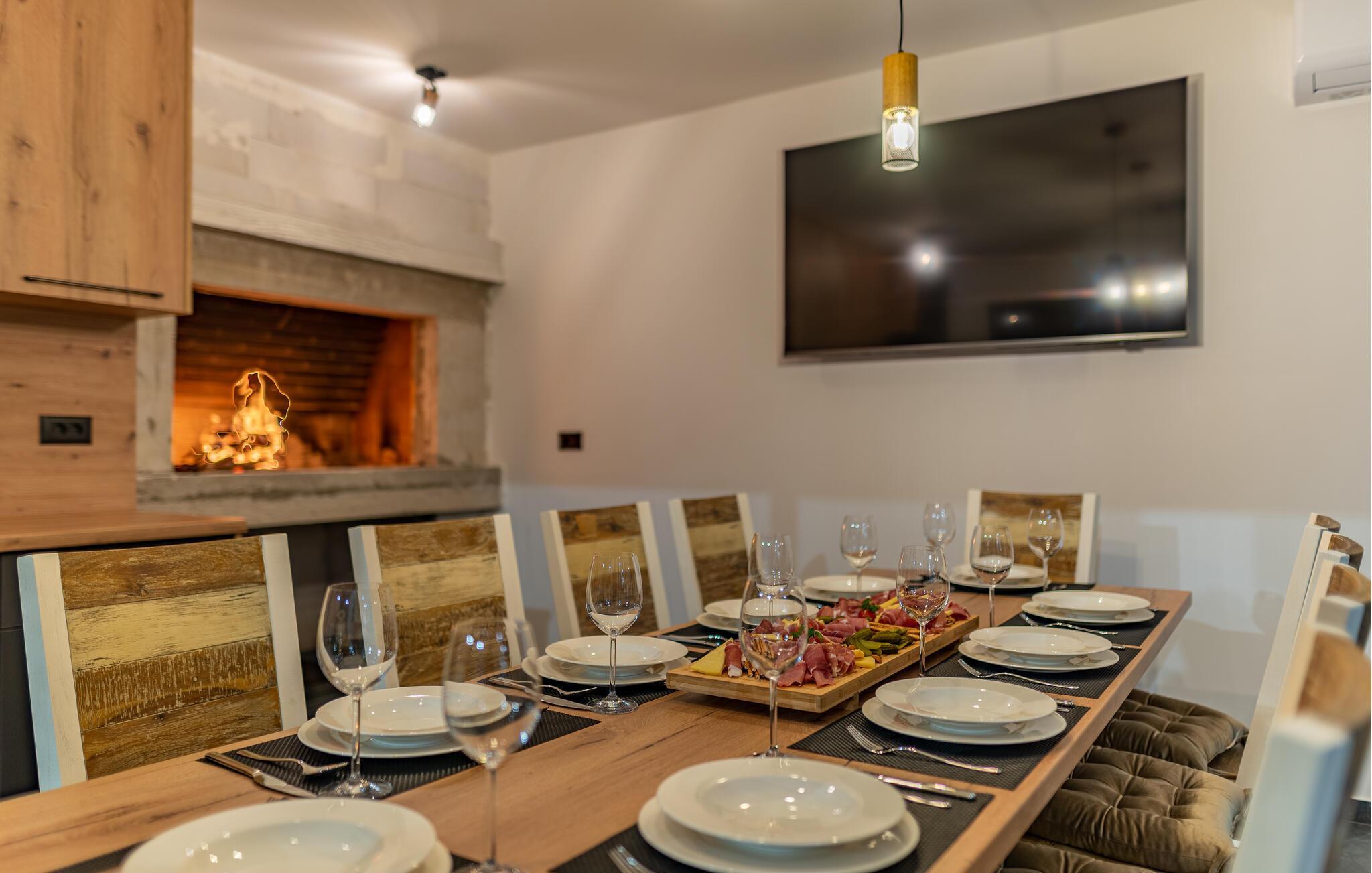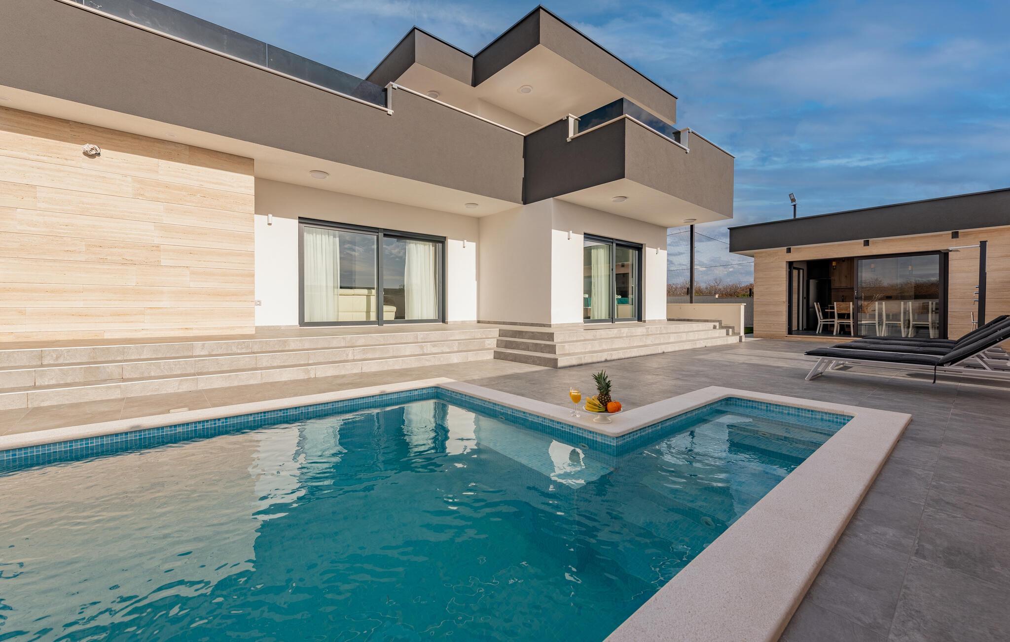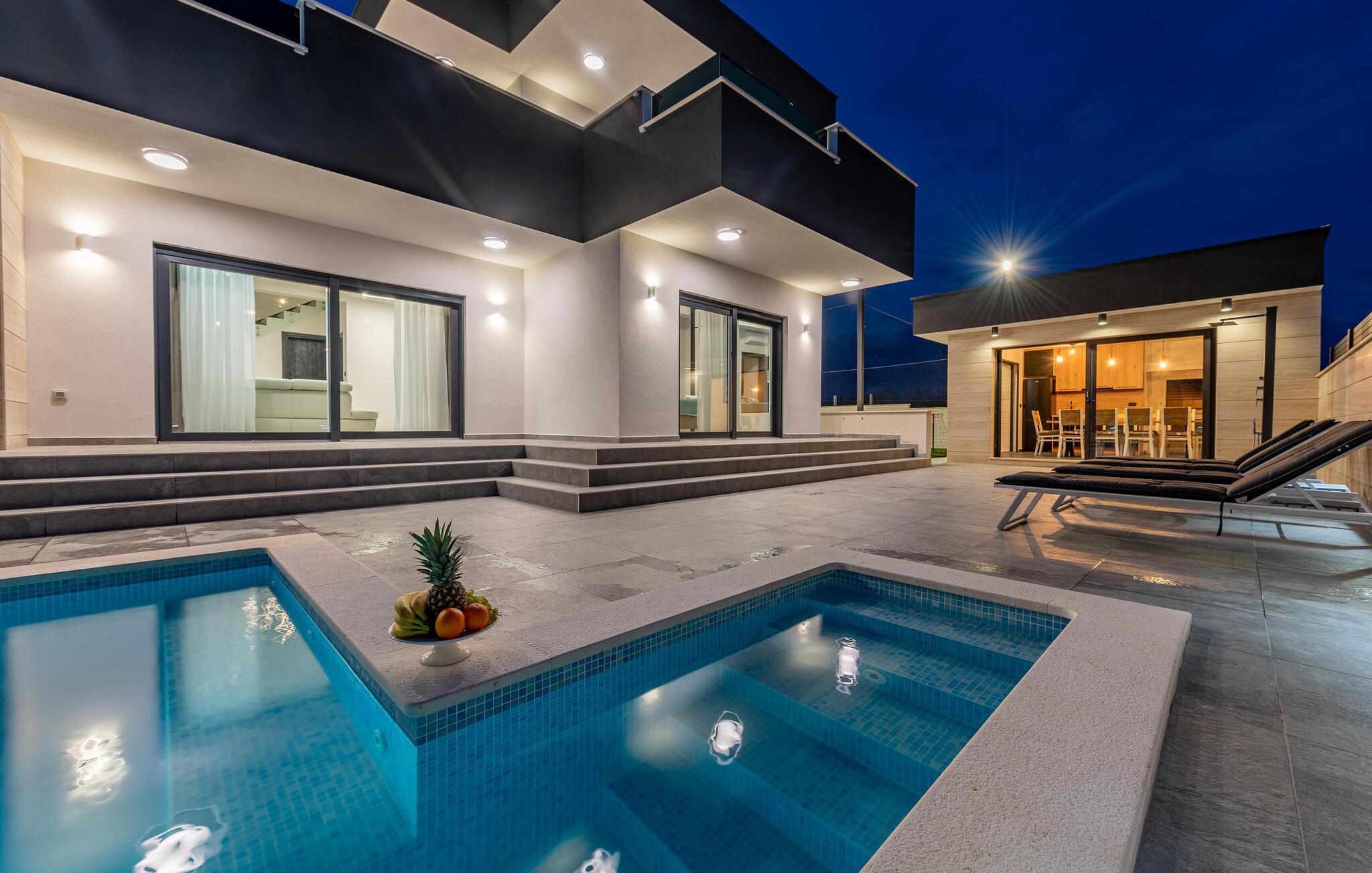 Dieses geräumige und luxuriös anmutende Ferienhaus bietet Familien fantastische Urlaubserlebnisse. Freuen Sie sich auf die vielen Möglichkeiten, die Ihr Ferienhaus für Sie bereithält. Im beheizten Außenpool kommen kleine und große Wasserfreunde auf ihre Kosten. Und dank der großzügigen Außenbeleuchtung können Sie Ihren Pool auch abends nach Sonnenuntergang nutzen. Wenn Sie etwas Abwechslung wünschen, dann erwartet Sie auf der Terrasse im ersten Stock ein Whirlpool, der Entspannung pur verspricht. Genießen Sie von dort aus oder von den dort vorhandenen Sonnenliegen die Aussicht auf Ihre Urlaubsgegend. Auch sportliche Aktivitäten kommen hier nicht zu kurz. Auf dem direkt am Haus gelegenen Sportplatz können Sie mit Ihren Kindern sportliche Wettkämpfe in vielen verschiedenen Sportarten bestreiten. Ein ganz besonderes Highlight für alle Hobbyköche ist die Außenküche mit gemauertem Grill und Esstisch. Abends können Sie sich es bei einem gemeinsamen Filmabend auch in den Sitzgruppen gemütlich machen