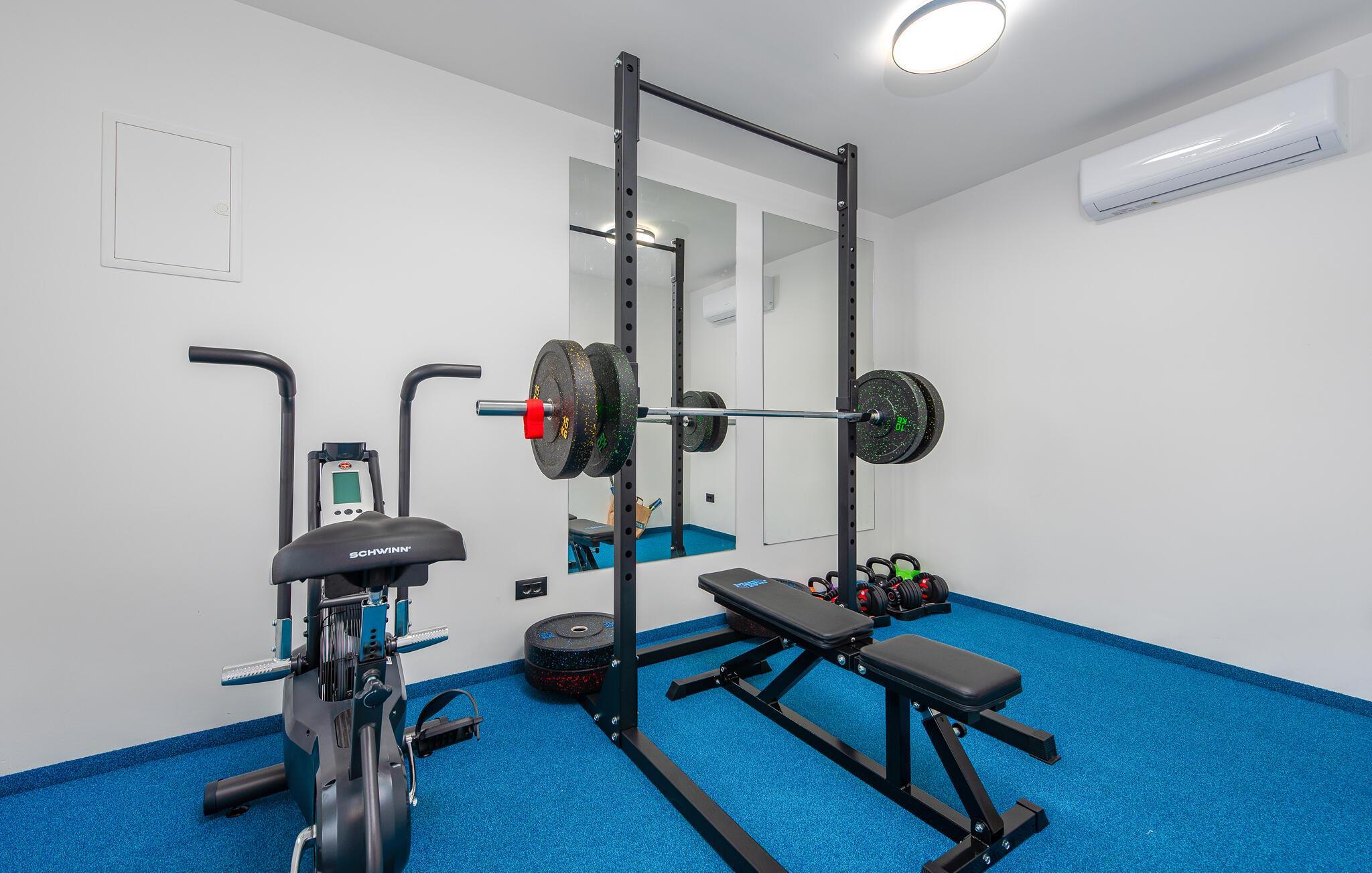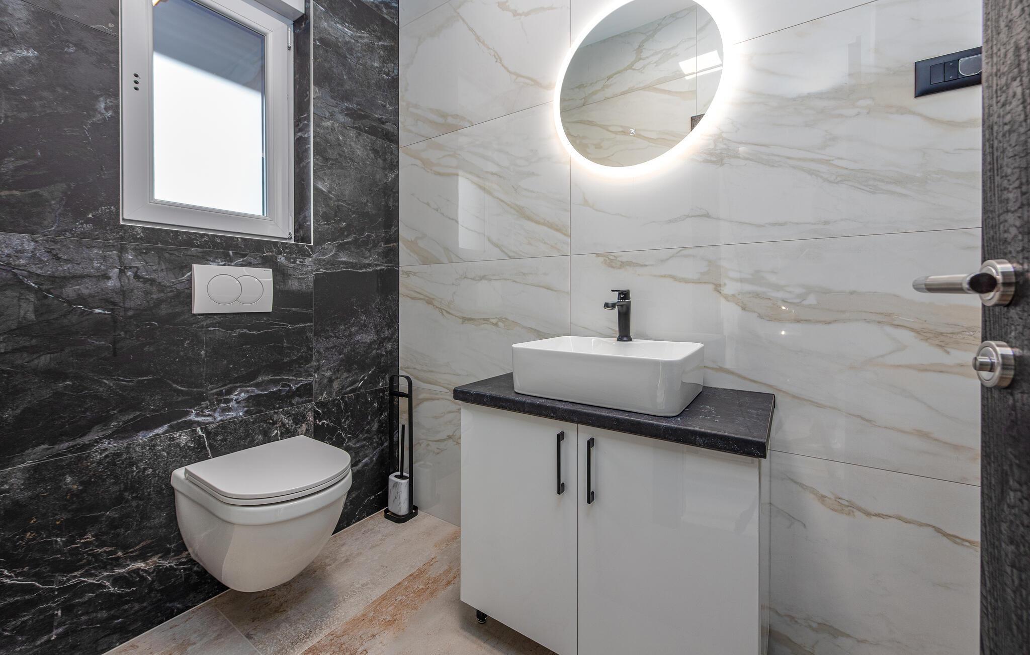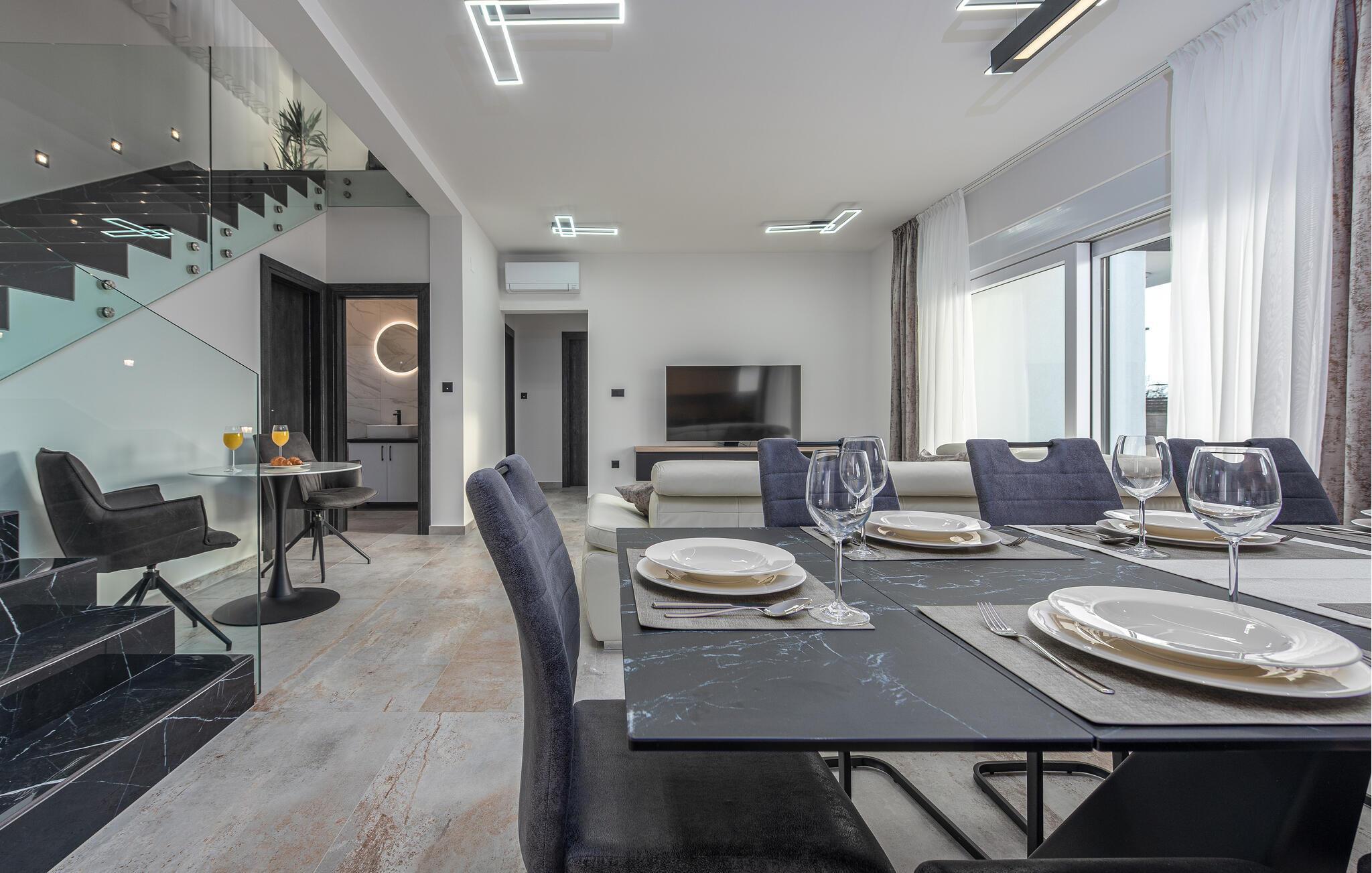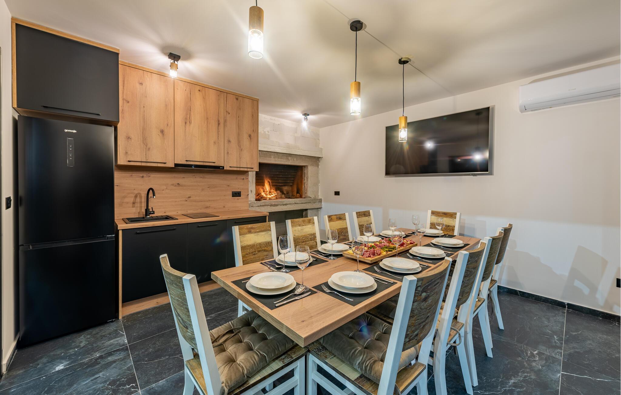 Dieses geräumige und luxuriös anmutende Ferienhaus bietet Familien fantastische Urlaubserlebnisse. Freuen Sie sich auf die vielen Möglichkeiten, die Ihr Ferienhaus für Sie bereithält. Im beheizten Außenpool kommen kleine und große Wasserfreunde auf ihre Kosten. Und dank der großzügigen Außenbeleuchtung können Sie Ihren Pool auch abends nach Sonnenuntergang nutzen. Wenn Sie etwas Abwechslung wünschen, dann erwartet Sie auf der Terrasse im ersten Stock ein Whirlpool, der Entspannung pur verspricht. Genießen Sie von dort aus oder von den dort vorhandenen Sonnenliegen die Aussicht auf Ihre Urlaubsgegend. Auch sportliche Aktivitäten kommen hier nicht zu kurz. Auf dem direkt am Haus gelegenen Sportplatz können Sie mit Ihren Kindern sportliche Wettkämpfe in vielen verschiedenen Sportarten bestreiten. Ein ganz besonderes Highlight für alle Hobbyköche ist die Außenküche mit gemauertem Grill und Esstisch. Abends können Sie sich es bei einem gemeinsamen Filmabend auch in den Sitzgruppen gemütlich machen