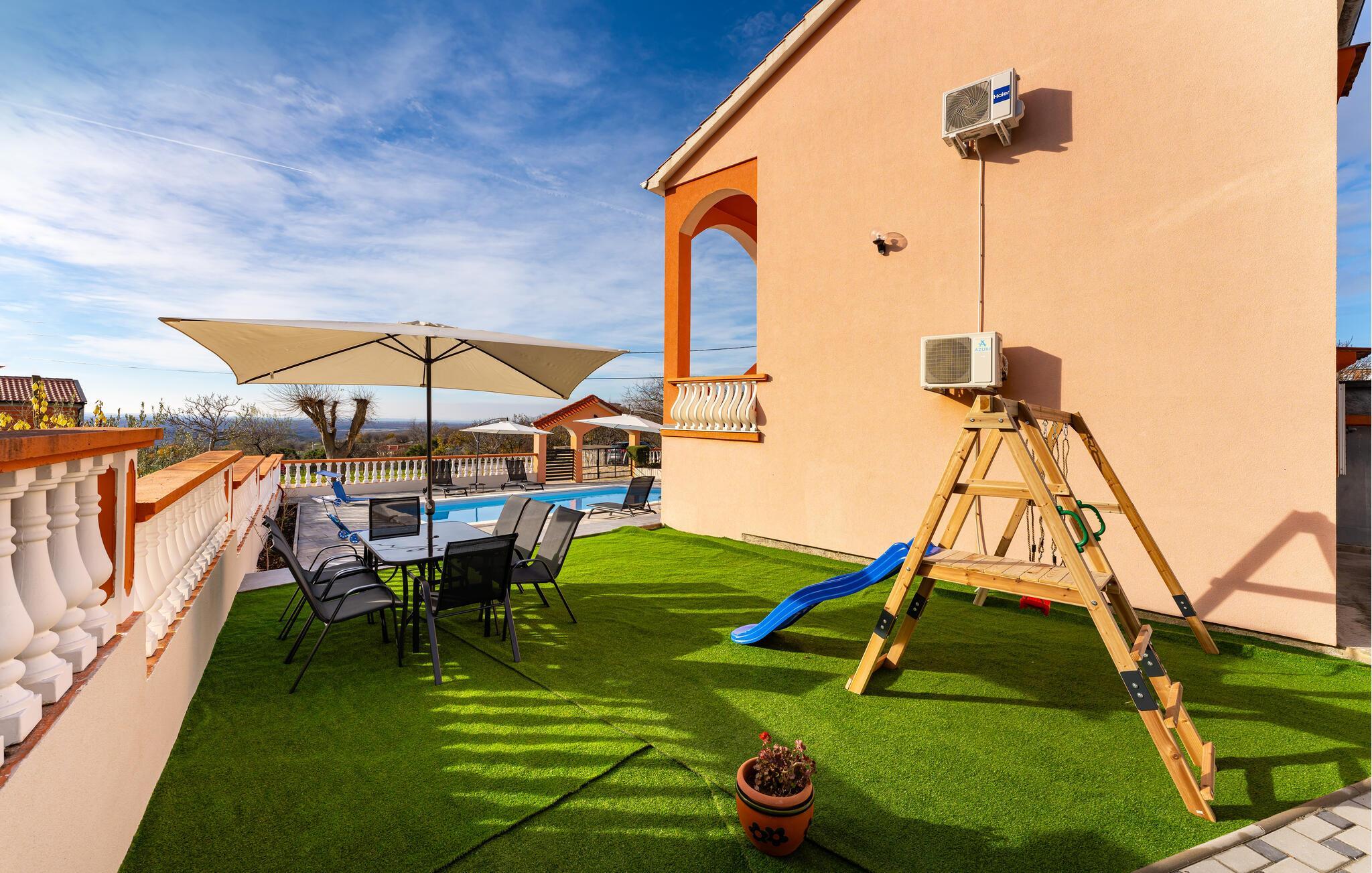 Draußen im Freien können Sie Ihre Mahlzeiten am Esstisch unter dem Sonnenschirm genießen. Für Familien mit Kindern gibt es einen liebevoll gestalteten Spielplatz, der für Spaß und Abwechslung sorgt. Das absolute Highlight Ihres Ferienhauses ist der erfrischende Außenpool. Baden Sie, entspannen Sie auf einer der bequemen Sonnenliegen oder lassen Sie sich im schattigen Bereich der Terrasse nieder.