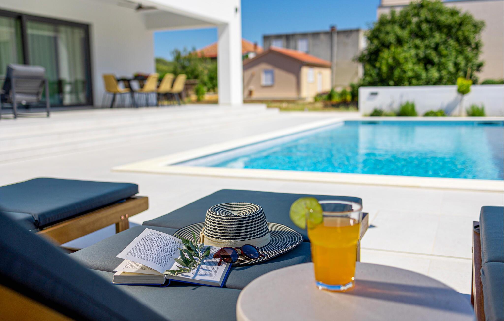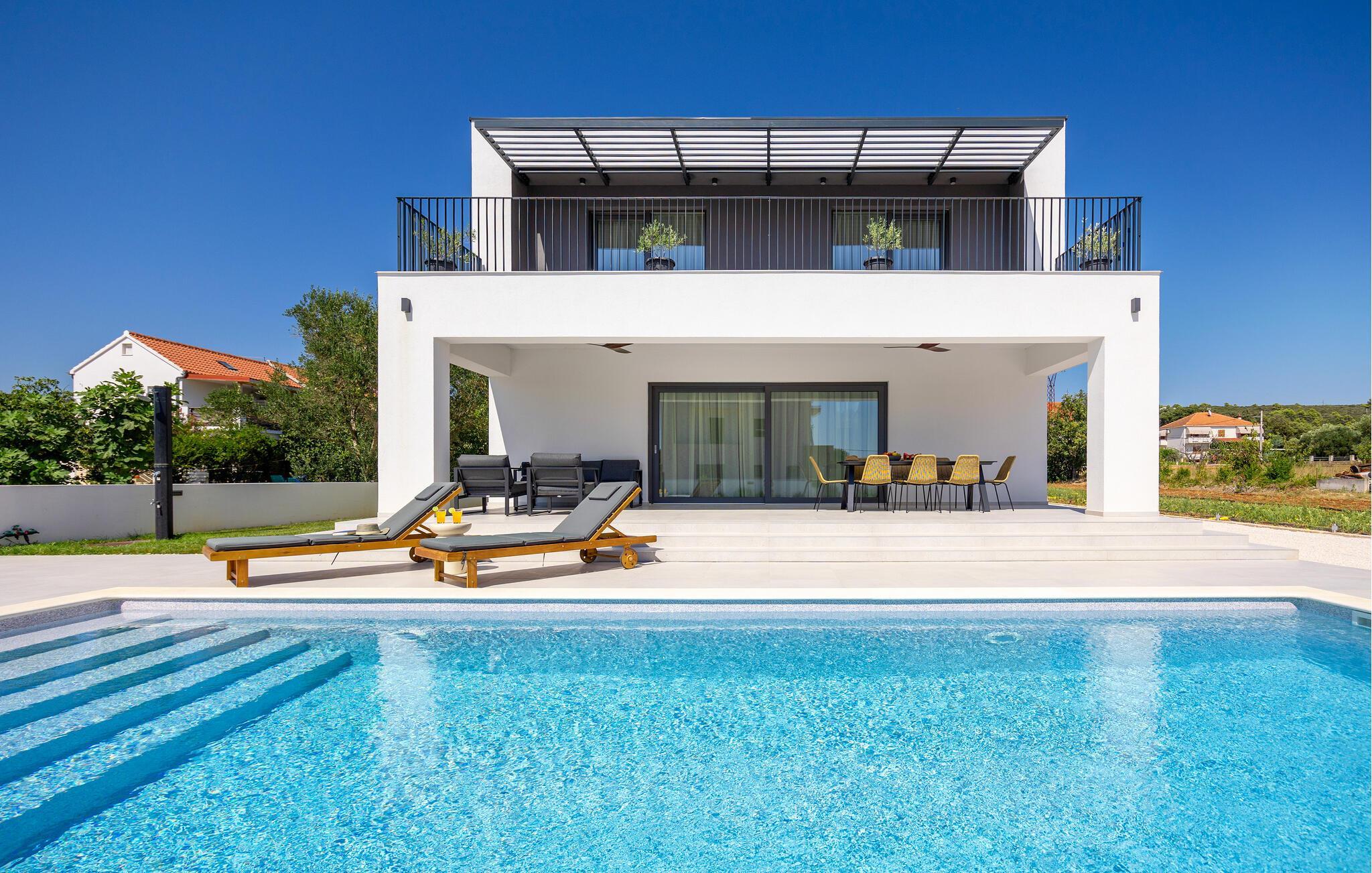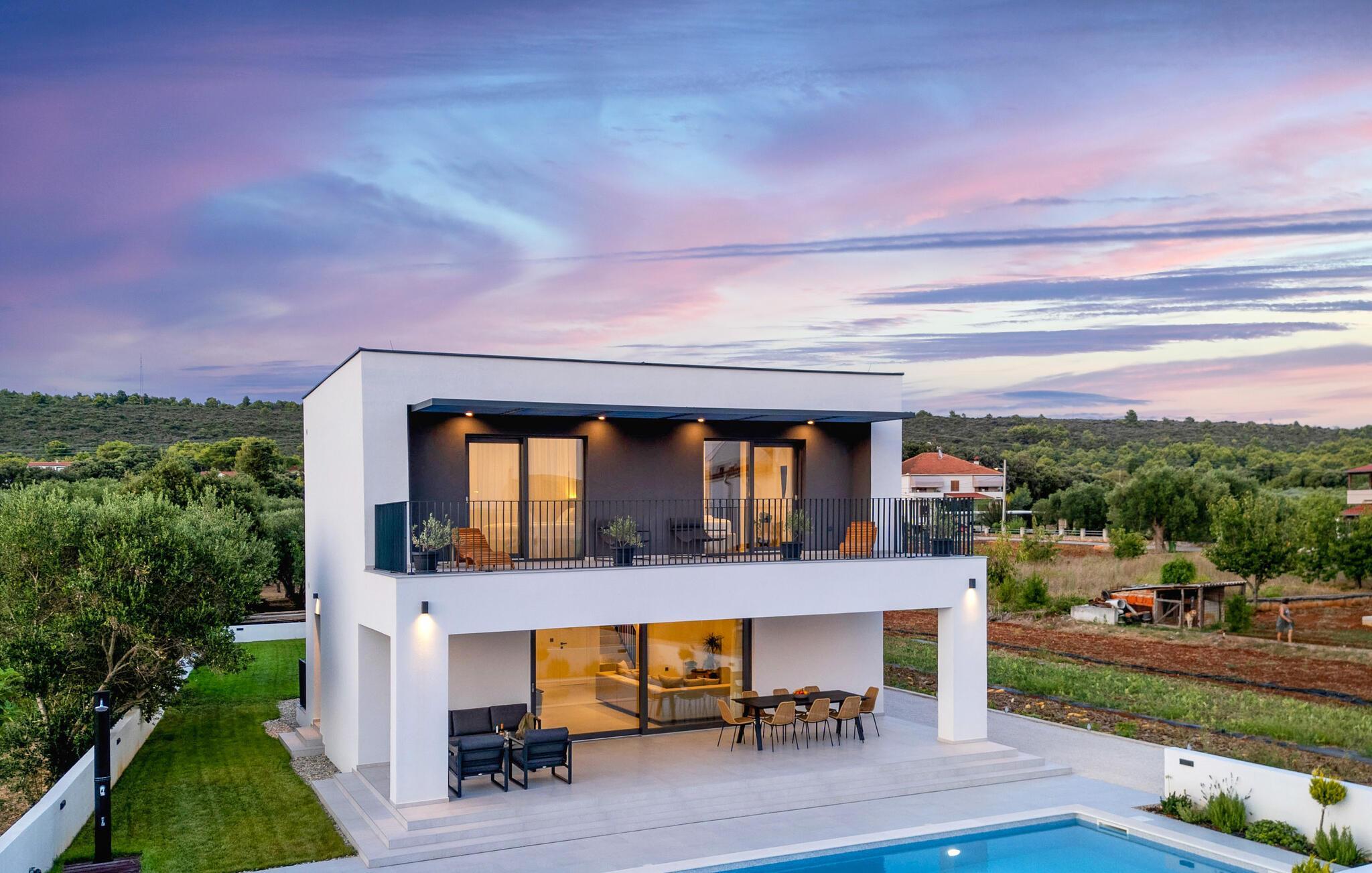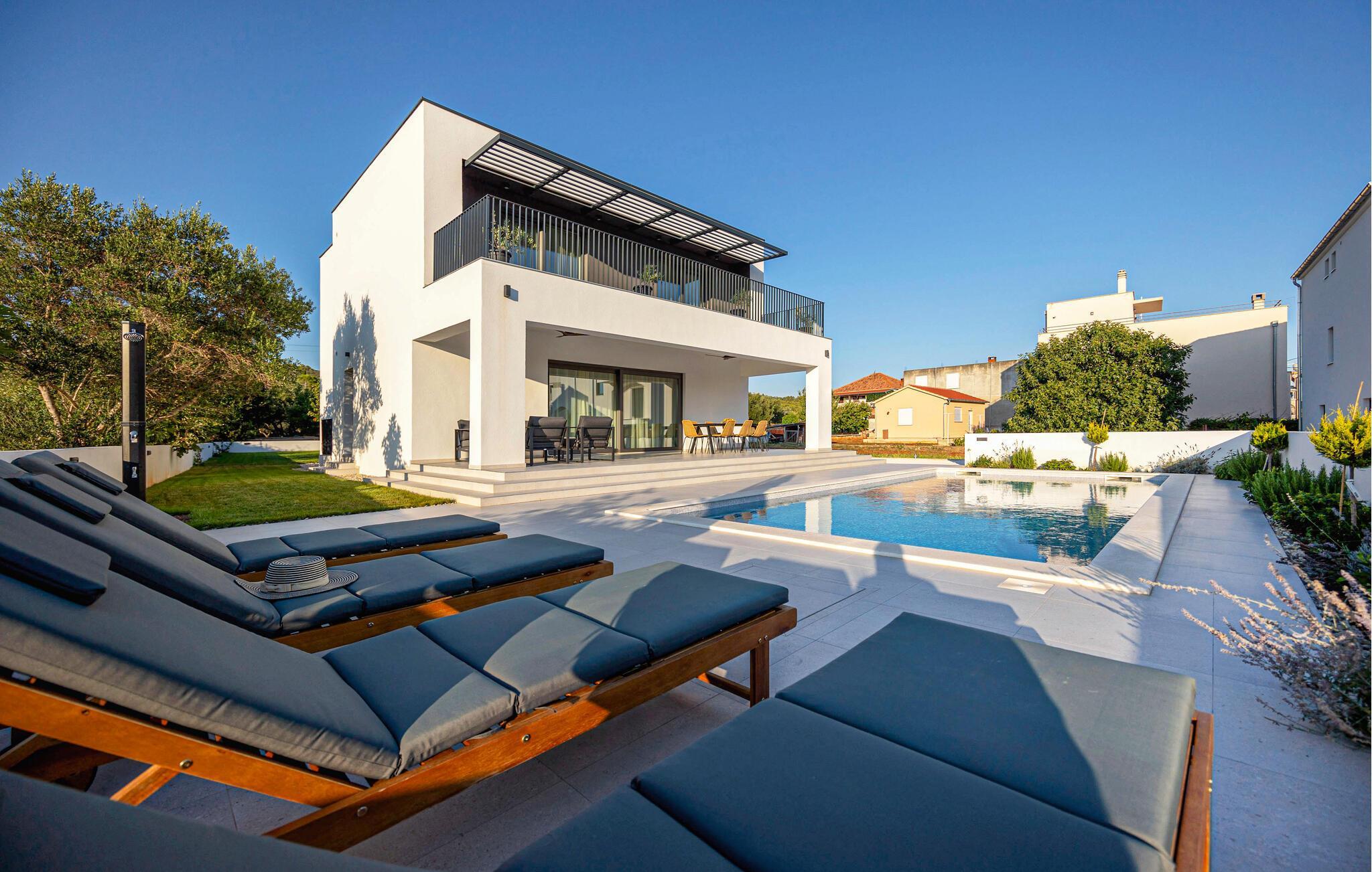 In diesem modernen Ferienhaus in Sukosan erwartet Sie ein Urlaub voller Komfort und Eleganz. Das großzügige, schlicht designte Interieur bietet Ihnen alles, was Sie für Ihren erholsamen Aufenthalt brauchen. Zaubern Sie in der Küche leckere Mahlzeiten oder versammeln sich zu einem unterhaltsamen Filmabend auf dem Sofa. Der lichtdurchflutete Wohnbereich führt auf eine überdachte Terrasse, die sich perfekt für gemeinsame Mahlzeiten im Freien eignet. Der zusätzliche Balkon an den Schlafzimmern bietet Ihnen einen herrlichen Meerblick und macht das Aufstehen besonders angenehm. Der Swimmingpool im Garten lädt Sie zu entspannten Tagen ein, während Sie das stilvolle Ambiente genießen – ideal für Ihren gelungenen Urlaub.