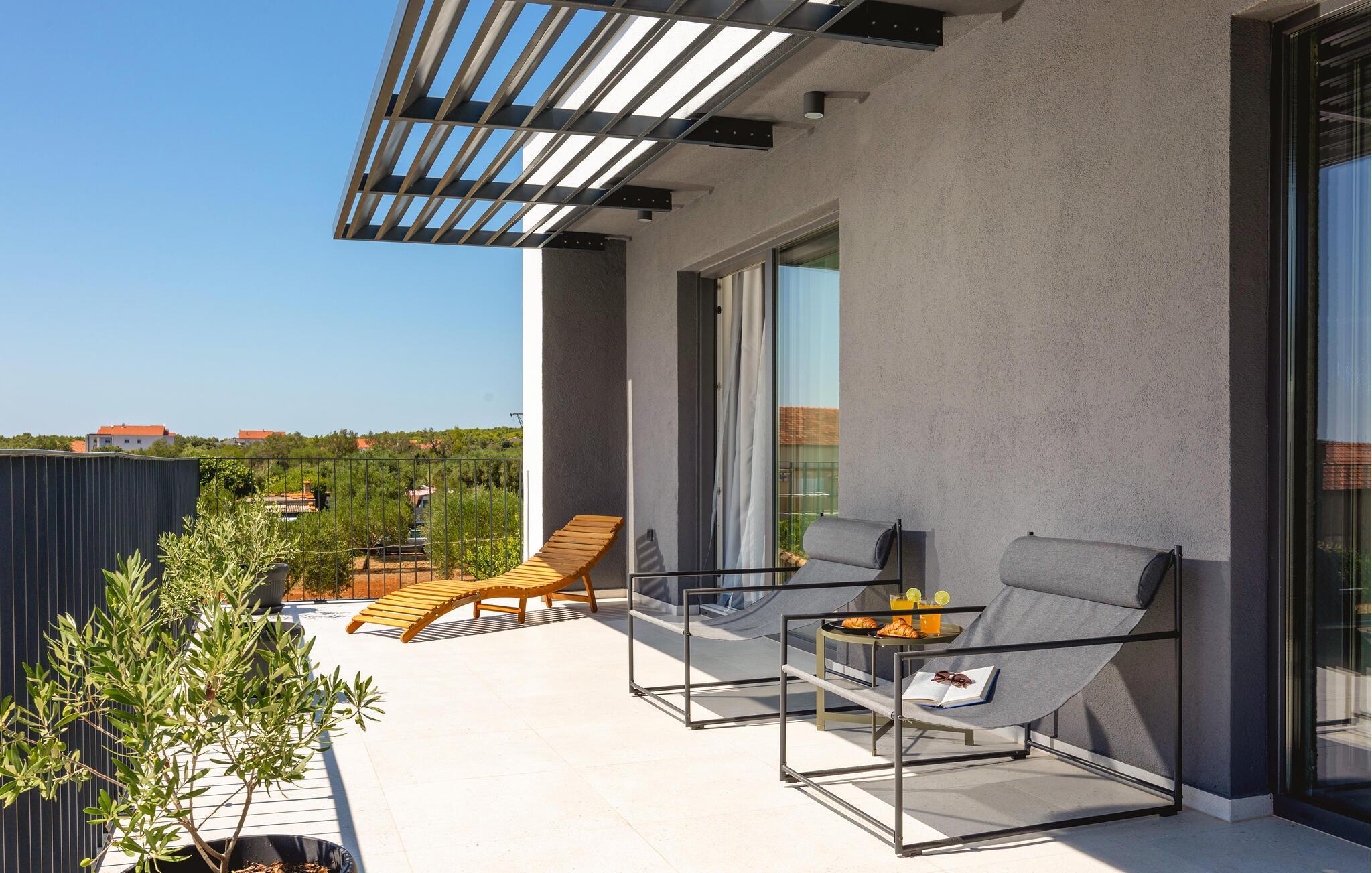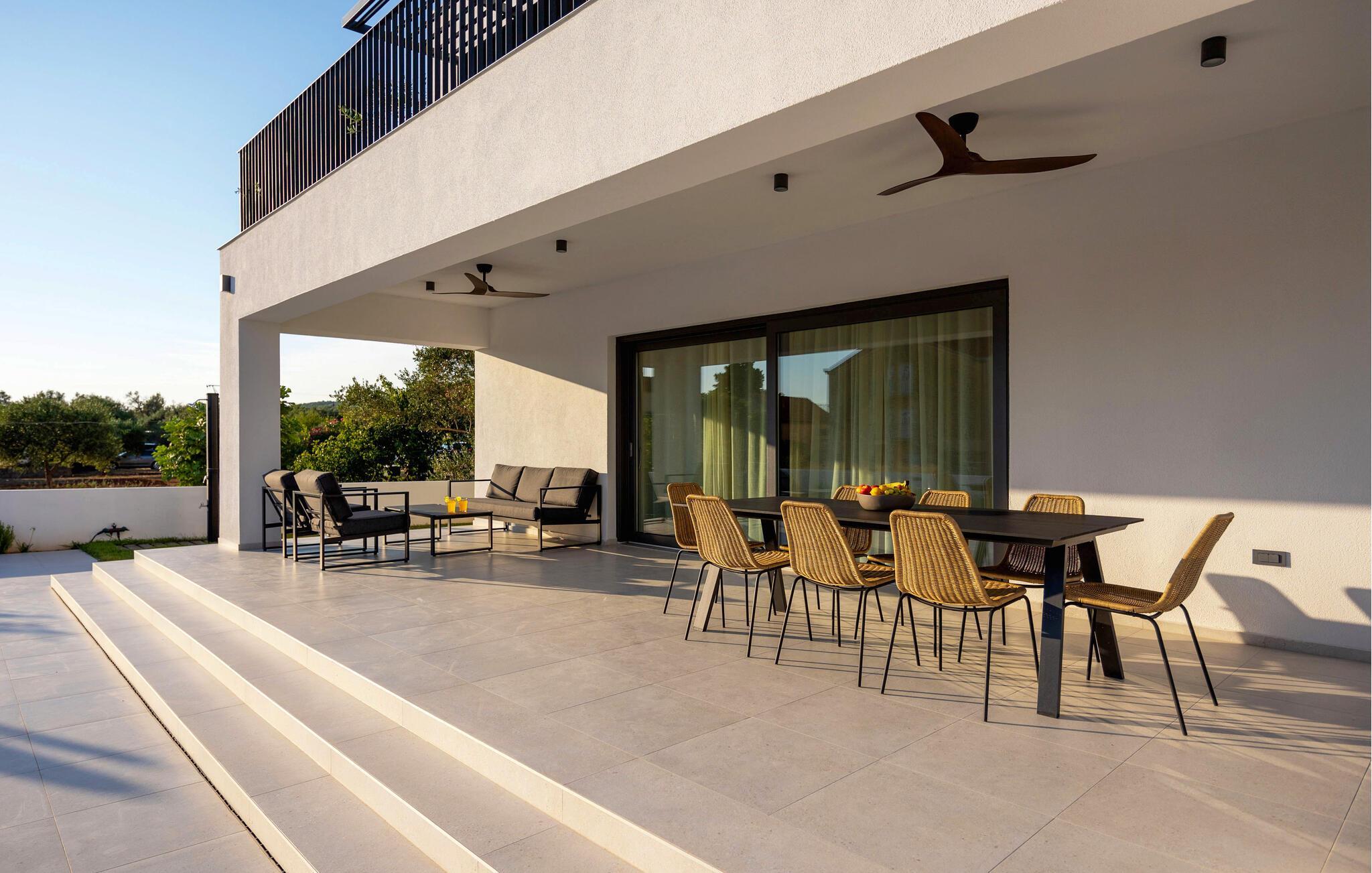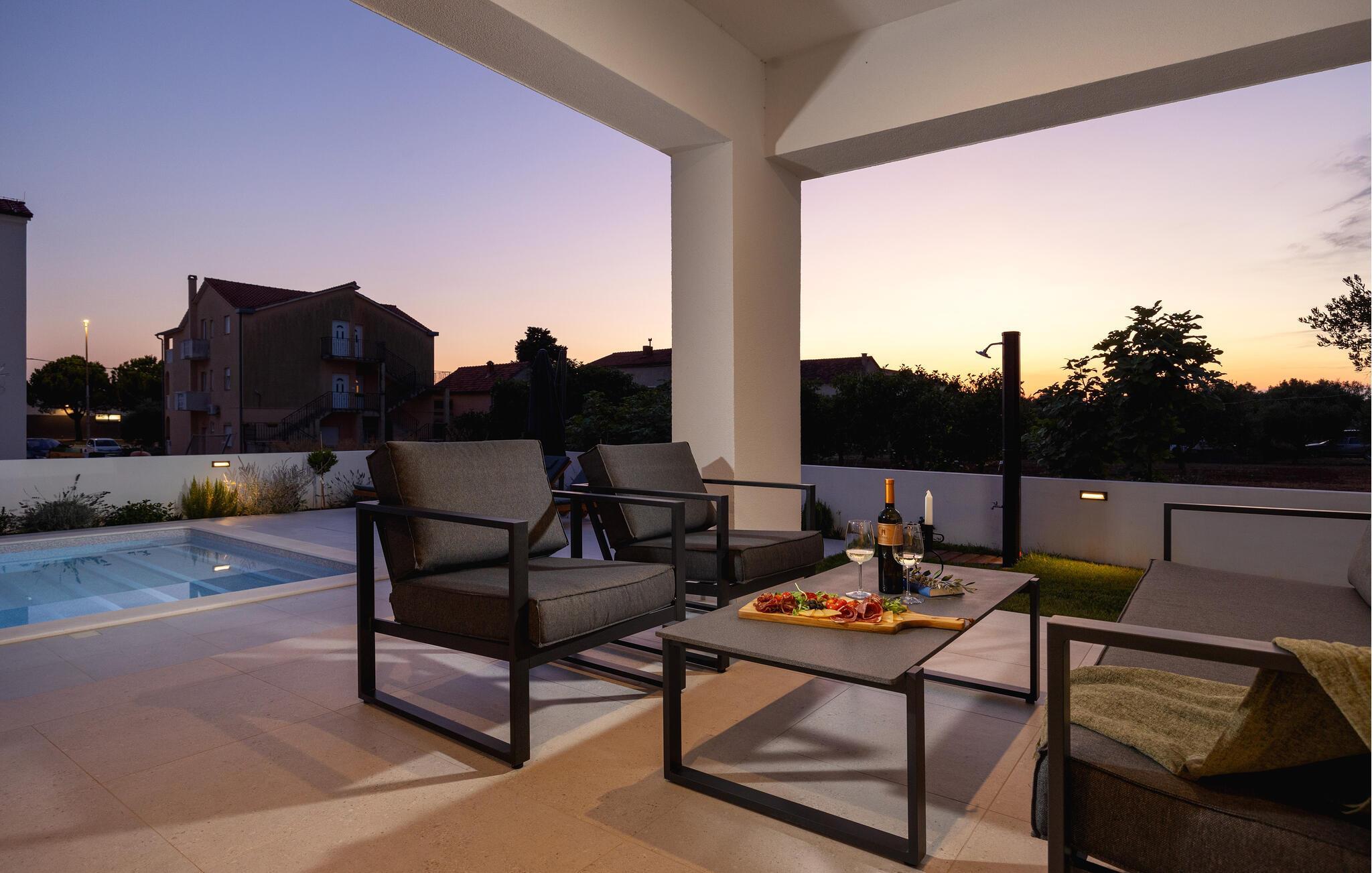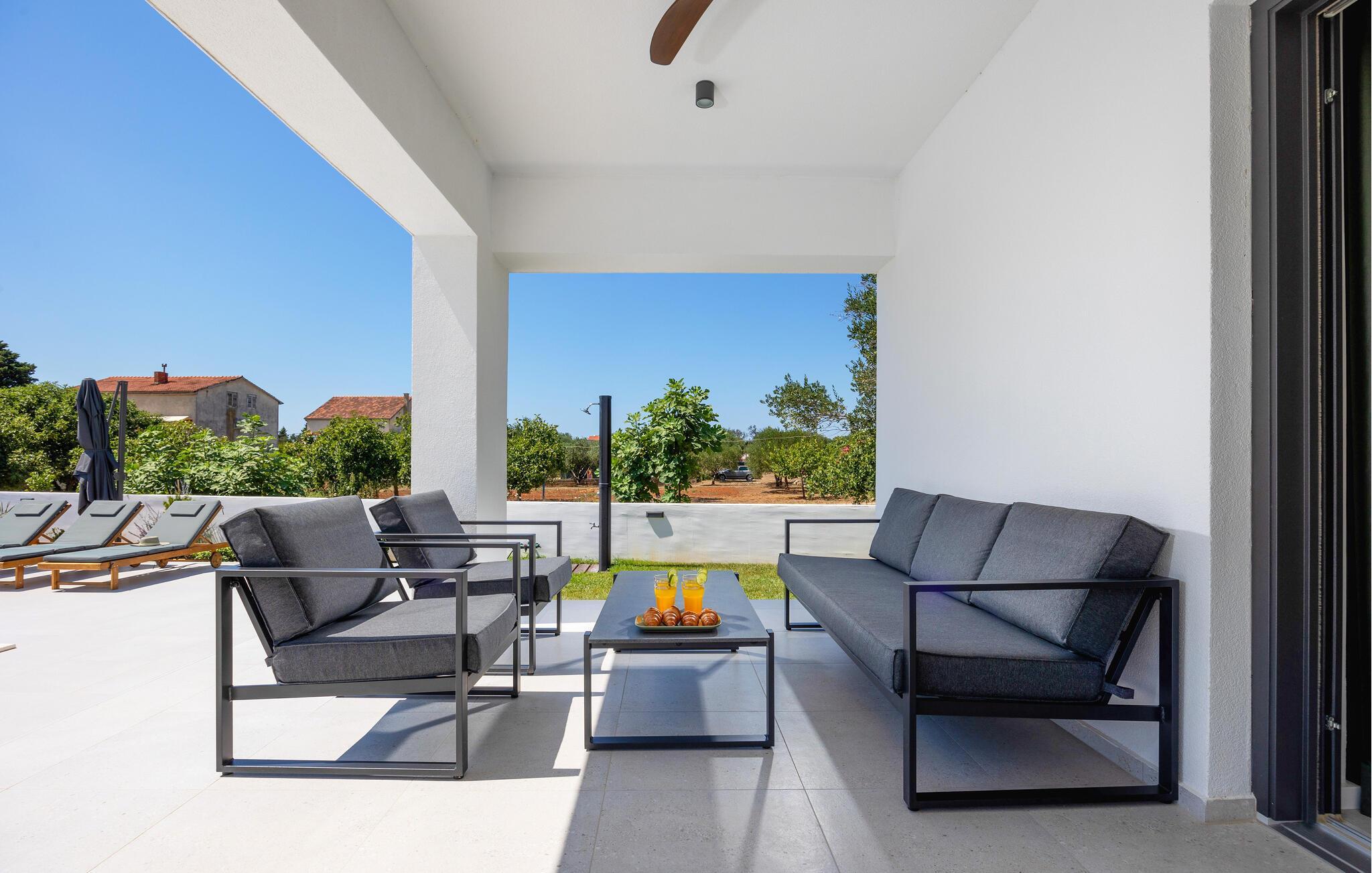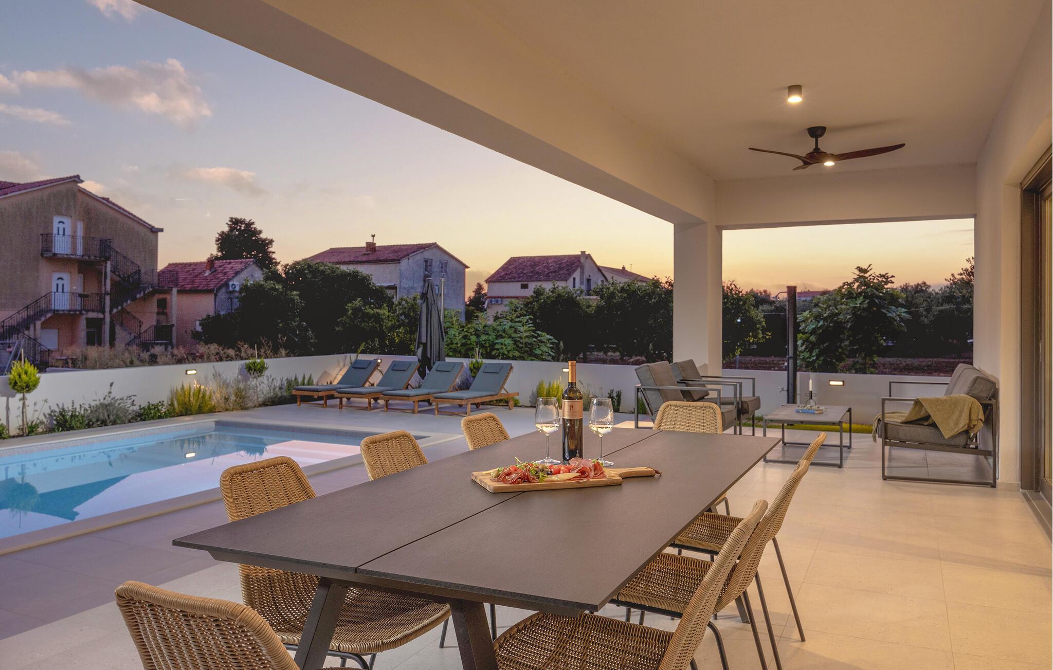 In diesem modernen Ferienhaus in Sukosan erwartet Sie ein Urlaub voller Komfort und Eleganz. Das großzügige, schlicht designte Interieur bietet Ihnen alles, was Sie für Ihren erholsamen Aufenthalt brauchen. Zaubern Sie in der Küche leckere Mahlzeiten oder versammeln sich zu einem unterhaltsamen Filmabend auf dem Sofa. Der lichtdurchflutete Wohnbereich führt auf eine überdachte Terrasse, die sich perfekt für gemeinsame Mahlzeiten im Freien eignet. Der zusätzliche Balkon an den Schlafzimmern bietet Ihnen einen herrlichen Meerblick und macht das Aufstehen besonders angenehm. Der Swimmingpool im Garten lädt Sie zu entspannten Tagen ein, während Sie das stilvolle Ambiente genießen – ideal für Ihren gelungenen Urlaub.