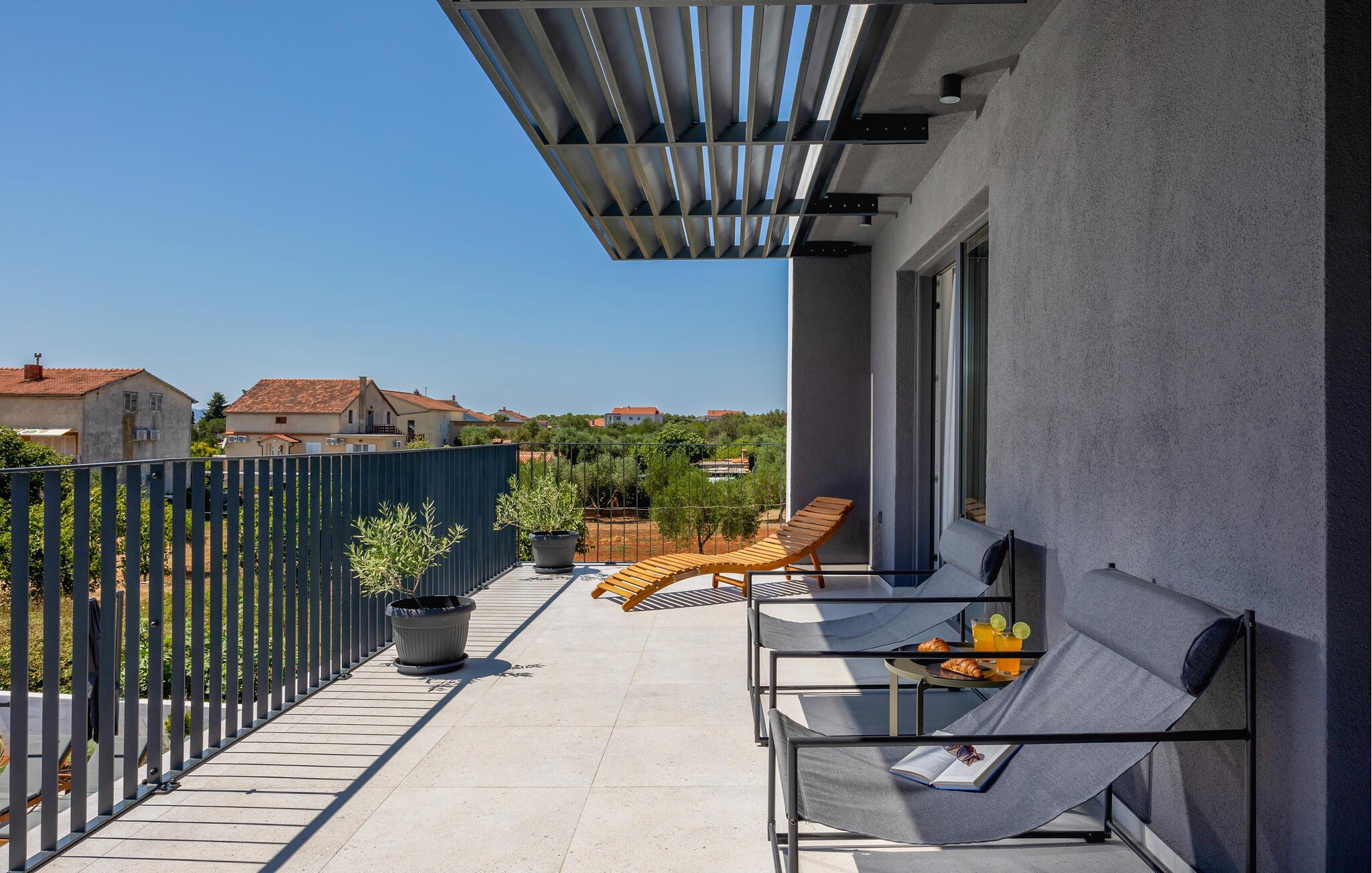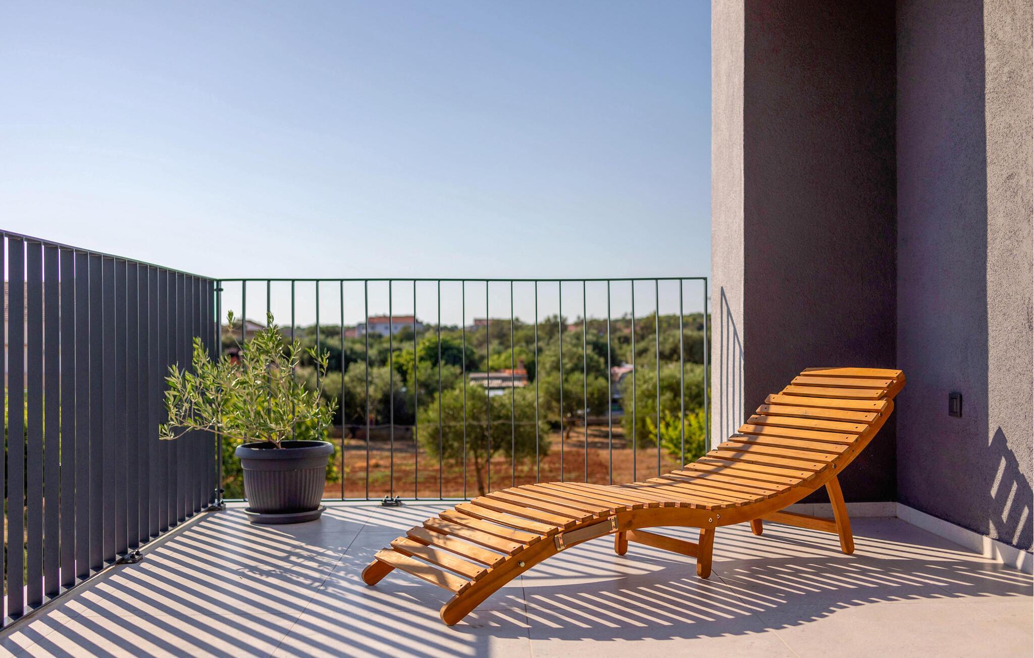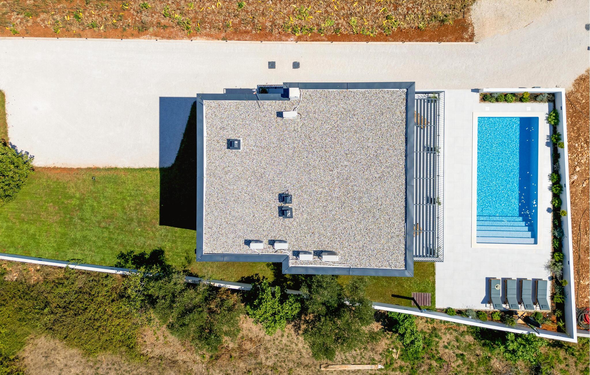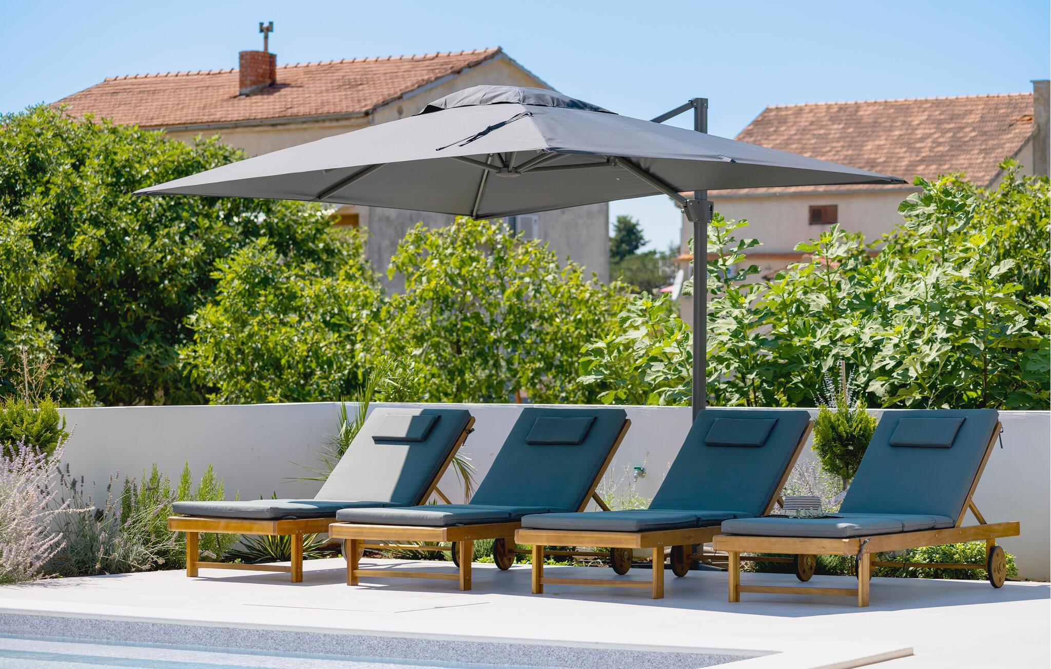 In diesem modernen Ferienhaus in Sukosan erwartet Sie ein Urlaub voller Komfort und Eleganz. Das großzügige, schlicht designte Interieur bietet Ihnen alles, was Sie für Ihren erholsamen Aufenthalt brauchen. Zaubern Sie in der Küche leckere Mahlzeiten oder versammeln sich zu einem unterhaltsamen Filmabend auf dem Sofa. Der lichtdurchflutete Wohnbereich führt auf eine überdachte Terrasse, die sich perfekt für gemeinsame Mahlzeiten im Freien eignet. Der zusätzliche Balkon an den Schlafzimmern bietet Ihnen einen herrlichen Meerblick und macht das Aufstehen besonders angenehm. Der Swimmingpool im Garten lädt Sie zu entspannten Tagen ein, während Sie das stilvolle Ambiente genießen – ideal für Ihren gelungenen Urlaub.