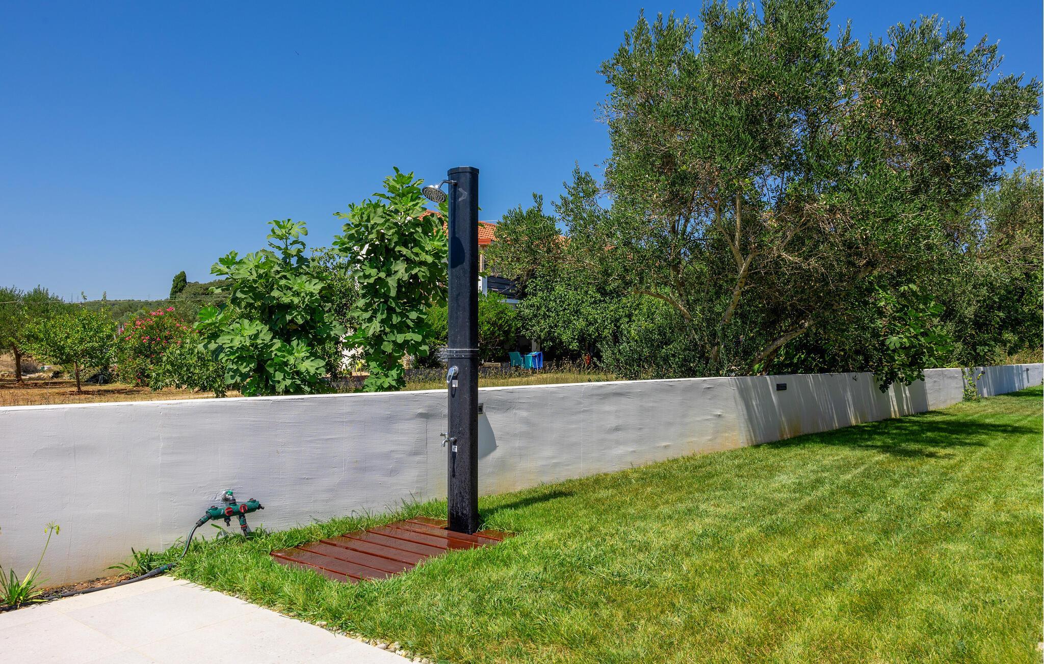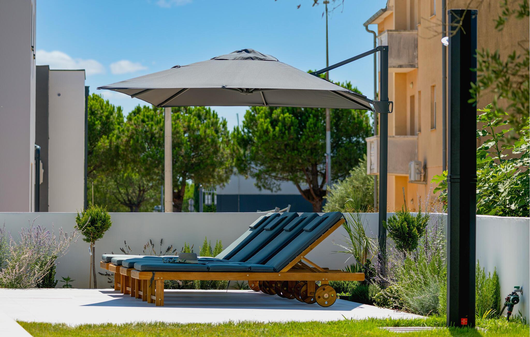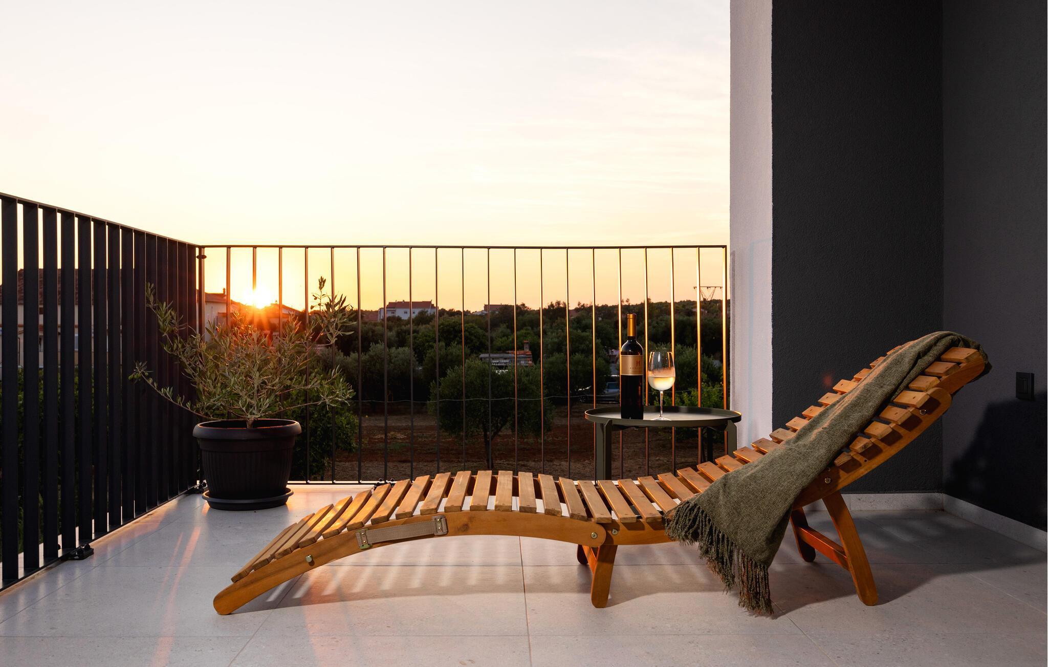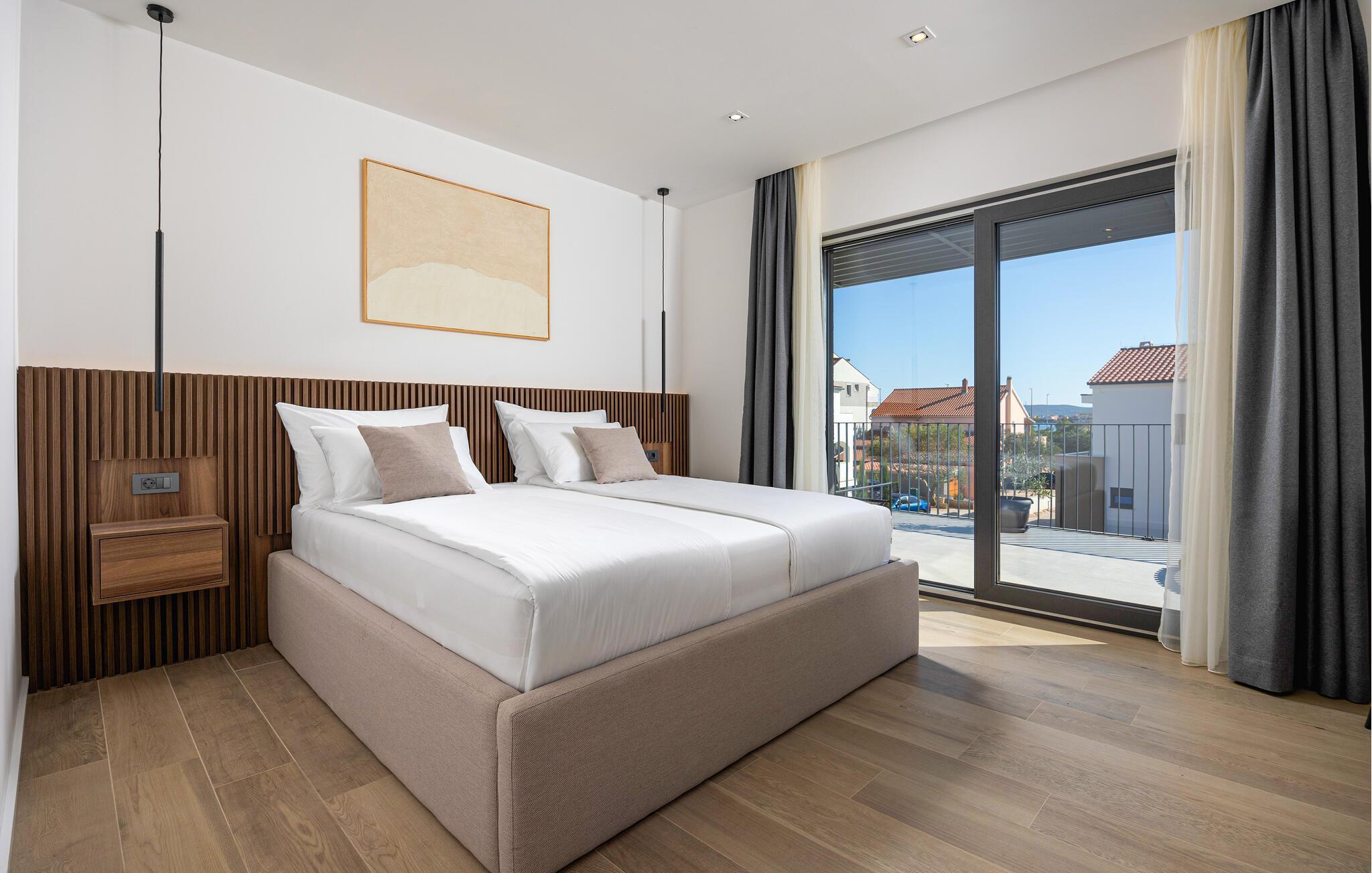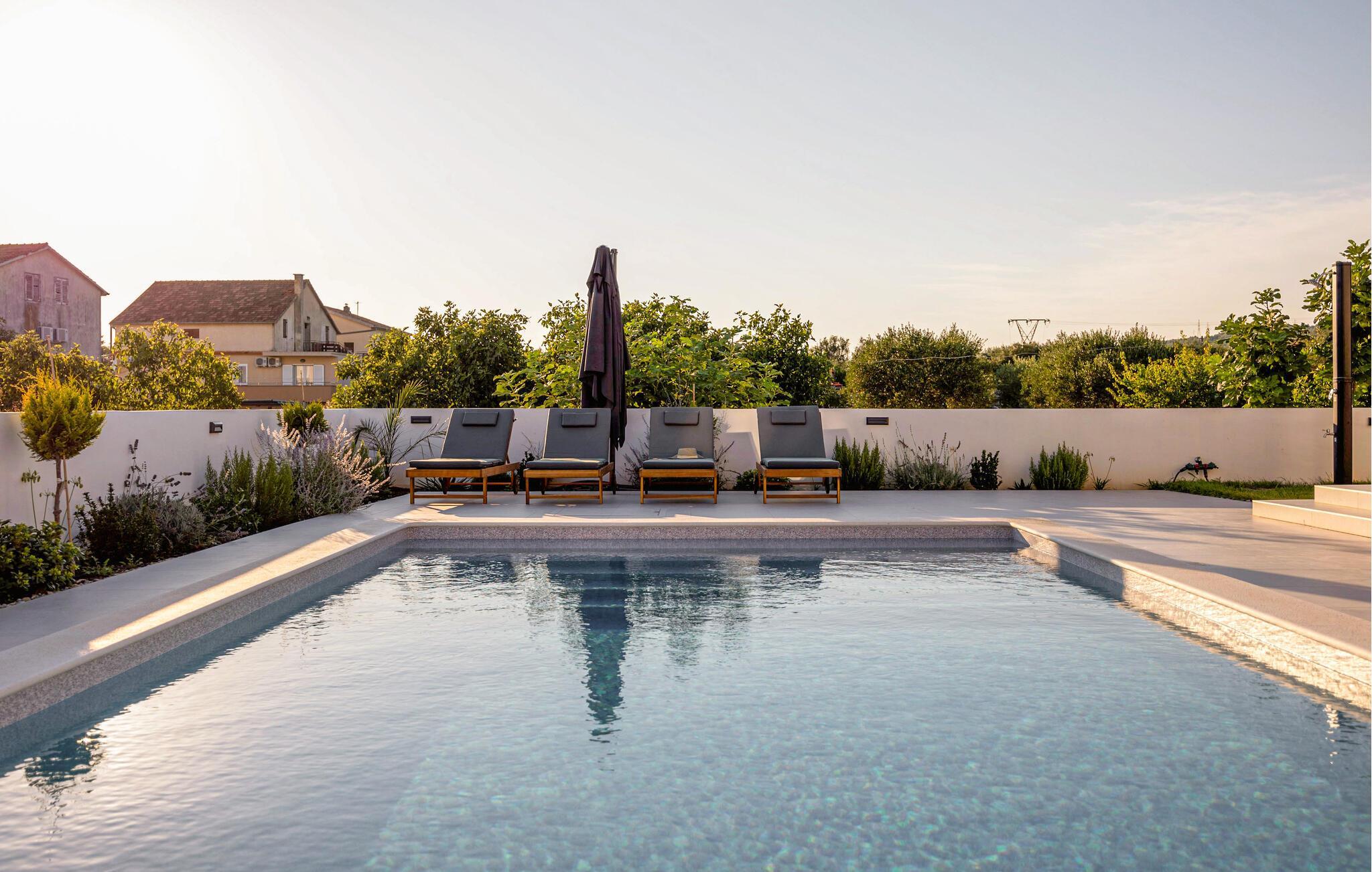 In diesem modernen Ferienhaus in Sukosan erwartet Sie ein Urlaub voller Komfort und Eleganz. Das großzügige, schlicht designte Interieur bietet Ihnen alles, was Sie für Ihren erholsamen Aufenthalt brauchen. Zaubern Sie in der Küche leckere Mahlzeiten oder versammeln sich zu einem unterhaltsamen Filmabend auf dem Sofa. Der lichtdurchflutete Wohnbereich führt auf eine überdachte Terrasse, die sich perfekt für gemeinsame Mahlzeiten im Freien eignet. Der zusätzliche Balkon an den Schlafzimmern bietet Ihnen einen herrlichen Meerblick und macht das Aufstehen besonders angenehm. Der Swimmingpool im Garten lädt Sie zu entspannten Tagen ein, während Sie das stilvolle Ambiente genießen – ideal für Ihren gelungenen Urlaub.