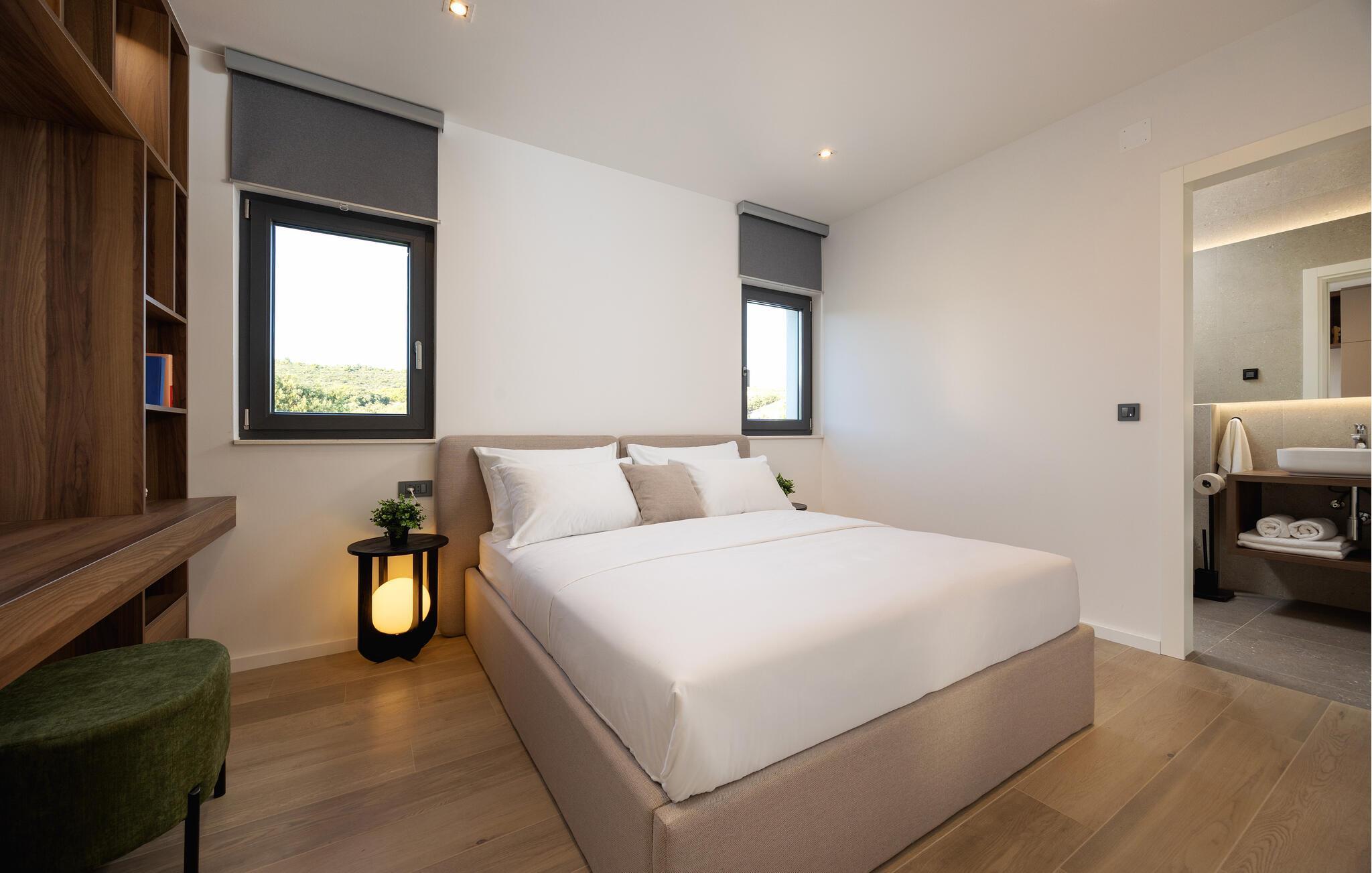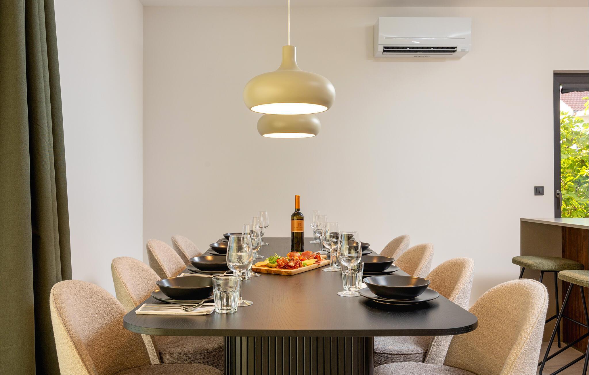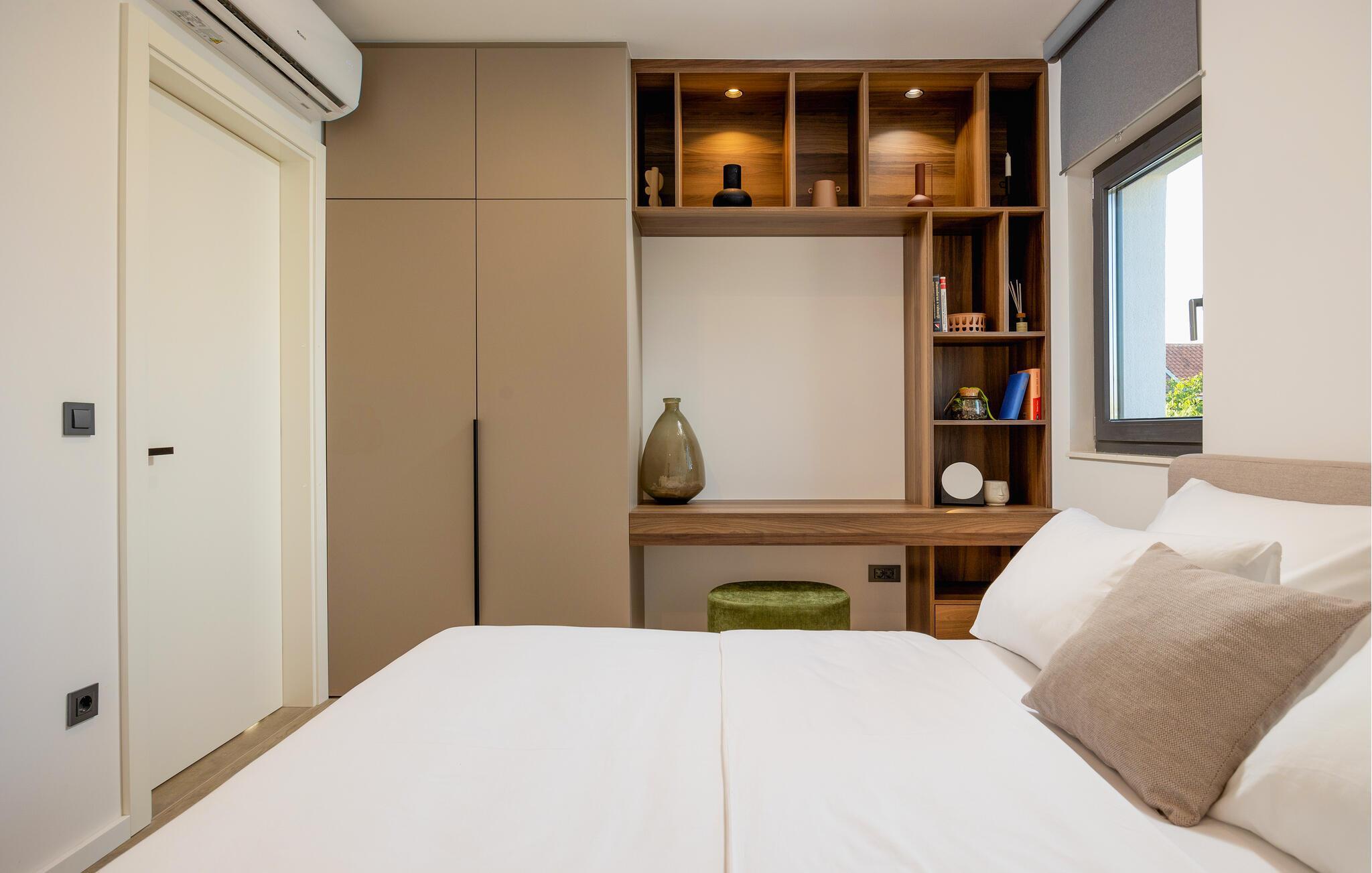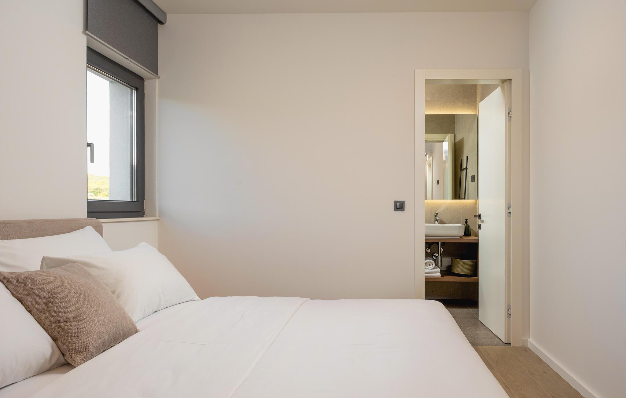 In diesem modernen Ferienhaus in Sukosan erwartet Sie ein Urlaub voller Komfort und Eleganz. Das großzügige, schlicht designte Interieur bietet Ihnen alles, was Sie für Ihren erholsamen Aufenthalt brauchen. Zaubern Sie in der Küche leckere Mahlzeiten oder versammeln sich zu einem unterhaltsamen Filmabend auf dem Sofa. Der lichtdurchflutete Wohnbereich führt auf eine überdachte Terrasse, die sich perfekt für gemeinsame Mahlzeiten im Freien eignet. Der zusätzliche Balkon an den Schlafzimmern bietet Ihnen einen herrlichen Meerblick und macht das Aufstehen besonders angenehm. Der Swimmingpool im Garten lädt Sie zu entspannten Tagen ein, während Sie das stilvolle Ambiente genießen – ideal für Ihren gelungenen Urlaub.