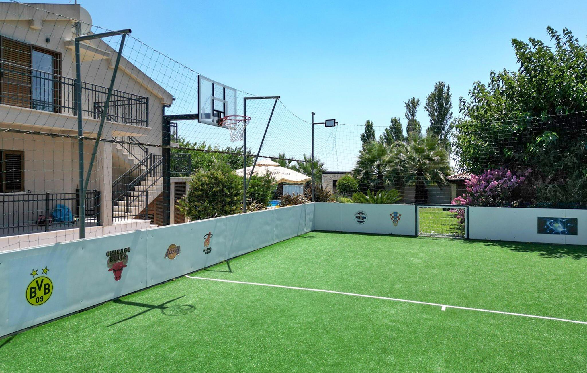 Das große Grundstück beinhaltet einen wunderschön angelegten Garten mit Grill, in dem Sie mit Ihren Liebsten frisch zubereitete Mahlzeiten genießen können. Erfrischen Sie sich gleich morgens im großen Pool und lassen Sie auf der Sonnenliege die Seele baumeln. Ein weiteres Highlight für Sportbegeisterte ist der Fußballplatz mit Kunstrasen.