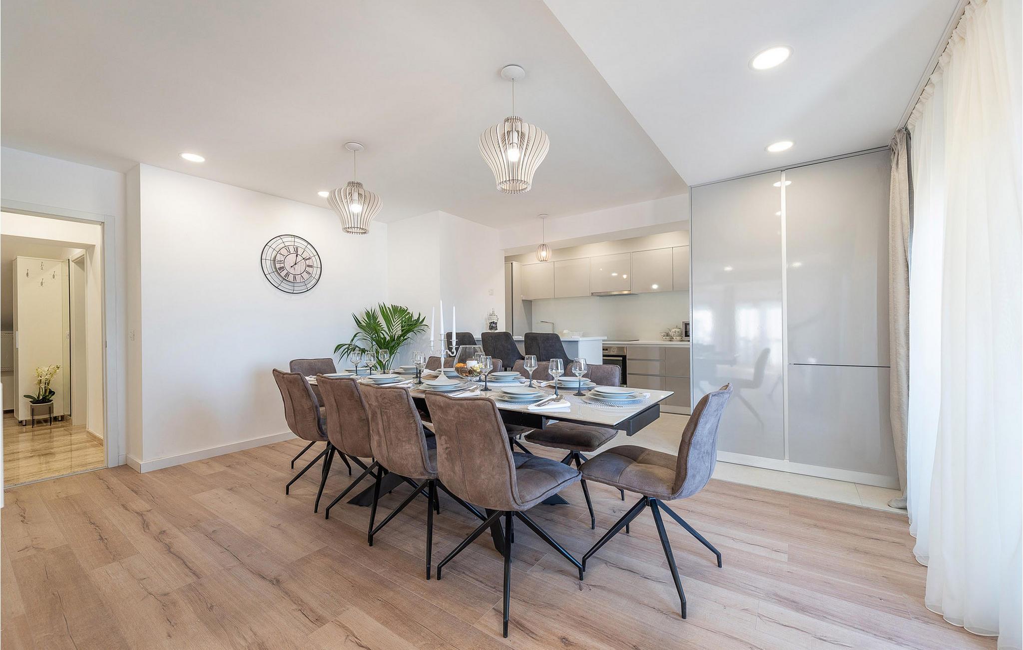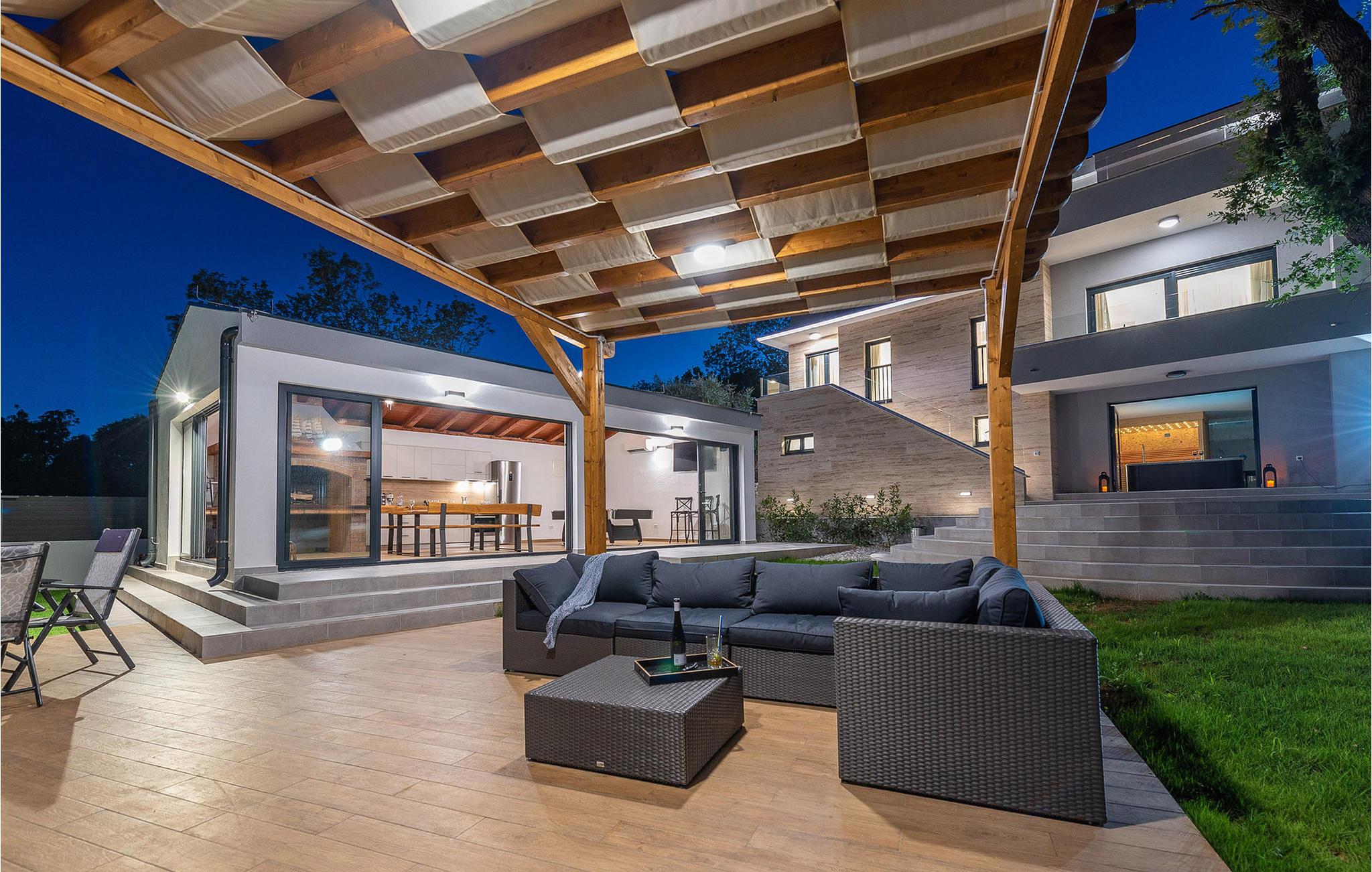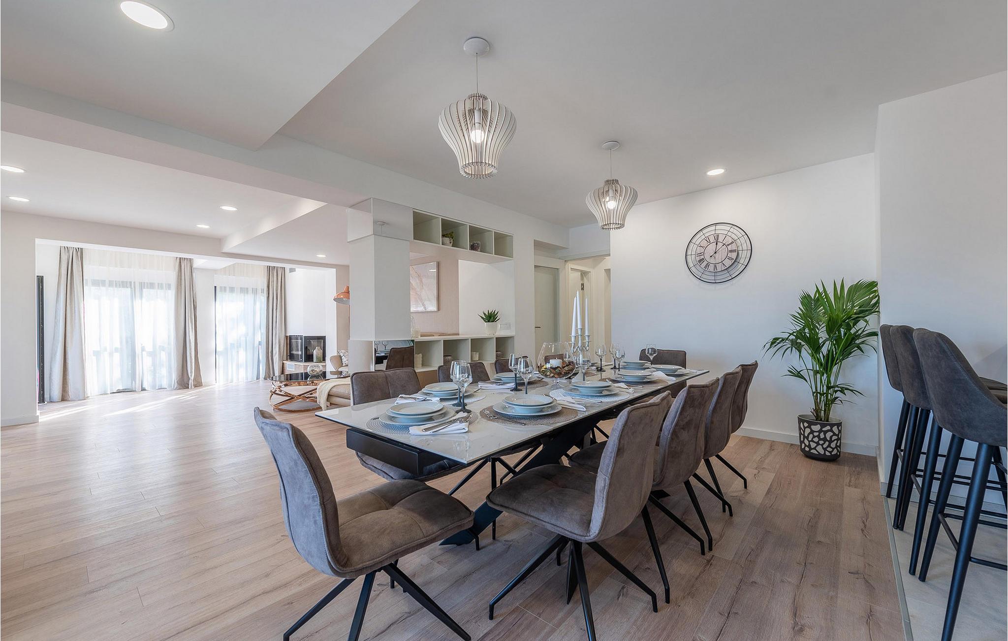 Die moderne Villa Ruby bietet Ihnen höchsten Komfort und ist ein Rückzugsort für Erholung und Aktivität gleichermaßen. Der großzügige Wohnbereich im ersten Stcokwerk führt in die helle, gut ausgestattete Küche – perfekt, um mediterrane Köstlichkeiten zuzubereiten. Auf dem Balkon können Sie den Blick aufs Meer genießen, während Videospiele, Darts und Billard für Unterhaltung sorgen. Entspannen Sie im Erdgeschoss in der Sauna oder im Whirlpool, während Sportbegeisterte das hauseigene Fitnessstudio nutzen.