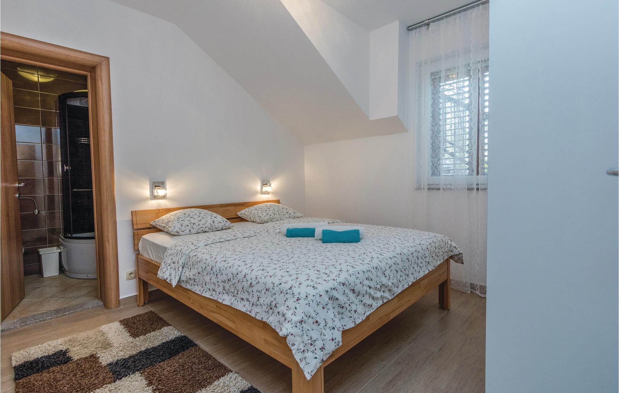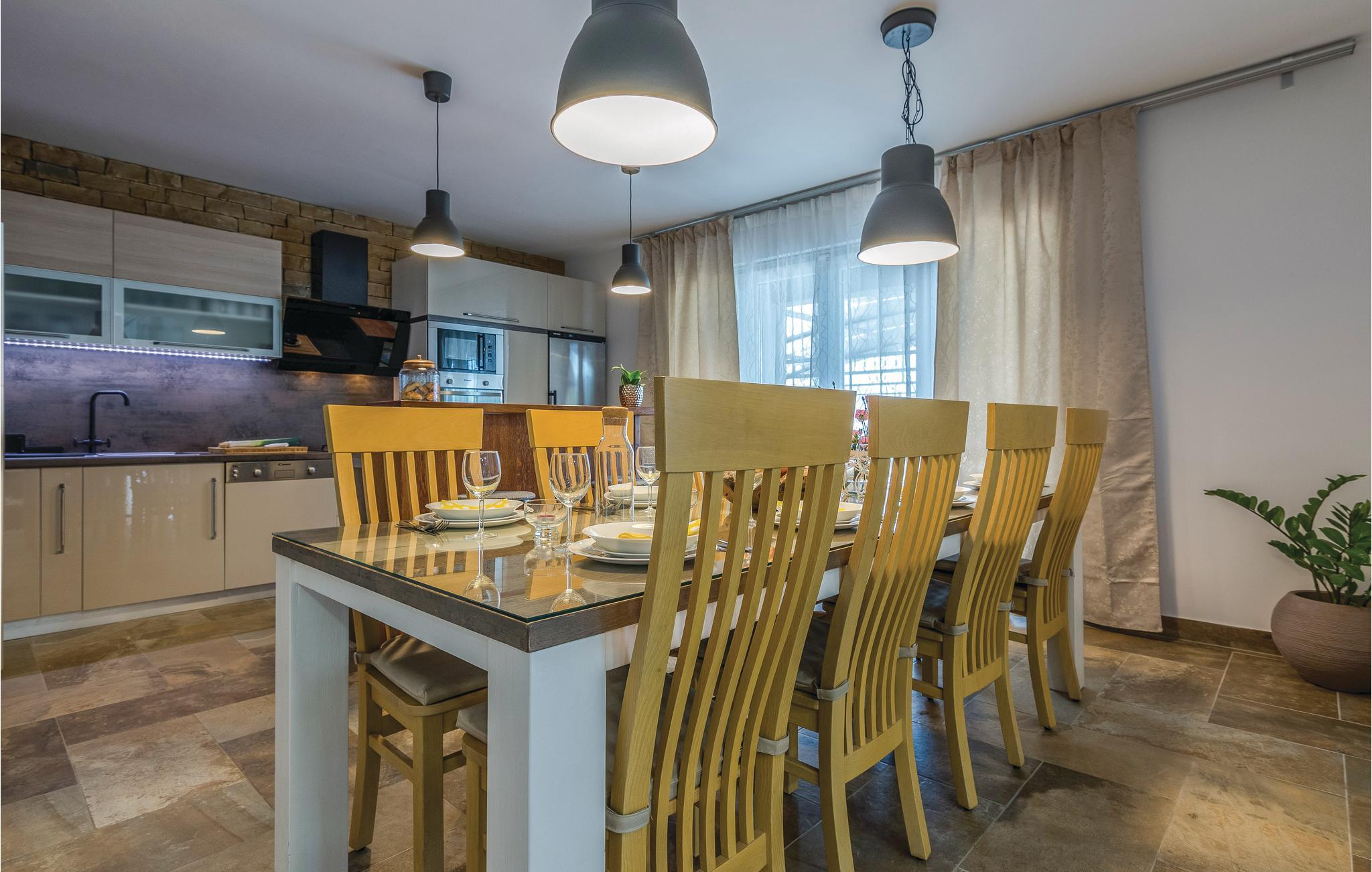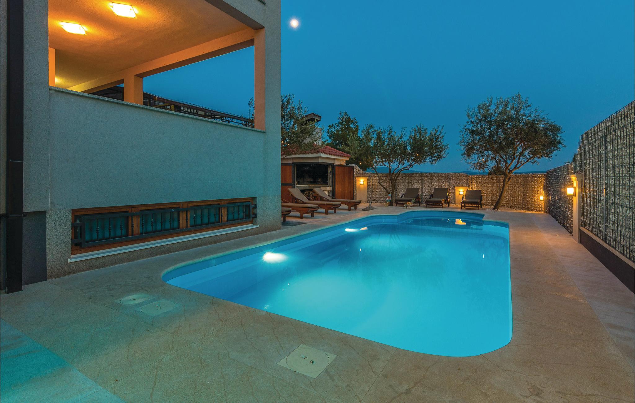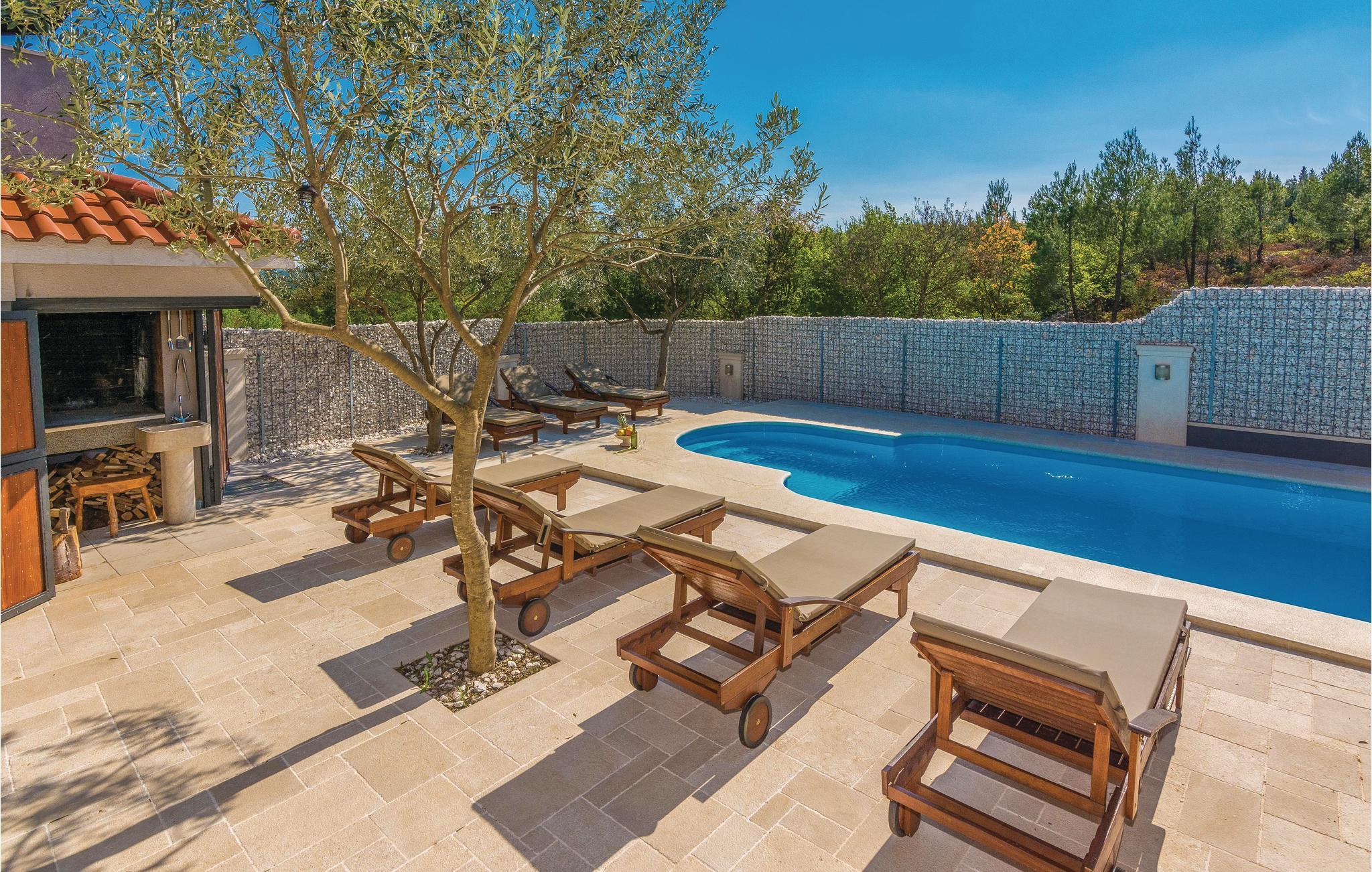 Modernes Ferienhaus mit Swimmingpool und schöner Aussicht auf die grüne Landschaft und das Meer. Ein ideales Reiseziel für Familien und Freunde, dess das Domizil besteht aus drei separaten Wohnungen. Im Erdgeschoss ist eine Wohnung mit vier Schlafzimmern, während im Obergeschoss zwei Wohnungen mit jeweils zwei Schlafzimmern sind. Die Etagen werden nur über Außentreppen erreicht, die Dachschrägen können auf 180 cm reichen. Von den Terrassen im Obergeschoss bietet sich ein Panoramablick auf das Meer, während im Erdgeschossbereich der Pool mit Sonnenliegen, Grill und eine überdachte Terrasse zum Relaxen vorhanden sind. Im Keller, welcher über eine Außentreppe zugänglich ist, befindet sich ein Billiardtisch, außerdem gibt es einen Whirlpool. Machen Sie einen sportlichen Ausflug, Unternehmen Sie z. B. Rafting auf dem Fluss Zrmanja oder eine Safari ins Velebit-Gebirge.