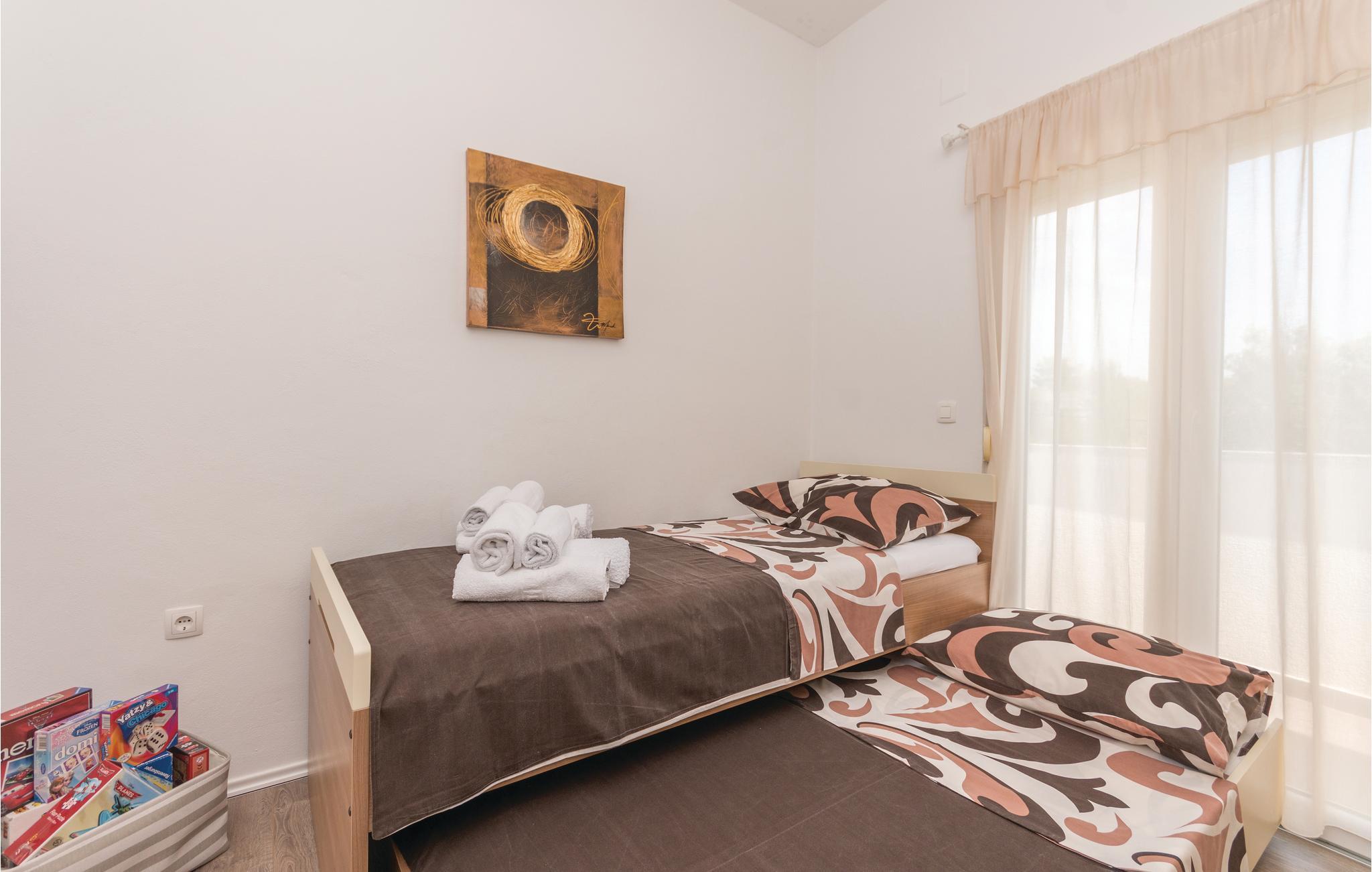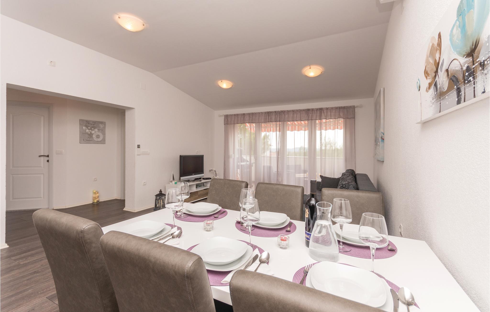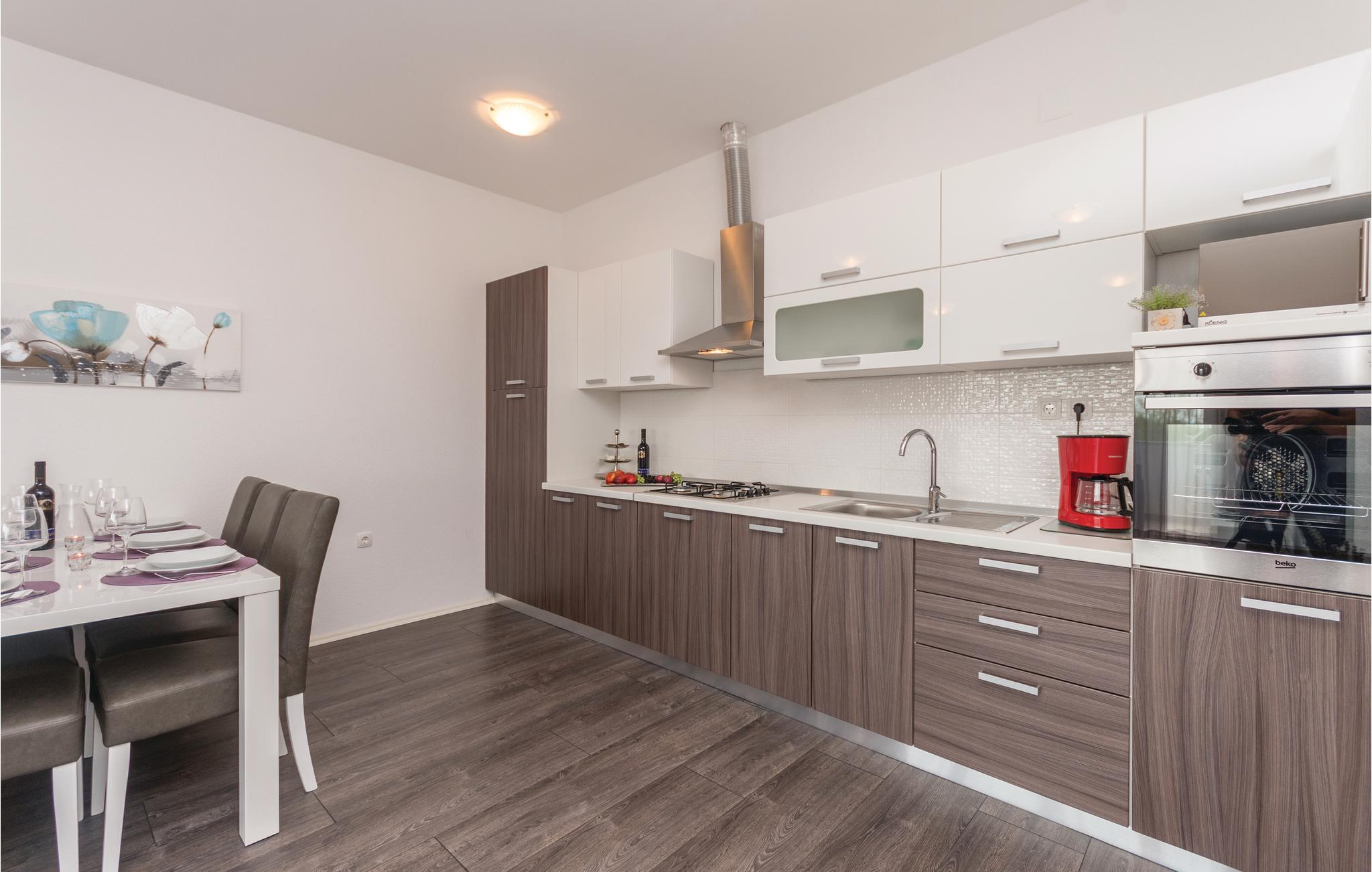 Diese elegante und modern eingerichtete Ferienwohnung liegt im Dachgeschoss des Gebäudes und hat eine Terrasse und einen Balkon. Auf Ihrer Terrasse befinden sich Gartenmöbel und ein Grill. Auf dem Grundstück ist ein Parkplatz für Sie reserviert. Die nächstgelegenen Strände sind Kiesstrände. Der beliebteste örtliche Strand hat ein Betonplateau und im flachem Meer ist Sandboden. Die Marina und das Zentrum des Ortes, die während der Sommermonate sehr lebendig sind, liegen so weit entfernt, so dass Ihnen ein ruhiger Urlaub ermöglicht wird. Die schöne und interessante Stadt Zadar und seinen internationalen Flughafen erreicht Sie in weniger als 15 Autominuten.