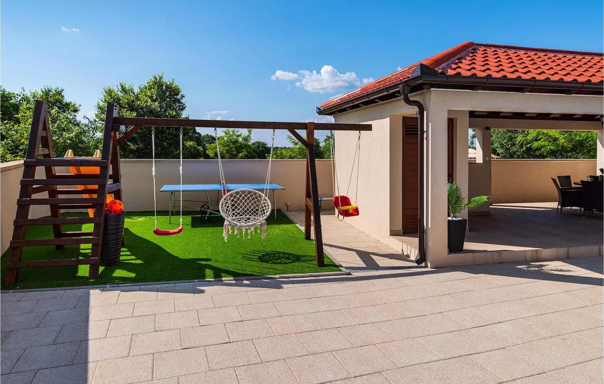 Der Garten verfügt über einen privaten Pool, Liegestühle und einen überdachten Essbereich, wo Sie Ihre Tage mit Freunden genießen können, während Ihre Kinder auf dem Spielplatz spielen. Vom Garten aus haben Sie auch Zugang zu einer charmanten kleinen Taverne mit Kamin und einer Küche, Holzbänken, sowie einem Fernseher und einer Stereoanlage, wenn Sie einfach entspannen möchten. Die Taverne hat auch ein separates WC.