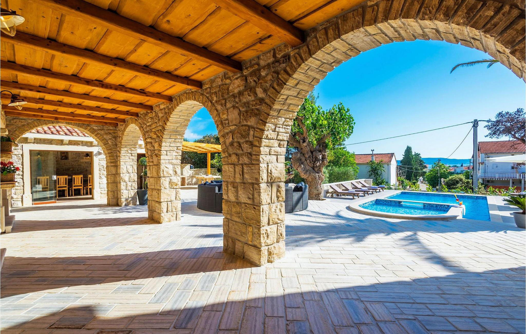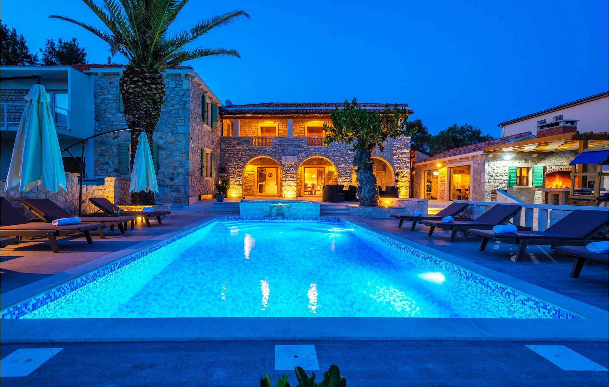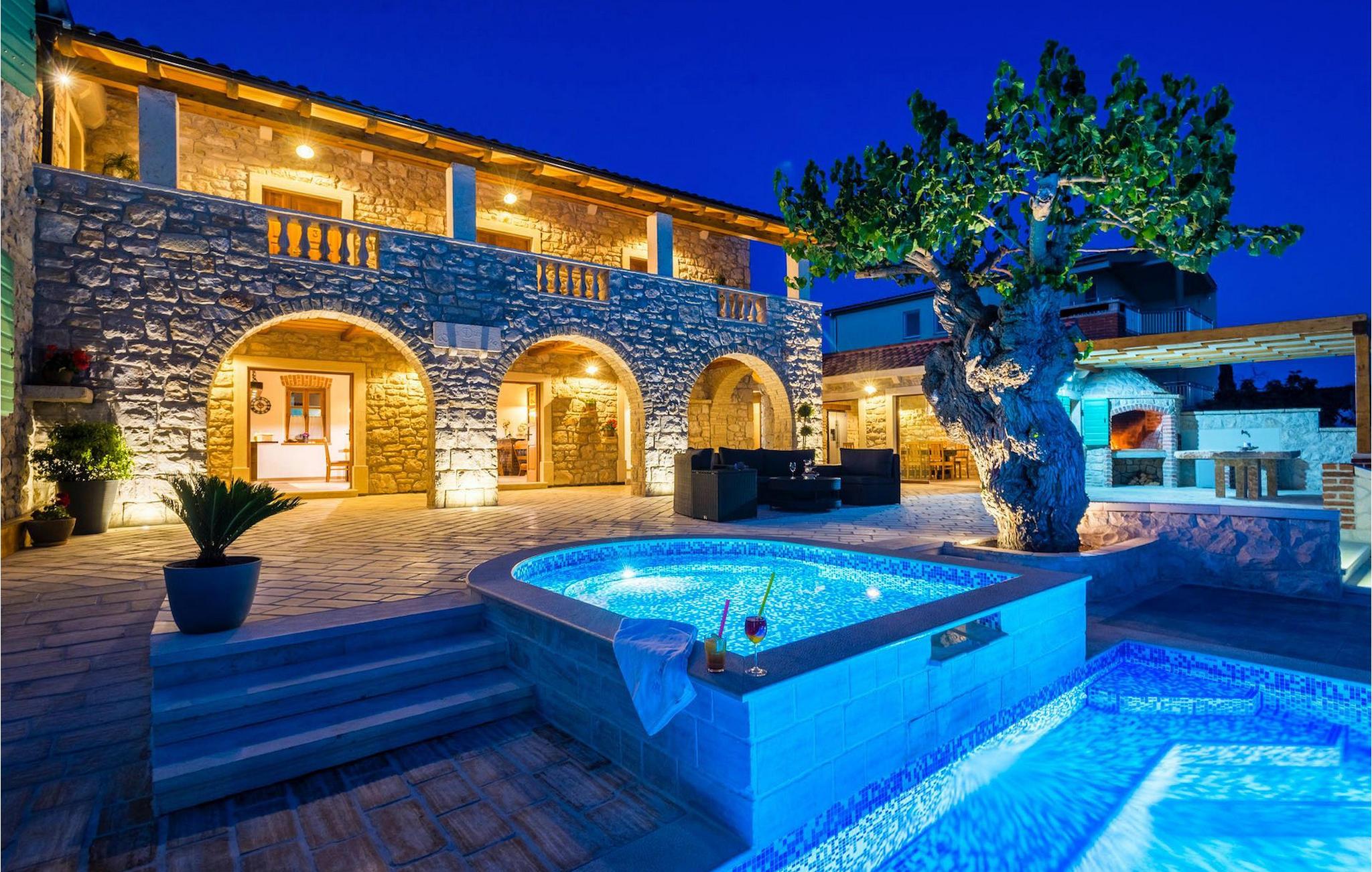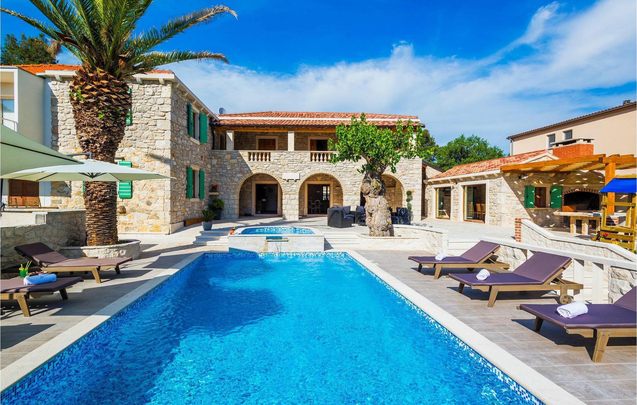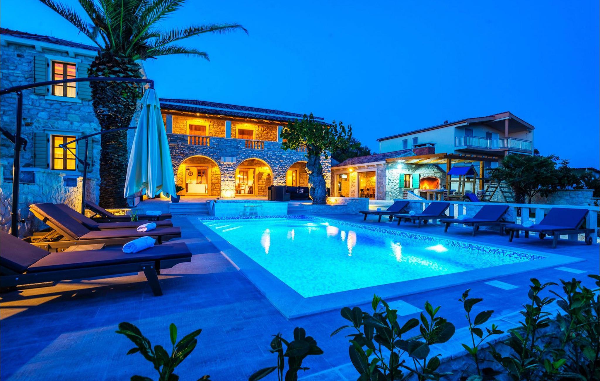 Das Erdgeschoss verfügt über eine schöne offene Lounge, Ess-und Küchenbereich, mit Holzbalken, rustikalen Möbeln und Kamin, der für eine warme, einladende Atmosphäre sorgt. Große Türen öffnen direkt auf die Außenterrassen und den Poolbereich und schaffen ein nahtloses Outdoor-Erlebnis. Im Erdgeschoss befindet sich auch ein großes Doppelzimmer mit en-suite Badezimmer, aber auch ein privater Fitnessraum mit moderner Sauna und separater Dusche und WC. Es gibt vier Doppelzimmer mit eigenem Bad im Obergeschoss, mit eigenem Zugang zu einer sehr romantischen Panoramaterrasse mit Blick auf die Inseln und die kristallklare Adria.Villa Dumina liegt in der kleinen Ortschaft Sukosan, nur eine kurze Autofahrt von Zadar entfernt. Zadar ist eine alte sehenswerte Stadt reich an Kulturerbe und historischen Attraktionen. Der berühmte Alfred Hitchcock sagte, in Zadar sei der schönste Sonnenuntergang - verpassen Sie ihn nicht!
