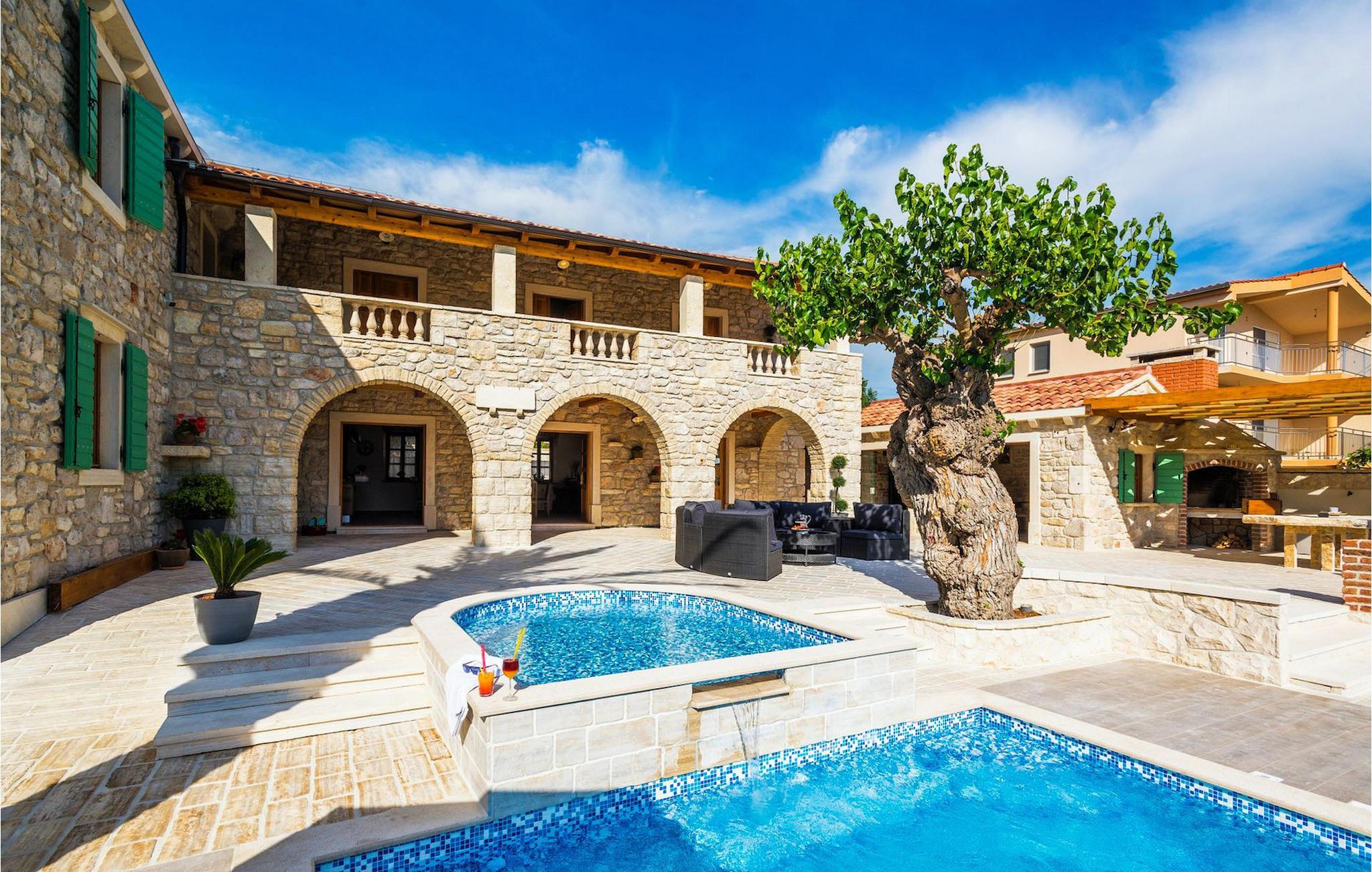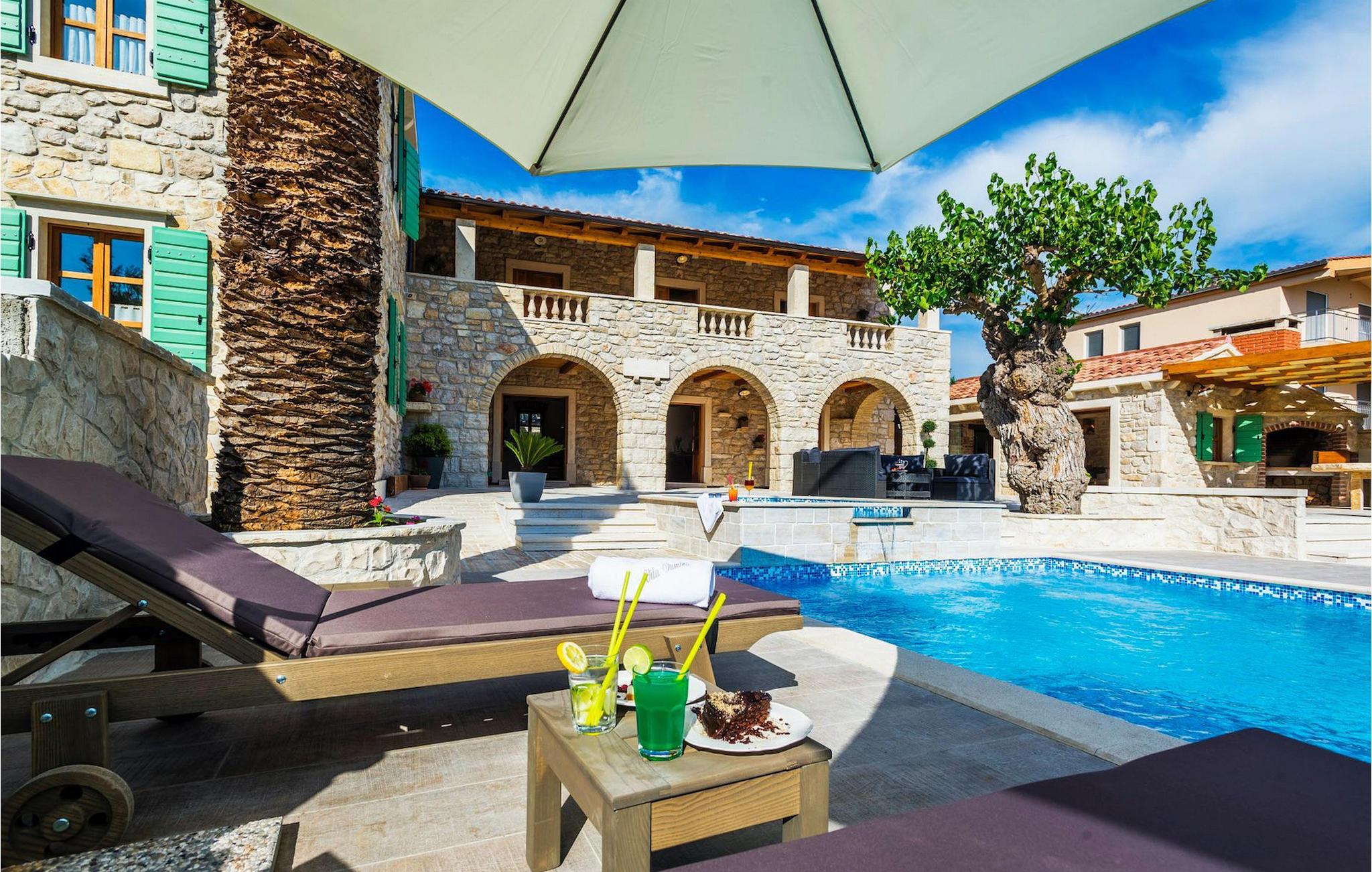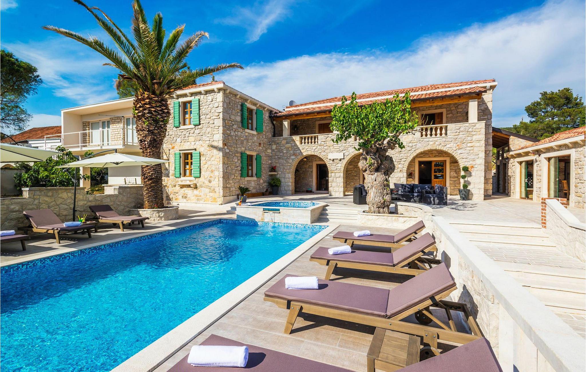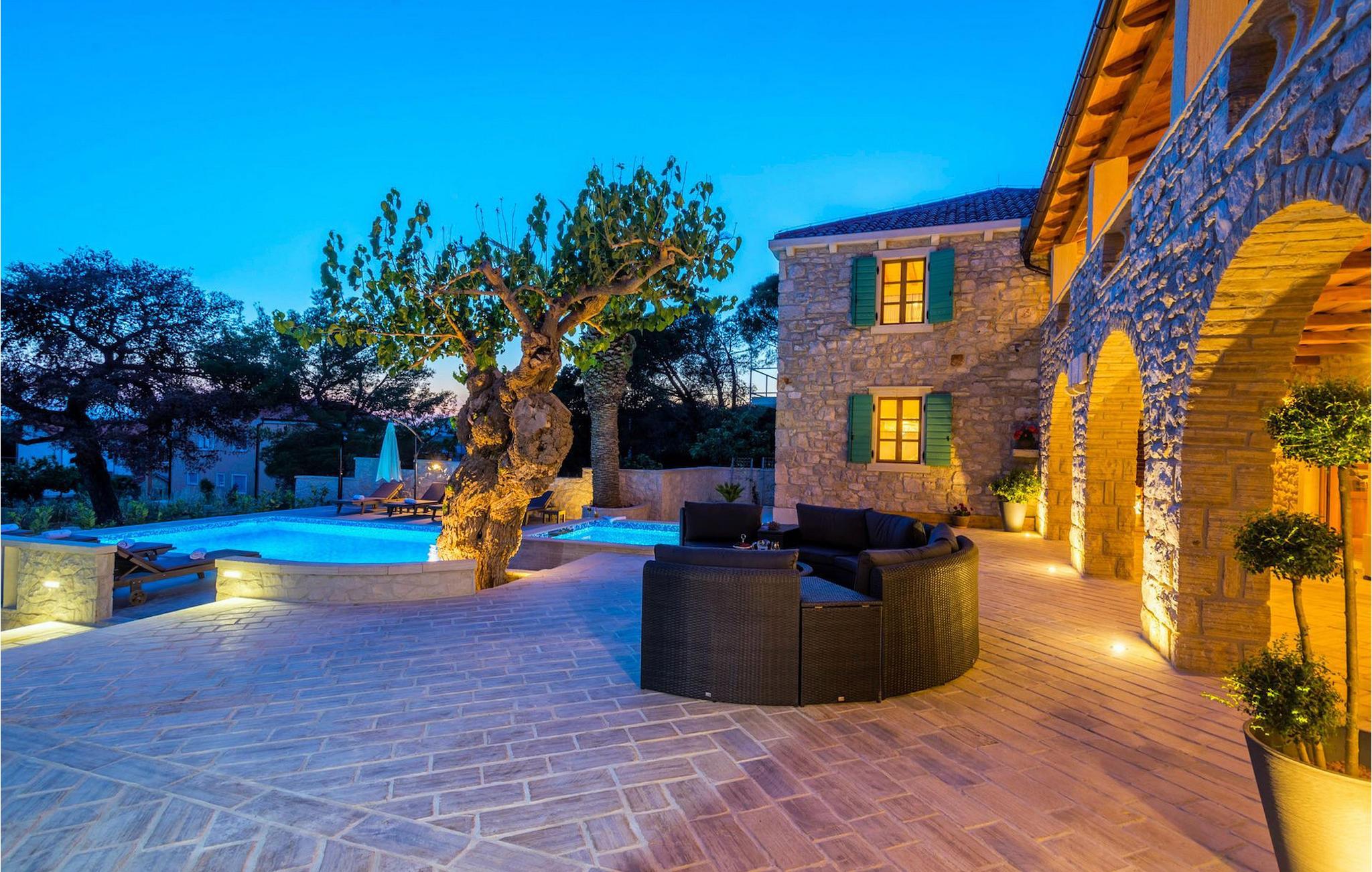 Das Erdgeschoss verfügt über eine schöne offene Lounge, Ess-und Küchenbereich, mit Holzbalken, rustikalen Möbeln und Kamin, der für eine warme, einladende Atmosphäre sorgt. Große Türen öffnen direkt auf die Außenterrassen und den Poolbereich und schaffen ein nahtloses Outdoor-Erlebnis. Im Erdgeschoss befindet sich auch ein großes Doppelzimmer mit en-suite Badezimmer, aber auch ein privater Fitnessraum mit moderner Sauna und separater Dusche und WC. Es gibt vier Doppelzimmer mit eigenem Bad im Obergeschoss, mit eigenem Zugang zu einer sehr romantischen Panoramaterrasse mit Blick auf die Inseln und die kristallklare Adria.Villa Dumina liegt in der kleinen Ortschaft Sukosan, nur eine kurze Autofahrt von Zadar entfernt. Zadar ist eine alte sehenswerte Stadt reich an Kulturerbe und historischen Attraktionen. Der berühmte Alfred Hitchcock sagte, in Zadar sei der schönste Sonnenuntergang - verpassen Sie ihn nicht!