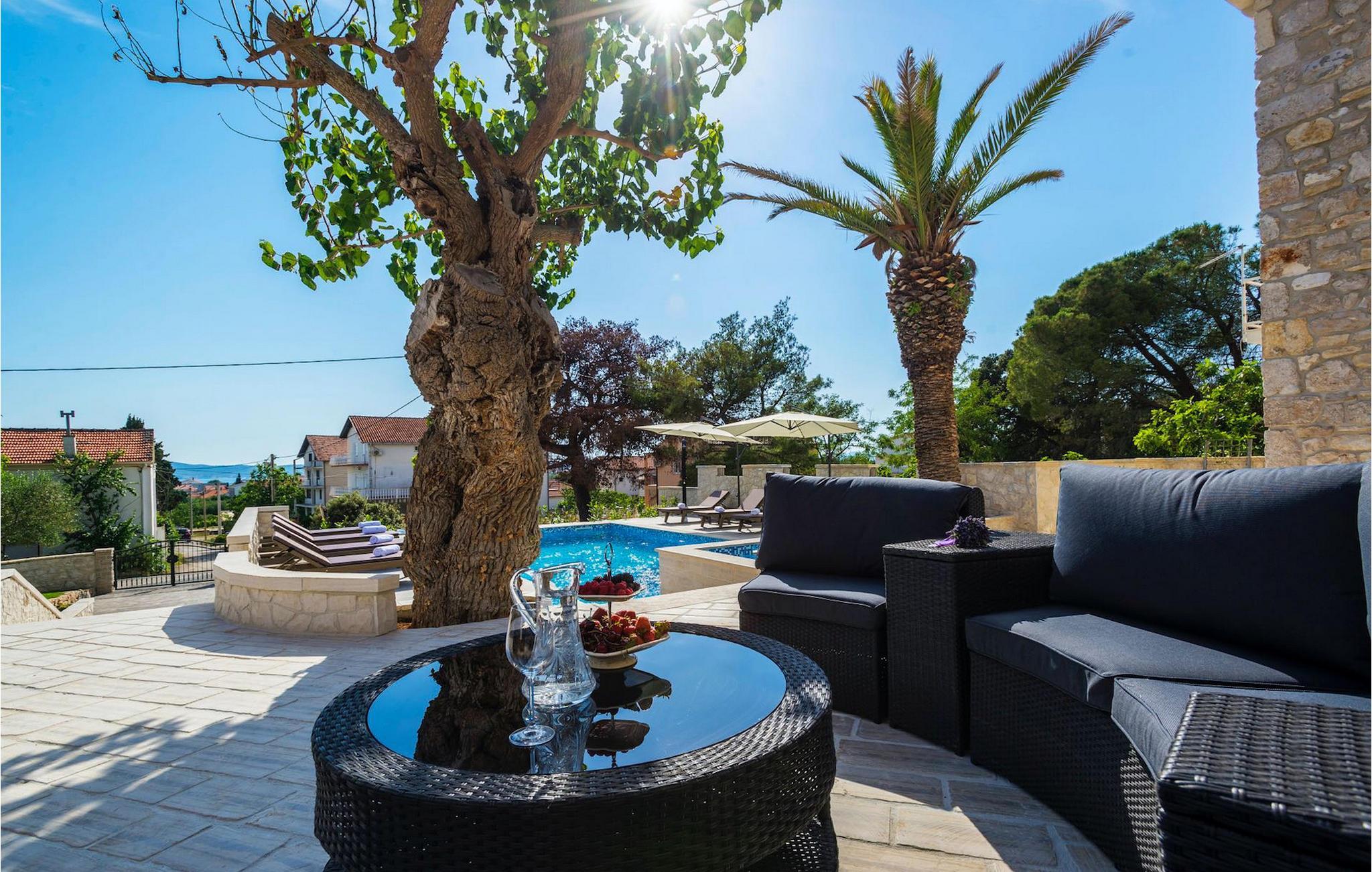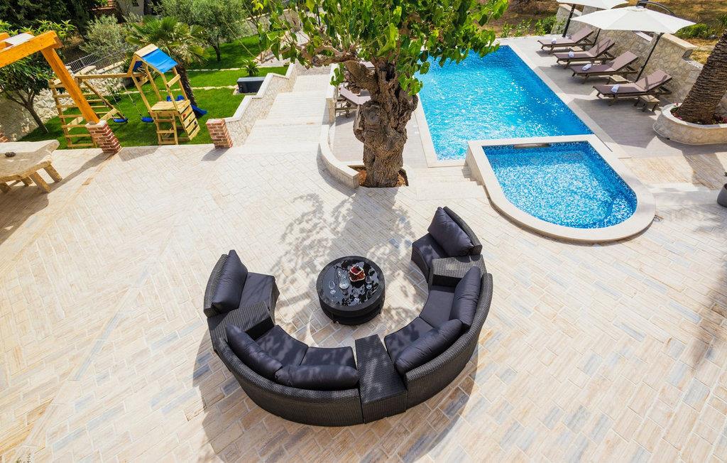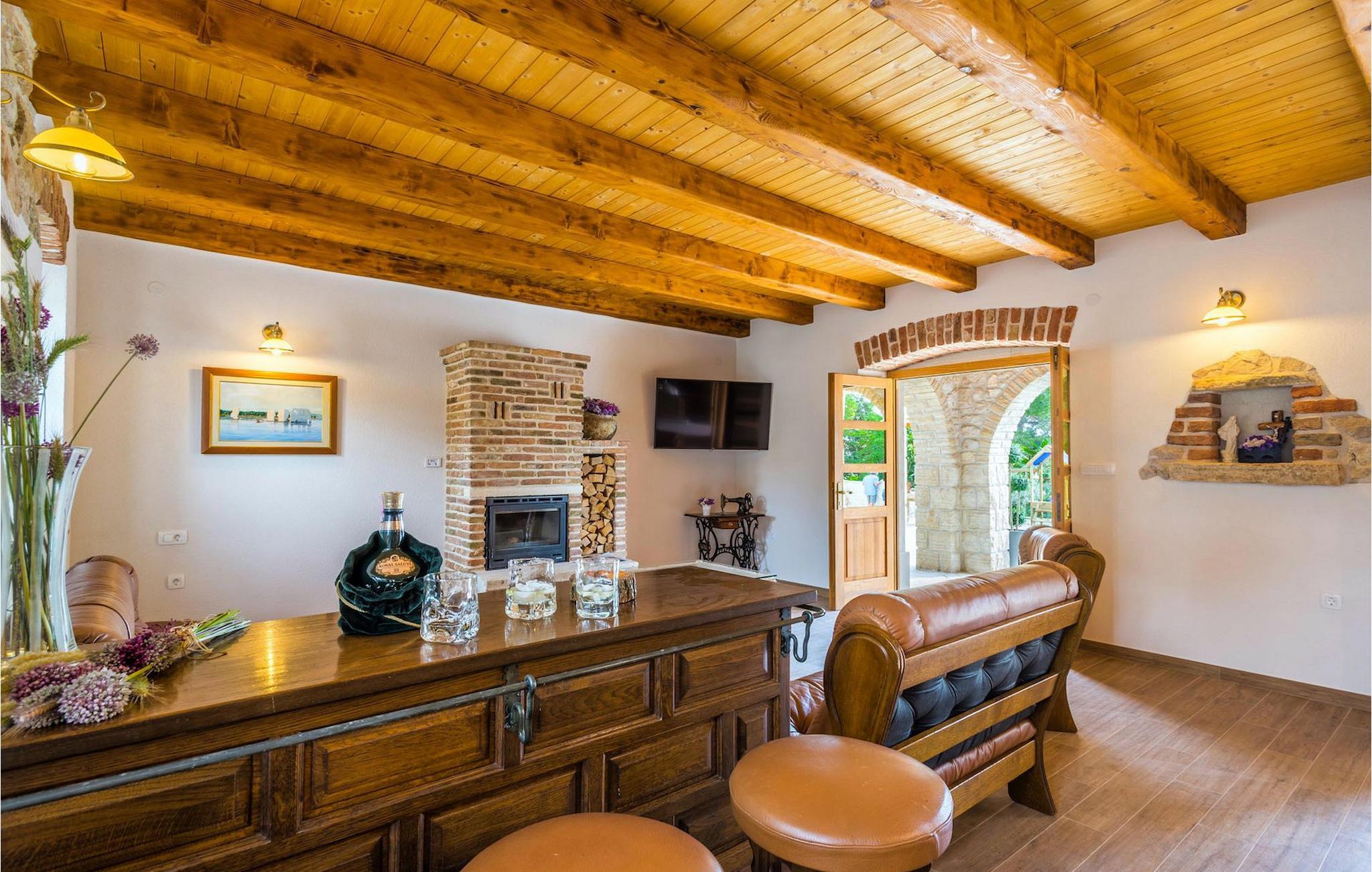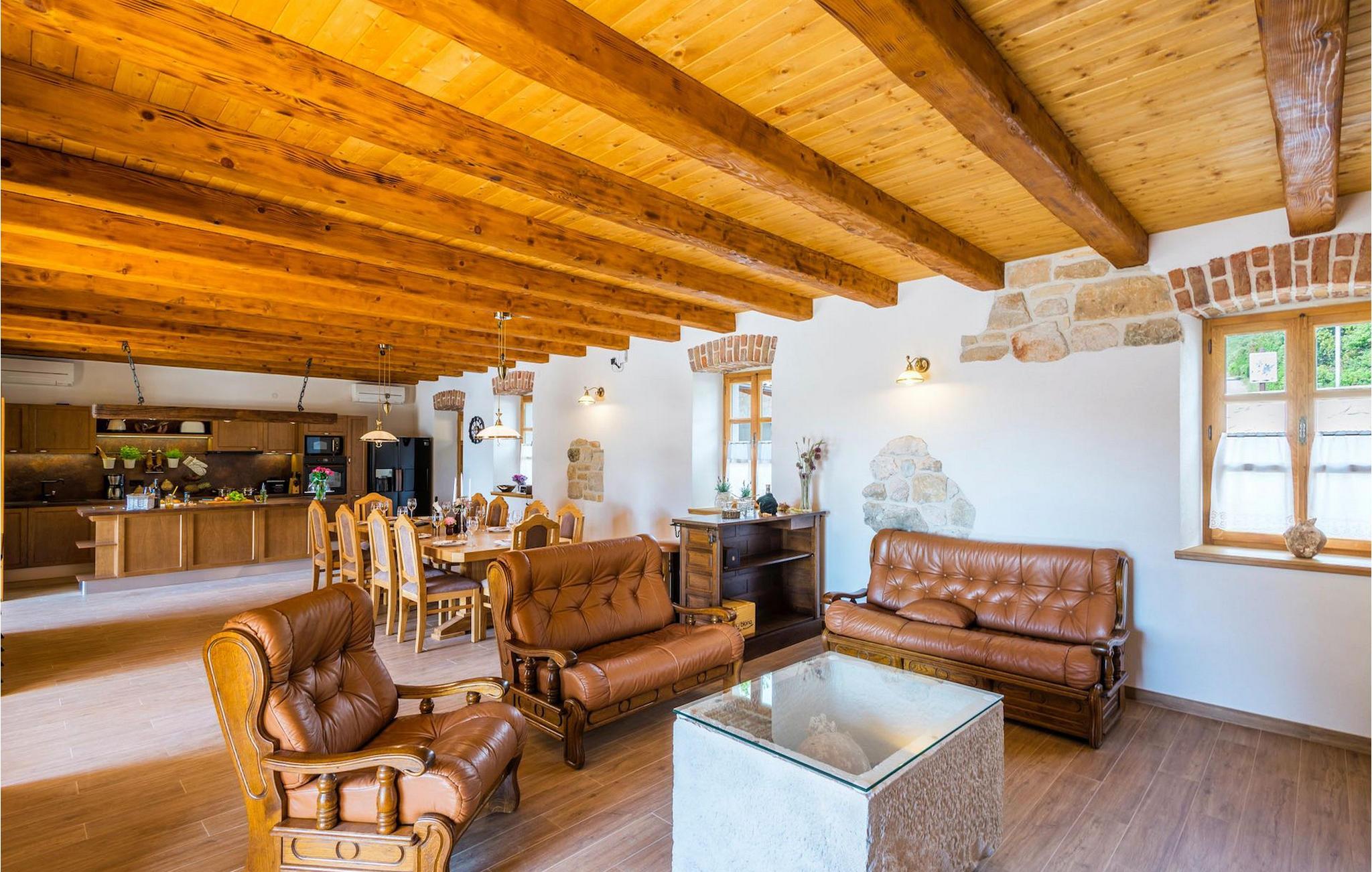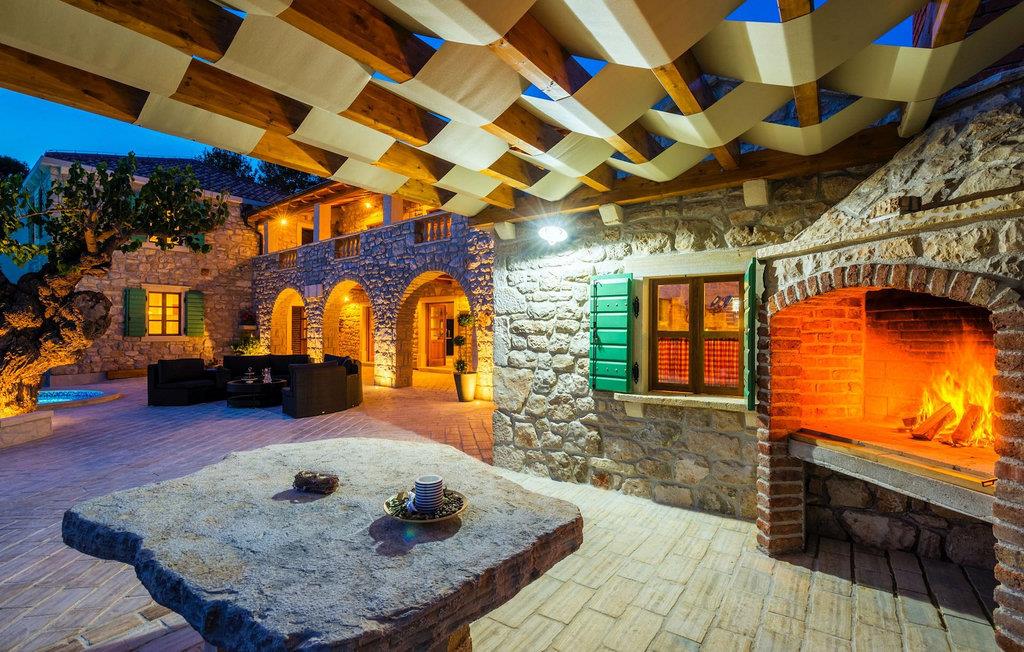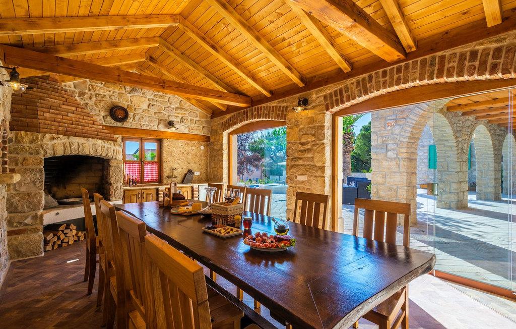 Das Erdgeschoss verfügt über eine schöne offene Lounge, Ess-und Küchenbereich, mit Holzbalken, rustikalen Möbeln und Kamin, der für eine warme, einladende Atmosphäre sorgt. Große Türen öffnen direkt auf die Außenterrassen und den Poolbereich und schaffen ein nahtloses Outdoor-Erlebnis. Im Erdgeschoss befindet sich auch ein großes Doppelzimmer mit en-suite Badezimmer, aber auch ein privater Fitnessraum mit moderner Sauna und separater Dusche und WC. Es gibt vier Doppelzimmer mit eigenem Bad im Obergeschoss, mit eigenem Zugang zu einer sehr romantischen Panoramaterrasse mit Blick auf die Inseln und die kristallklare Adria.Villa Dumina liegt in der kleinen Ortschaft Sukosan, nur eine kurze Autofahrt von Zadar entfernt. Zadar ist eine alte sehenswerte Stadt reich an Kulturerbe und historischen Attraktionen. Der berühmte Alfred Hitchcock sagte, in Zadar sei der schönste Sonnenuntergang - verpassen Sie ihn nicht!