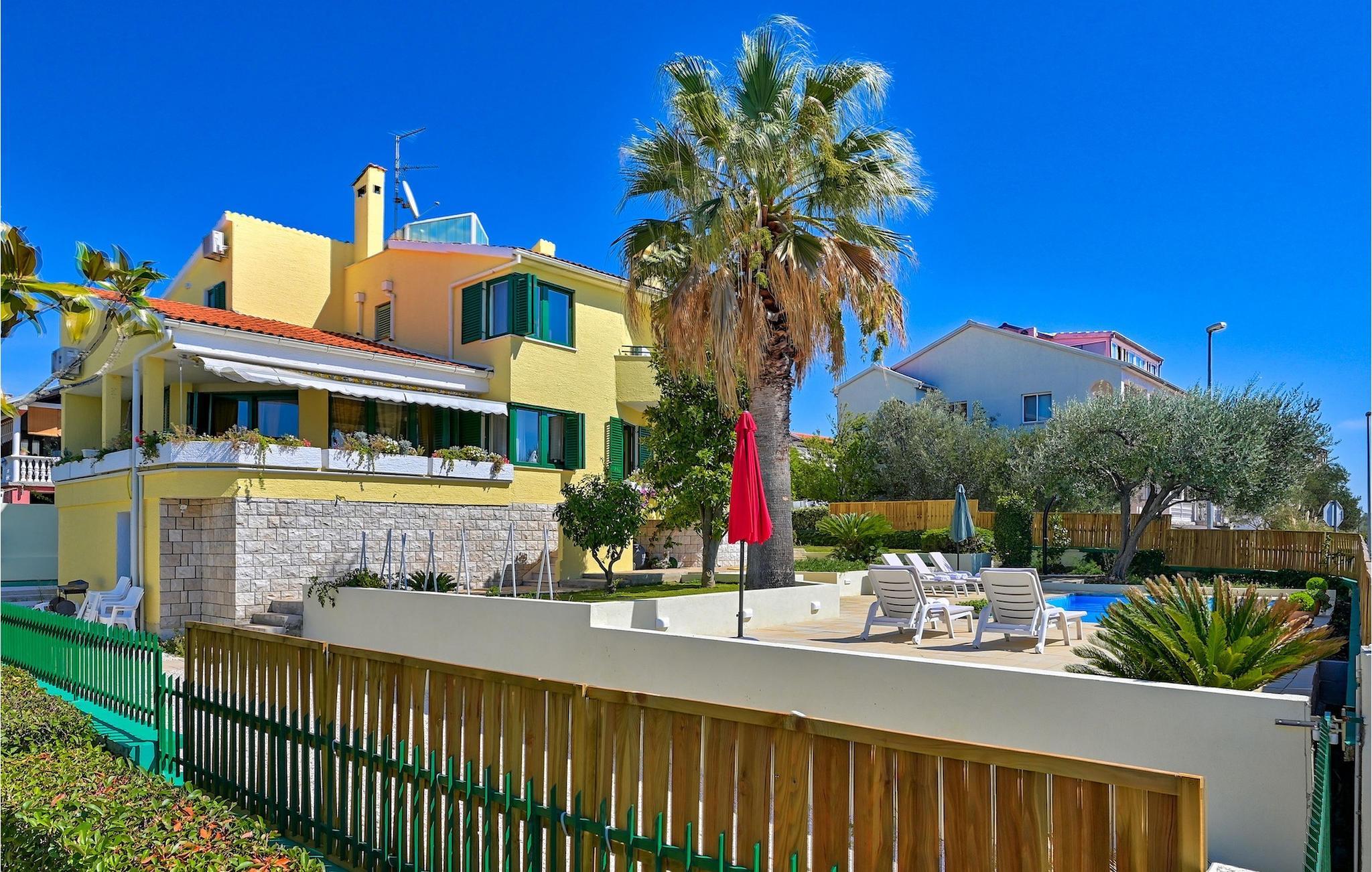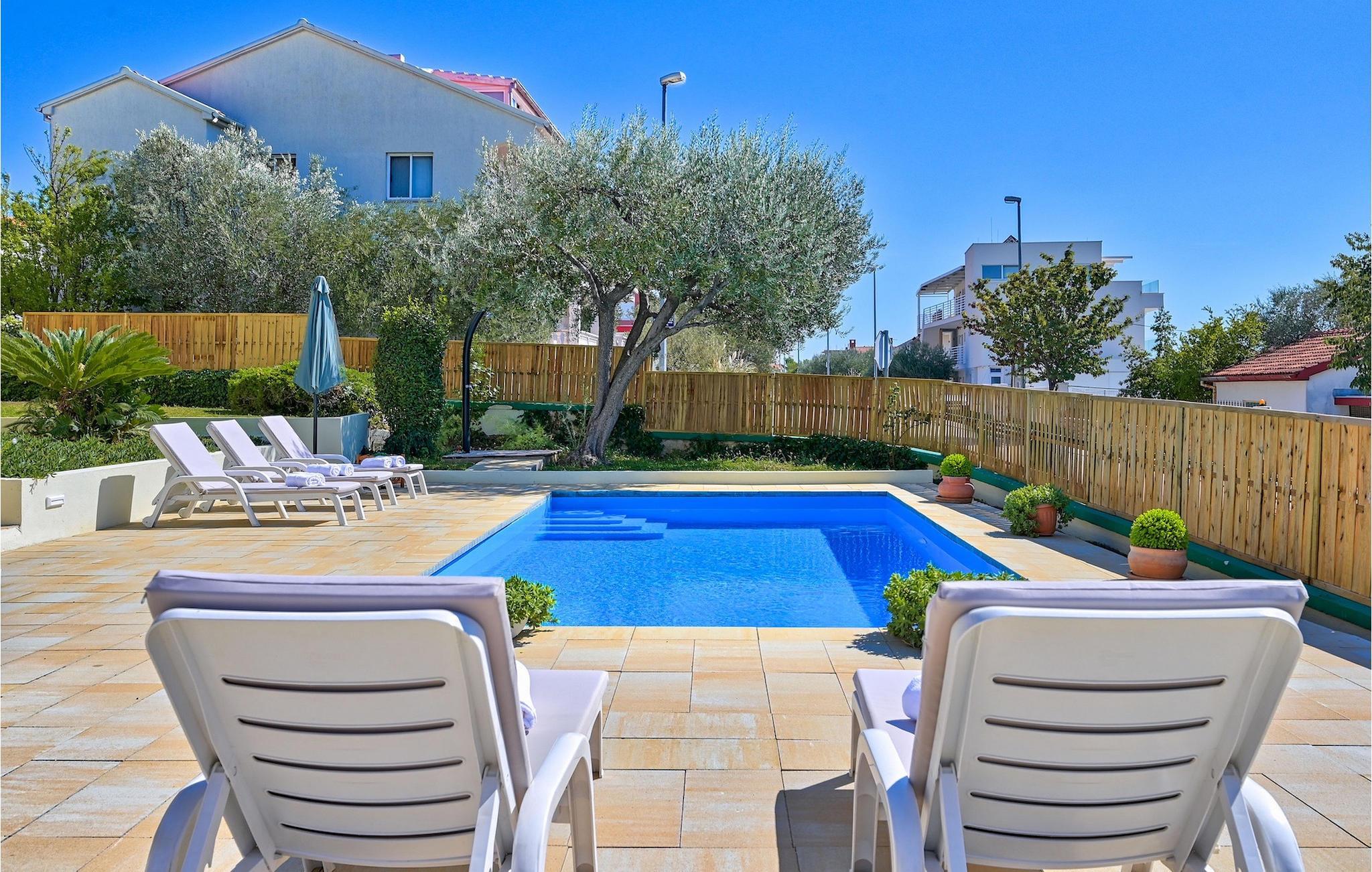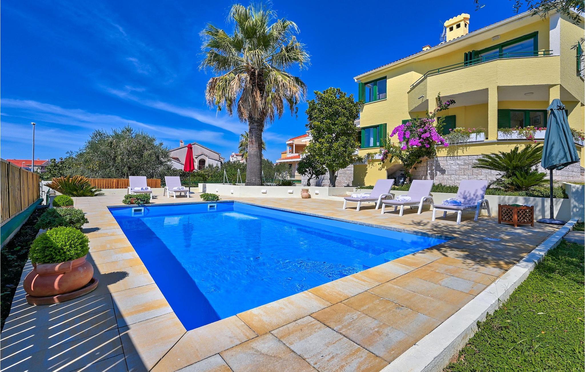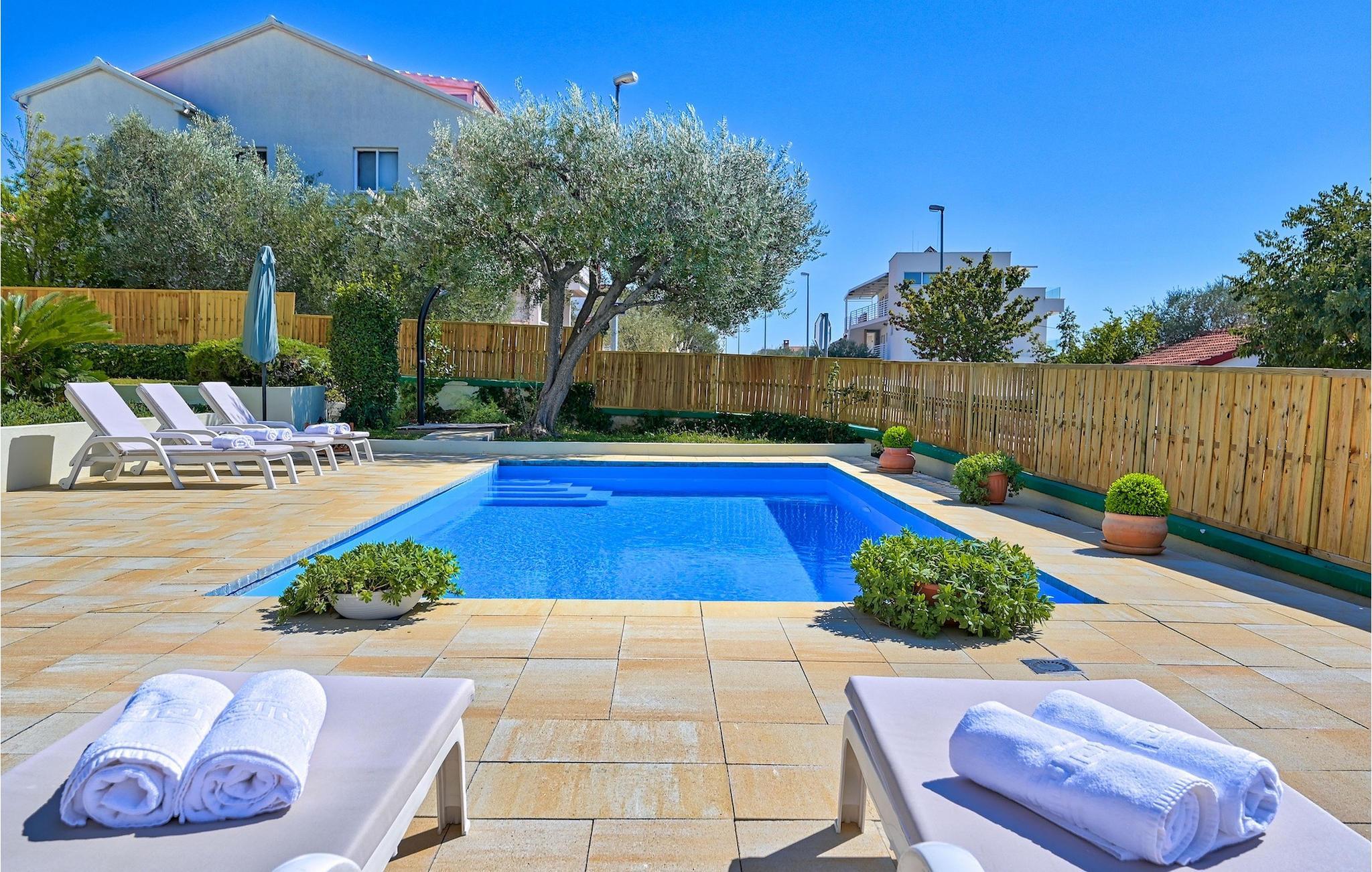 Wenn Sie Ihren Urlaub in einer wunderschönen Villa in der Stadt Zadar verbringen möchten, buchen Sie unbedingt die Villa Oscar. Die charmante Villa Oscar bietet Platz für insgesamt 9 Personen in einer komfortablen Umgebung. Sie ist in Erdgeschoss, ersten Stock und Dachboden mit Terrasse unterteilt. Das Erdgeschoss der Villa verfügt über eine voll ausgestattete Küche mit Essbereich, ein Wohnzimmer mit Terrasse, drei Schlafzimmer eigener Terrasse, zwei Badezimmer und einen Massageraum. Im ersten Stock gibt es ein Wohnzimmer, eine voll ausgestattete Küche mit Essbereich, eine Terrasse, 3 Schlafzimmer mit Terrasse und ein Badezimmer. Auf dem Dachboden der Villa befindet sich eine große Terrasse mit herrlichem Panoramablick. Im wunderschön gestalteten Innenhof befinden sich ein privater Pool sowie Liegestühle, auf denen Sie sich entspannen können. Im Innenhof der Villa gibt es einen Bereich für Mini-Fußball für Kinder. Außerdem stehen Schläger für Badminton und Squash und einen Boxsack zu Verfügung. In einem Raum befinden sich eine Tischtennisplatte, Tischfußball und Darts. Erkunden Sie unbedingt die Stadt Zadar und die sie umgebende Natur. Buchen Sie die Villa Oskar und genießen Sie ihren wohlverdienten Urlaub.Die Villa Oscar befindet sich nur 5 Autominuten vom Zentrum von Zadar entfernt. Die ausgezeichnete Lage der Villa bietet ihren Gästen die Möglichkeit, die berühmten Sehenswürdigkeiten von Zadar zu Fuß zu besuchen, da sie nur wenige Minuten von der Villa entfernt sind. Besuchen Sie die Altstadt von Zadar und spazieren Sie durch die engen Gassen bis hin zur Küste, wo Sie den Klang der Meeresorgel hören werden. Spazieren Sie entlang der Küste und genießen Sie ein Eis und gleichzeitig den schönsten Sonnenuntergang am Mittelmeer. Wenn Sie echte dalmatinische Spezialitäten probieren wollen, sollten Sie unbedingt die Restaurants im Stadtzentrum besuchen. Berühmte Strände wie die Strände Borik und Uskok sind nur 1 km von der Villa entfernt. Besuchen Sie die nahe gelegenen Inseln des Zadarer Archipels, die wegen ihrer unberührten Natur, den schönen Kieselstränden und dem kristallklaren Meer besonders sind. Alle Liebhaber von Naturschönheiten sollten den Nationalpark Kornati,, eine Inselgruppe mit zahlreichen versteckten Buchten und Stränden, oder den Nationalpark Krka im Landesinneren besuchen, der für seine zahlreichen Wasserfälle und Kaskaden bekannt ist.