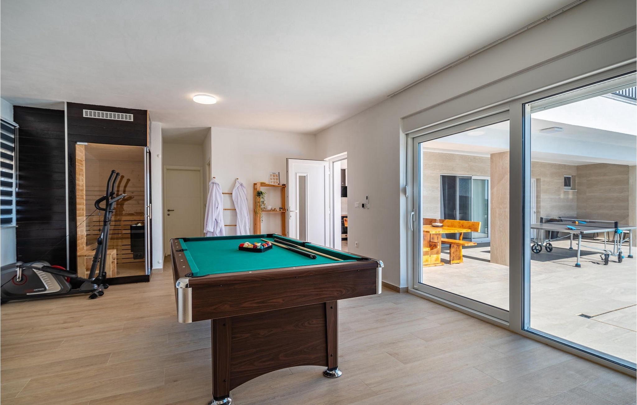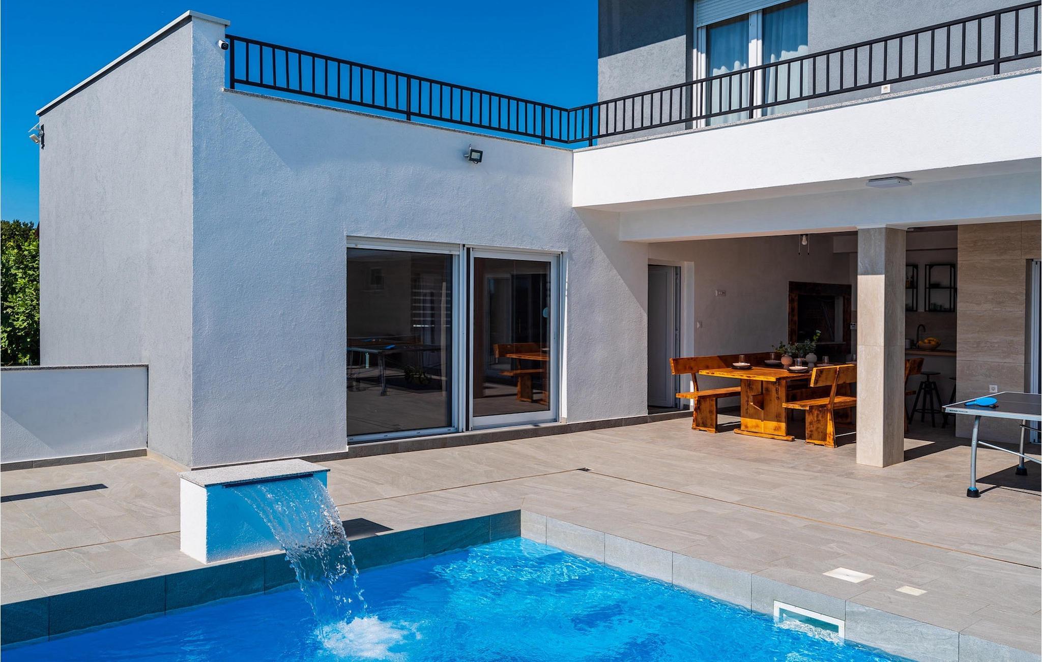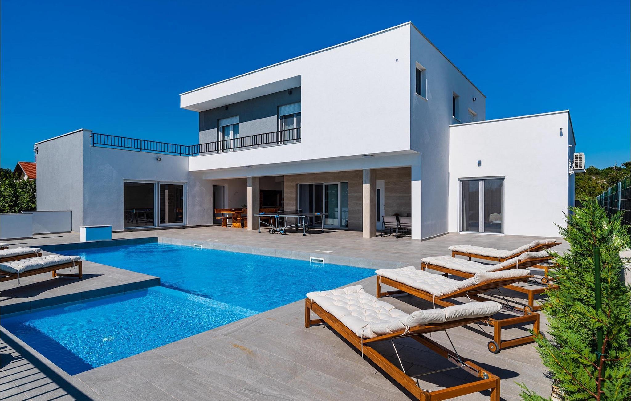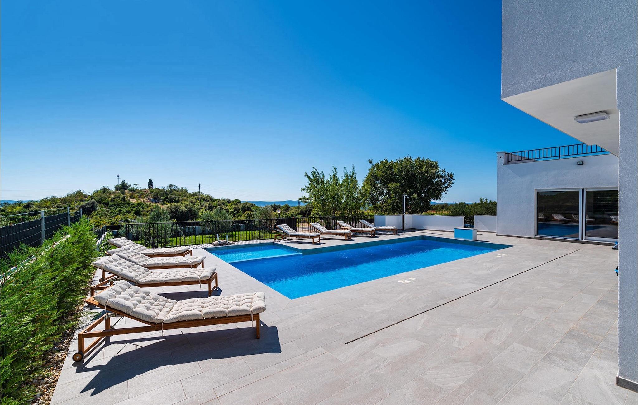 Sie wünschen sich einen erholsamen Urlaub, Ruhe und Komfort fernab des Alltags? Dann sind Sie in der Villa Tea Polaca nahe Zadar für bis zu 10 Gäste genau richtig! Dieses elegant und modern gestaltete Ferienhaus mit 5 Zimmern bietet Ihnen alles, was Sie für einen unvergesslichen Urlaub in Dalmatien mit Familie und Freunden benötigen. Das Herzstück der Villa Tea Polaca bildet der 40m2 große erfrischende Swimming-Pool, wo Sie sicherlich die meiste Zeit verbringen werden. Machen Sie es sich mit einem kühlen Getränk auf einer der Sonnenliegen bequem, während in der offenen Sommerküche das Familienessen am Holzkohlegrill zubereitet wird. Dabei haben Sie auch die Kinder im Blick, die im Garten toben, Tischtennis spielen oder ein Turnier am Kickertisch austragen. Verbringen Sie warme Sommerabende gemeinsam mit der ganzen Familie am großen Esstisch auf der überdachten Terrasse. Im Nebenobjekt sorgt der Orbitrek für Ihre Fitness und die Sauna für etwas Entspannung. Ein zusätzliches Badezimmer mit Dusche steht Ihnen hier zur Verfügung. Betreten Sie das voll klimatisierte Interieur der Villa Tea Polaca vom Außenbereich aus, so gelangen Sie in das helle Wohnzimmer mit TV. Daran schließen sich die voll ausgestattete Küche und der Essbereich, sowie eine Gästetoilette an. Auf der gleichen Ebene befinden sich außerdem 2 komfortable Doppelschlafzimmer, jeweils mit eigenem ensuite Badezimmer. Über die Treppe gelangen Sie zu weiteren 3 schönen Schlafzimmern, die jeweils über ein Doppelbett verfügen. Auch diese Schlafzimmer haben jeweils ein eigenes Badezimmer mit Dusche. Jedes Schlafzimmer hat einen TV und Klimaanlage. Hier gelangen Sie auch zum Balkon, der ein wenig Privatsphäre bietet und von dem aus Sie einen wunderbaren Ausblick auf die Umgebung oder den klaren Sternenhimmel am Abend genießen können. Gönnen Sie sich un Ihren Liebsten nur das Beste, buchen Sie gleich und verbringen Sie Ihren Traumurlaub in Dalmatien in der fantastischen Villa Tea Polaca! Die fantastische Villa Tea Polaca liegt im kleinen, ruhigen Dorf Polaca, nur 11km von Biograd na Moru und nicht allzu weit von der berühmten historischen Stadt Zadar entfernt. Die Umgebung der Villa Tea Polaca bietet neben dem nur 11km entfernten Meer eine große Auswahl an Naturschönheiten und kulturellen Sehenswürdigkeiten. Die Städte Zadar und Sibenik voller Kultur und Geschichte sind auf jeden Fall einen Besuch wert. Der berühmte Touristenort Biograd na Moru bietet unzählige Aktivitäten, Restaurants und Strände sowie den Fun Park Mirnovec, falls Sie Lust auf ein wenig Adrenalin haben. Mehrere Nationalparks stehen Ihnen in dieser Region zur Auswahl: Kornati, Krka, Paklenica, Naturpark Nordvelebit und der Vransko See. Naturliebhaber werden sich nur schwer entscheiden können. Picken Sie sich von allem etwas heraus und genießen Sie Ihren Urlaub in vollen Zügen. Die Temperatur des beheizten Schwimmbades hängt von äußeren Faktoren, einschließlich der Wetterbedingungen, ab und daher kann die Wassertemperatur nicht garantiert werden.