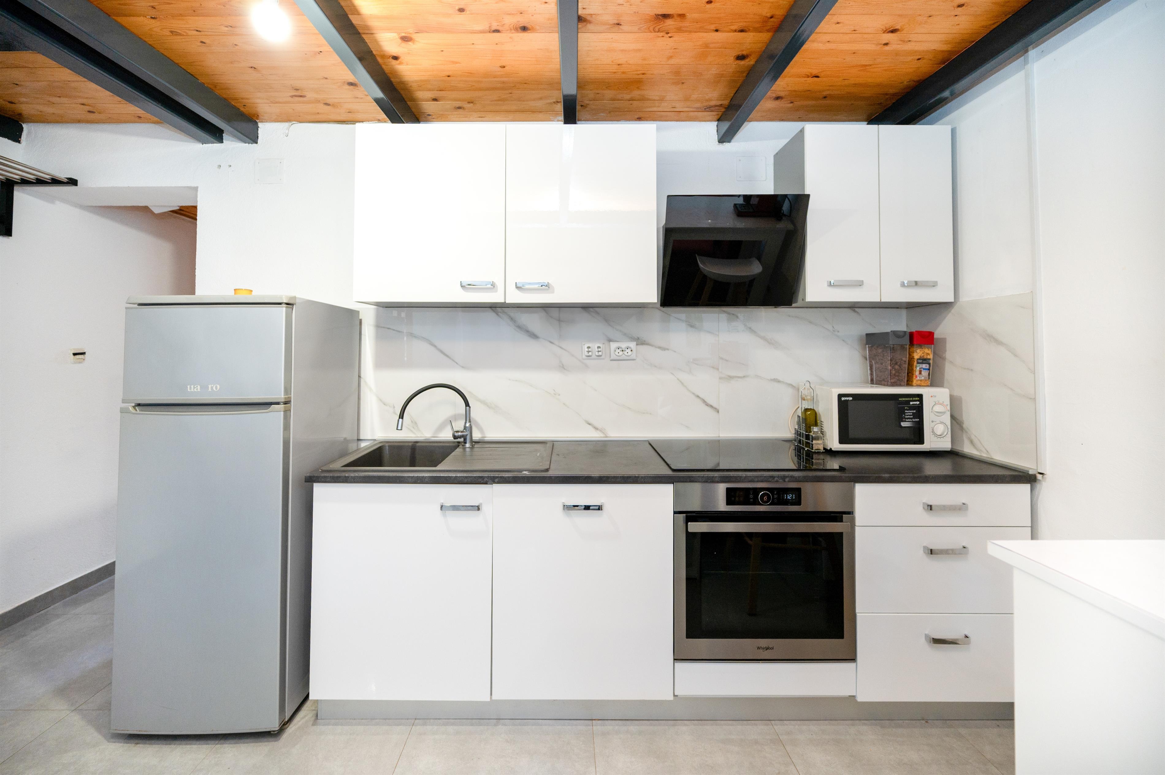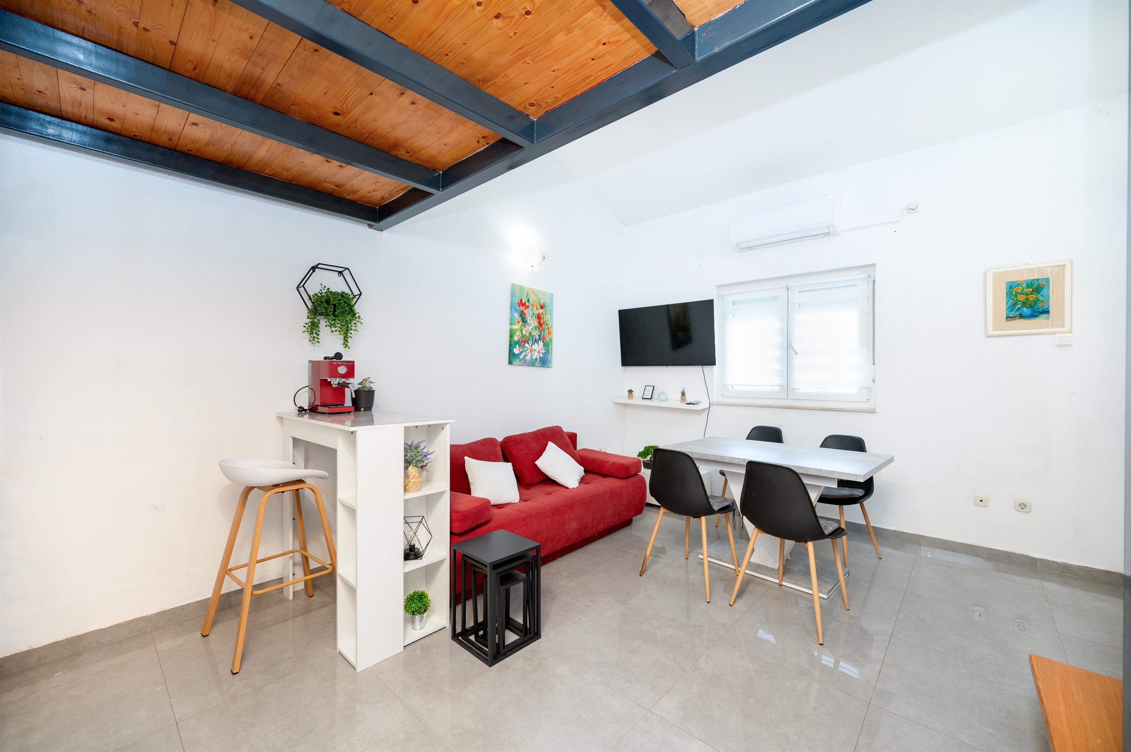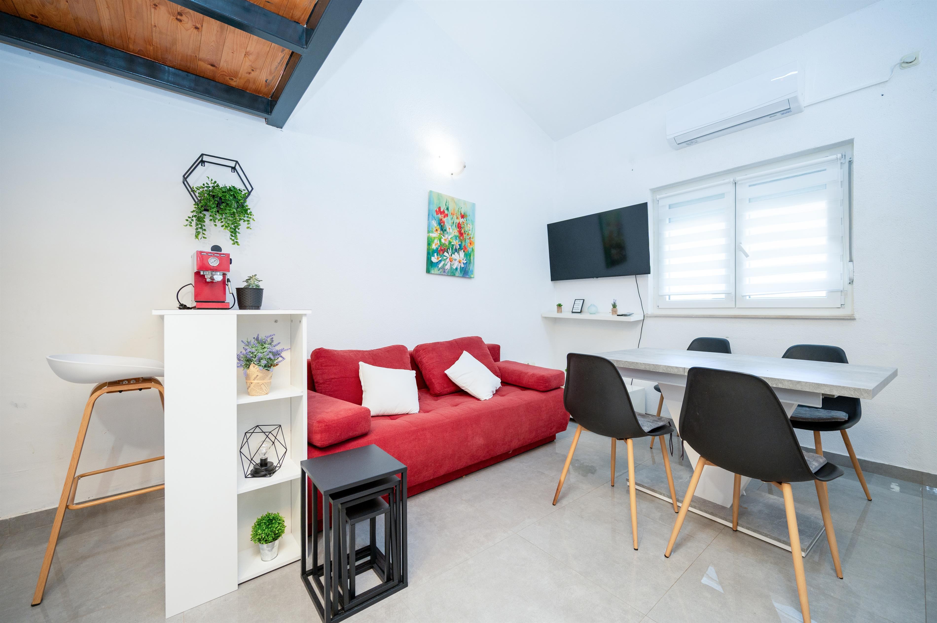 Apartment can accommodate 5 guests. Beds are situated in 2 sleeping rooms, but also in the living room, within 48m2. Food can be prepared using barbecue which is shared with other guests too. Reserved accommodation unit has a shared terrace.