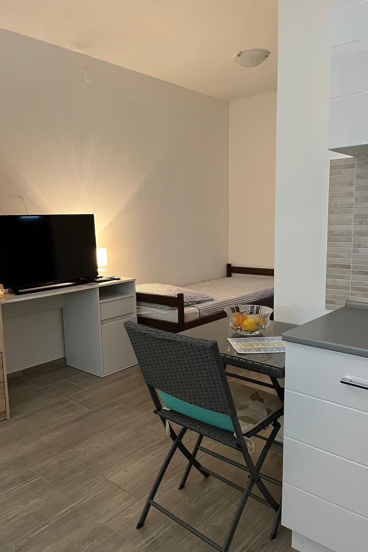 Studio flat can accommodate 2 guests. Beds are situated in 1 sleeping rooms, within 20m2. There is no balcony or terrace in the reserved accommodation unit.
