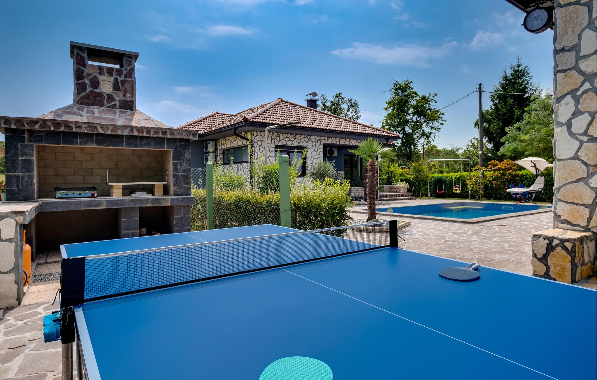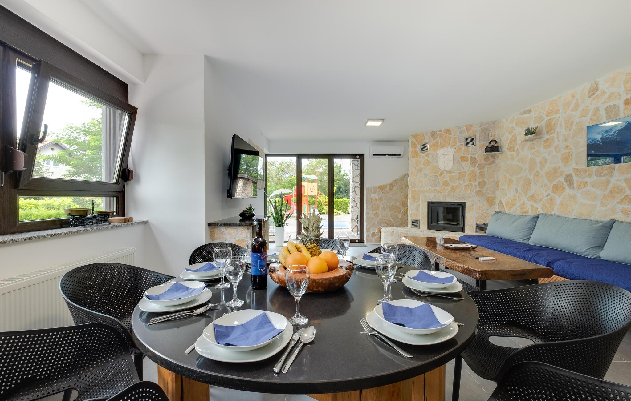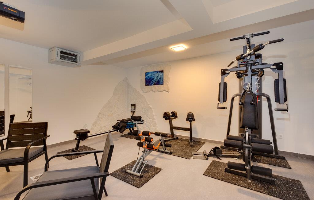 Dieses familienfreundliche Ferienhaus in Jakovlje begeistert mit einer modernen Einrichtung und einer einladenden Atmosphäre. Die offene, komfortable Küche ist ideal für gemeinsame Kochabende, während das helle Wohnzimmer und der gemütliche Essbereich zum Verweilen einladen. Für Unterhaltung ist gesorgt: Im Spielzimmer können sich nicht nur die Kinder beim Videospielen vergnügen, und der Fitnessraum steht für aktive Stunden bereit.