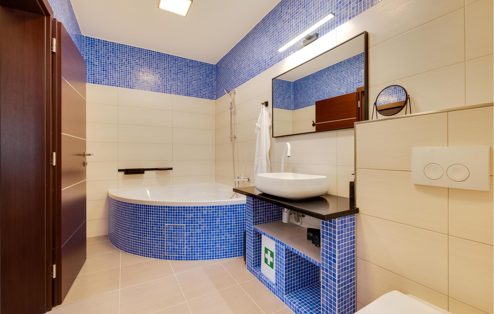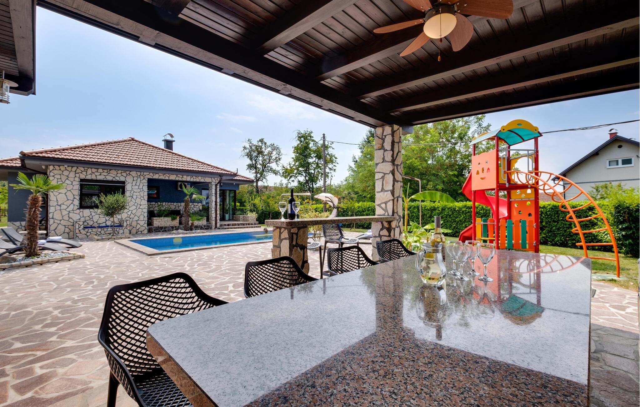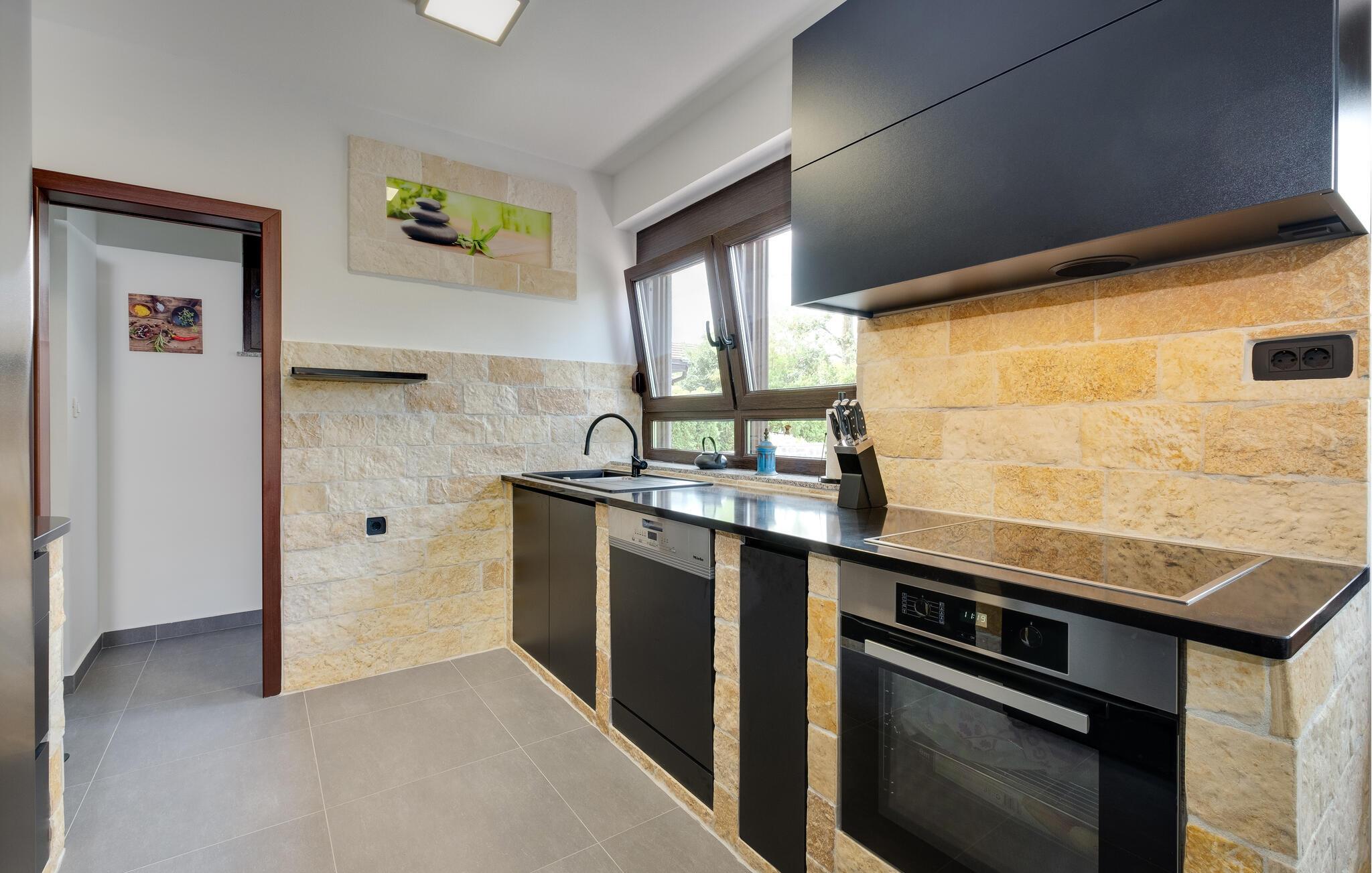 Dieses familienfreundliche Ferienhaus in Jakovlje begeistert mit einer modernen Einrichtung und einer einladenden Atmosphäre. Die offene, komfortable Küche ist ideal für gemeinsame Kochabende, während das helle Wohnzimmer und der gemütliche Essbereich zum Verweilen einladen. Für Unterhaltung ist gesorgt: Im Spielzimmer können sich nicht nur die Kinder beim Videospielen vergnügen, und der Fitnessraum steht für aktive Stunden bereit.