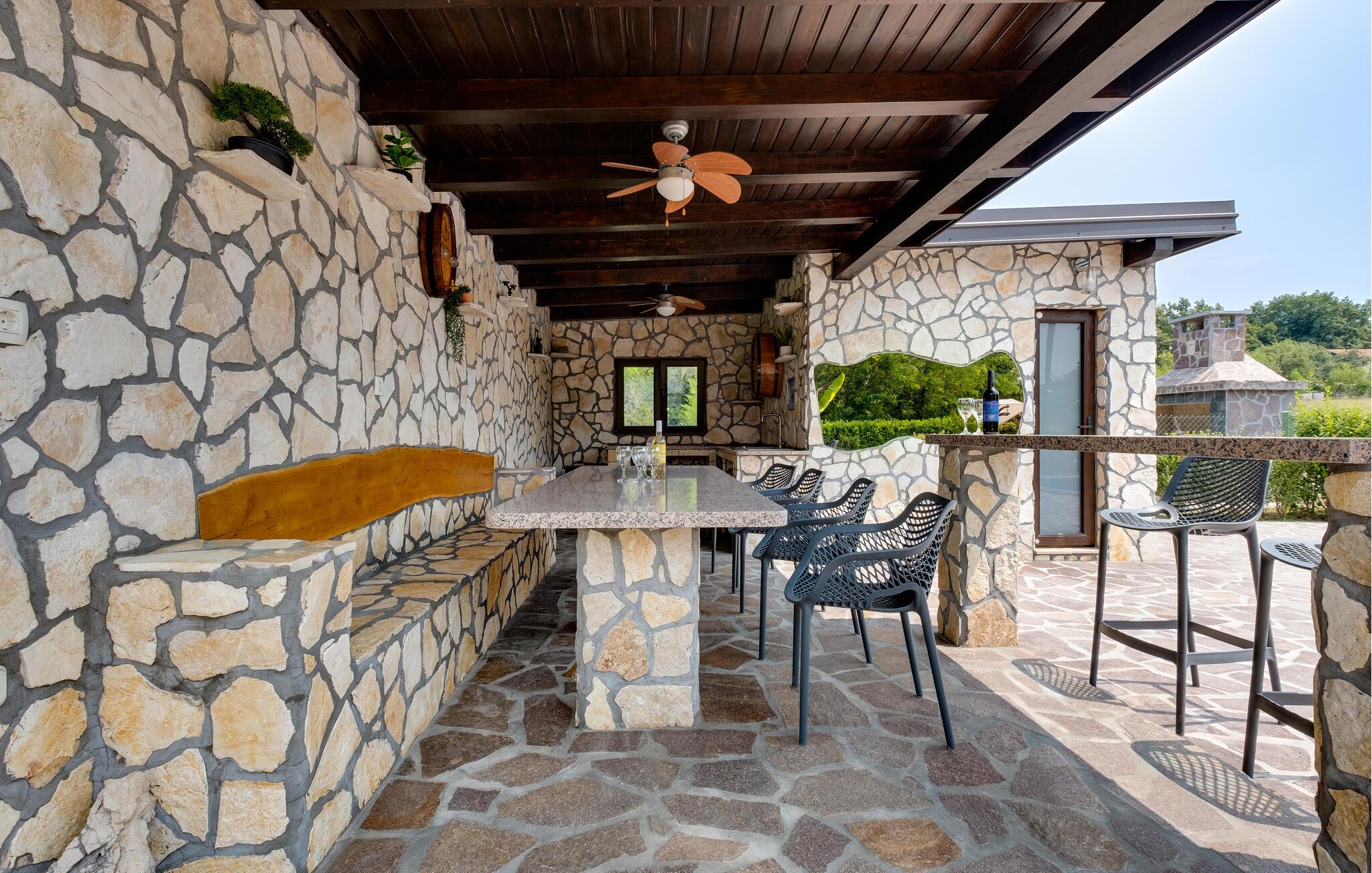 Der großzügige Garten mit Swimmingpool, Sonnendeck und einer überdachten Terrasse bietet viel Platz zum Entspannen, während die Sommerküche perfekt für gesellige Grillabende ist.