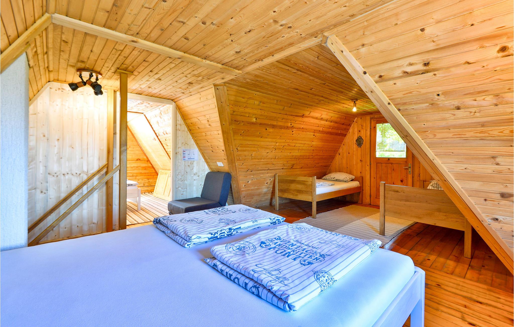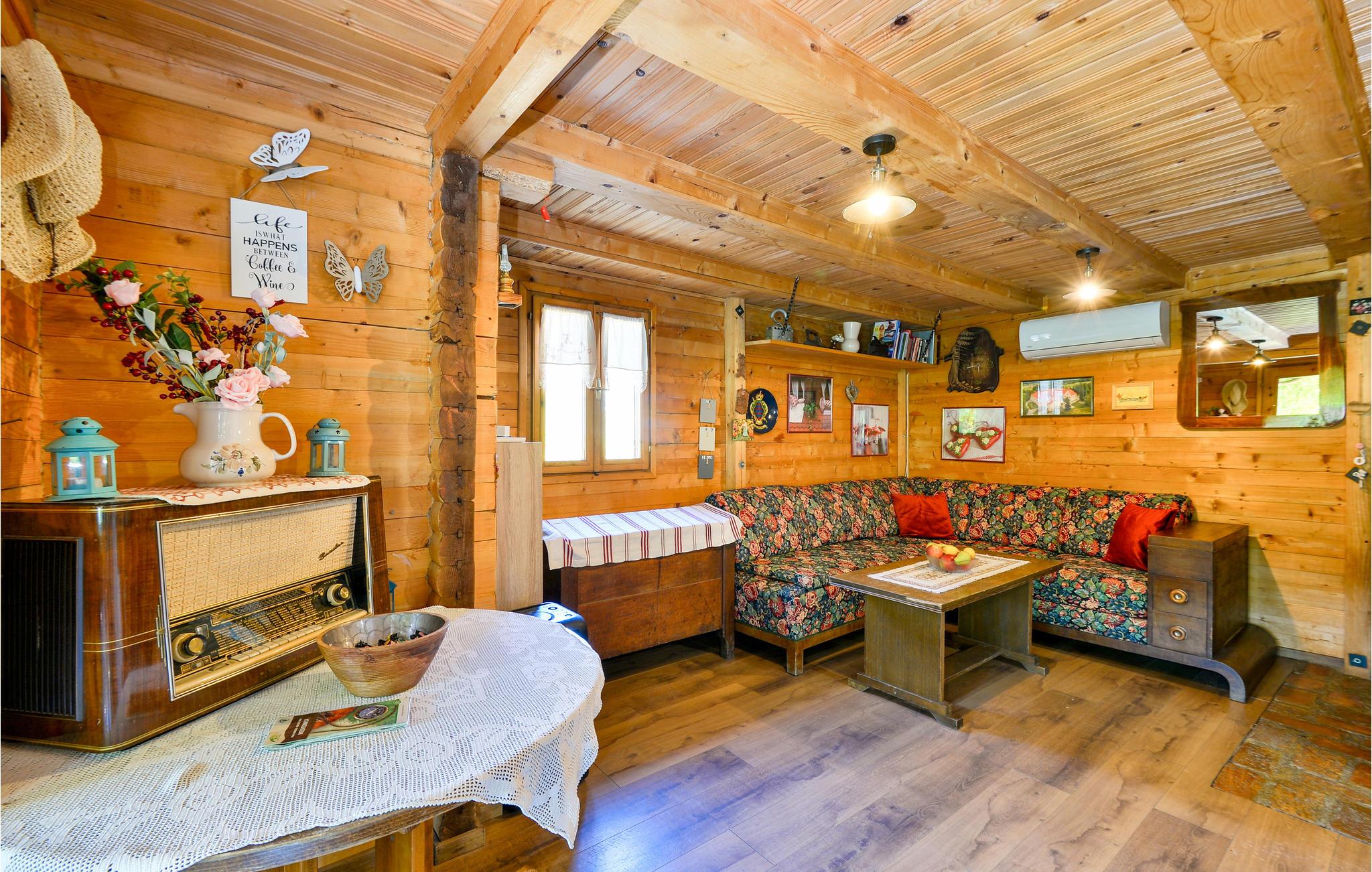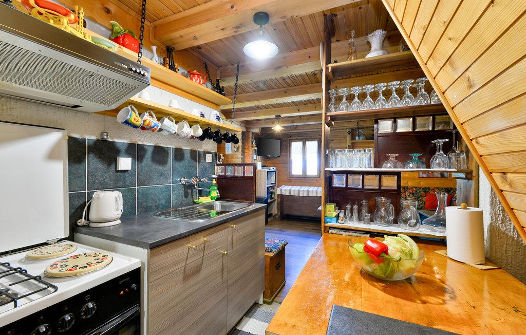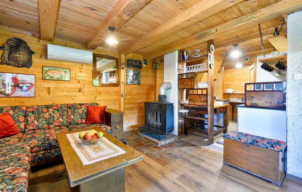Im Haus sind alle Räume im Berghütten-Stil komplett in Holz gebaut, was eine besonders urige Urlaubsstimmung aufkommen lässt. Ziehen Sie sich in die Stube vor den Kamin zurück, freuen Sie während der Mahlzeiten über den Blick durch die große Fensterfront beim Essbereich.