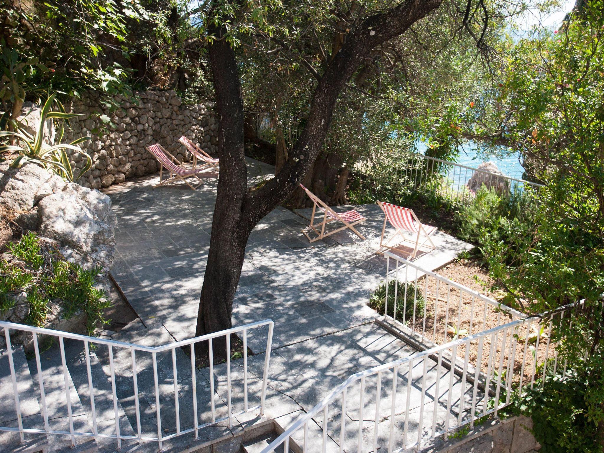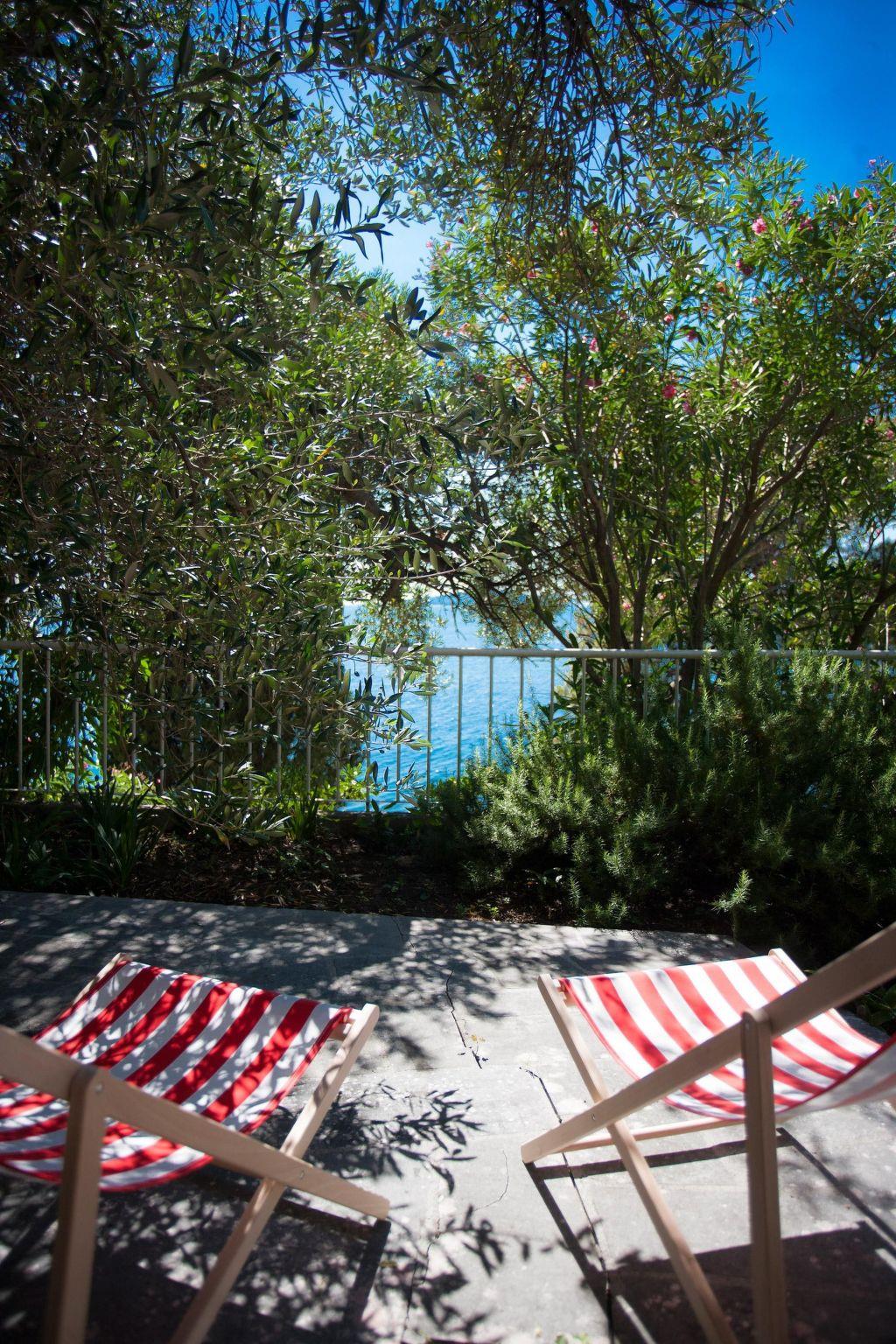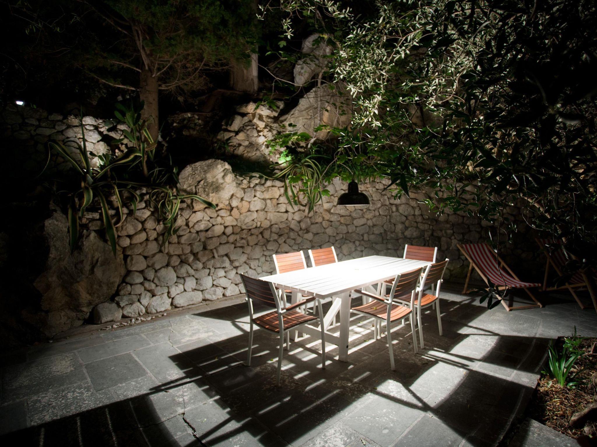 The house is surrounded by terrace gardens on different levels, suitable for dining outdoors and for relaxing. The terraces are surrounded by lavender and oleander bushes, mandarins, citrus fruits, almond and olive trees, as well as Mediterranean herbs such as rosemary, thyme, mint, sage and other plants. There is a separate grill house to the rear with an open fireplace and another private dining space. The whole site is fenced and child-friendly. There is a natural fountain with drinking water from the mountain right next to the site, a minute’s walk away. You access the property through the gate from the pretty coastal path adjoining the private interior courtyard. There is a private garage here for one car, as well as four other parking spaces, free of charge. You can use two bicycles free of charge.