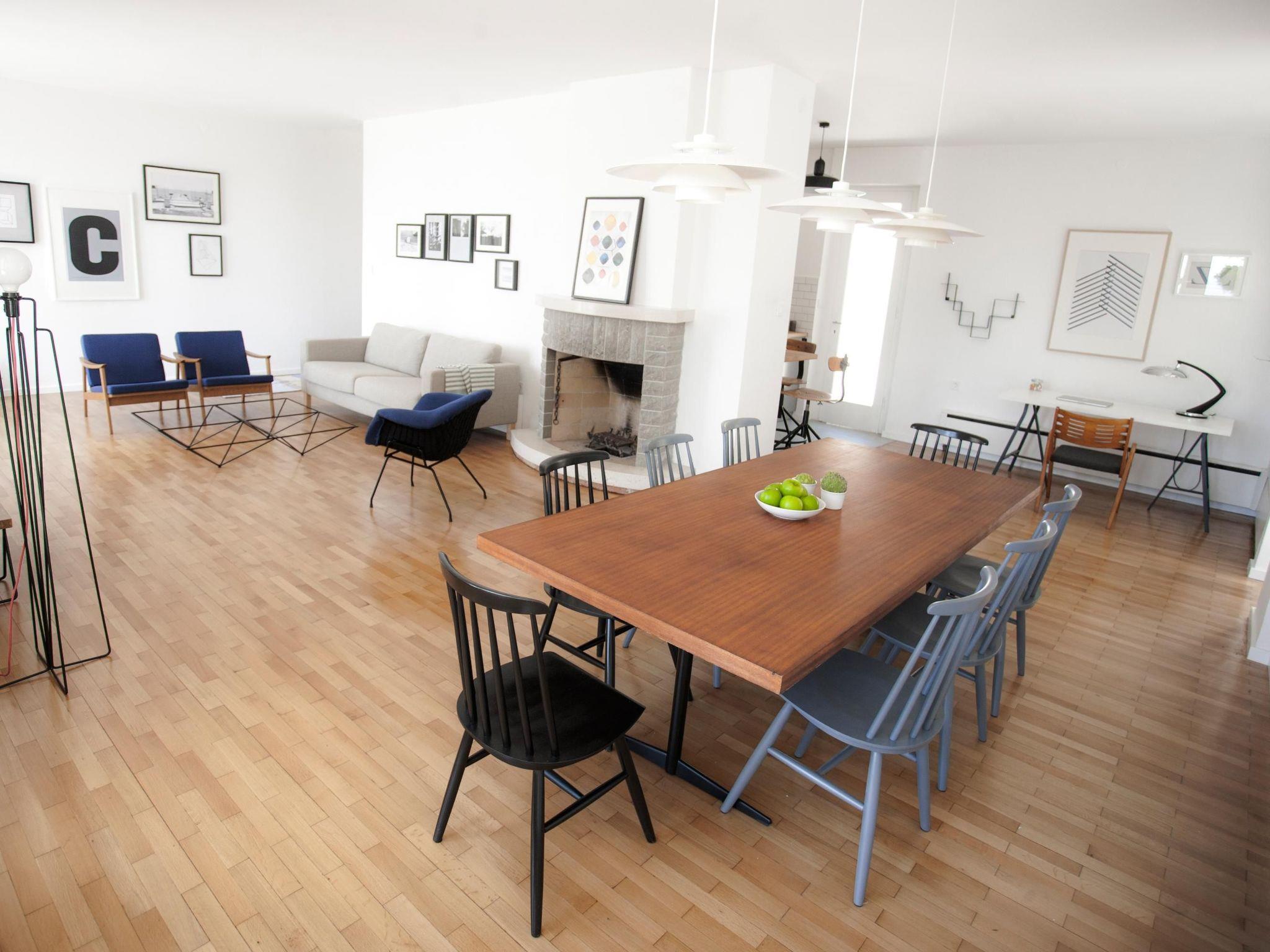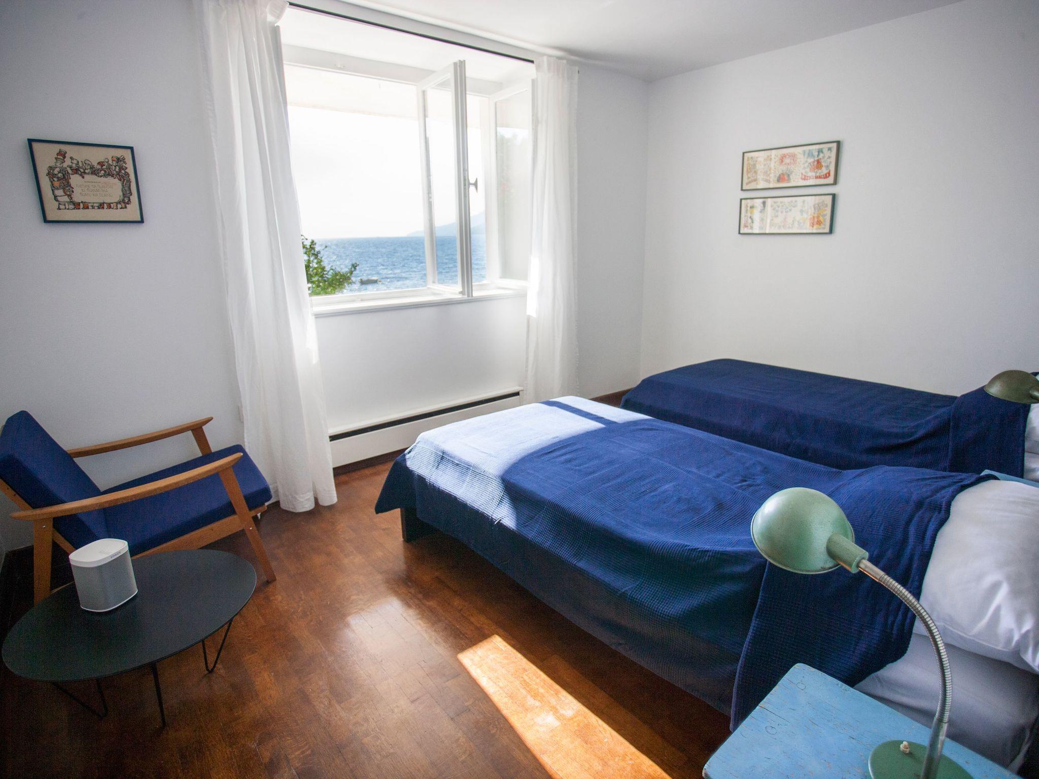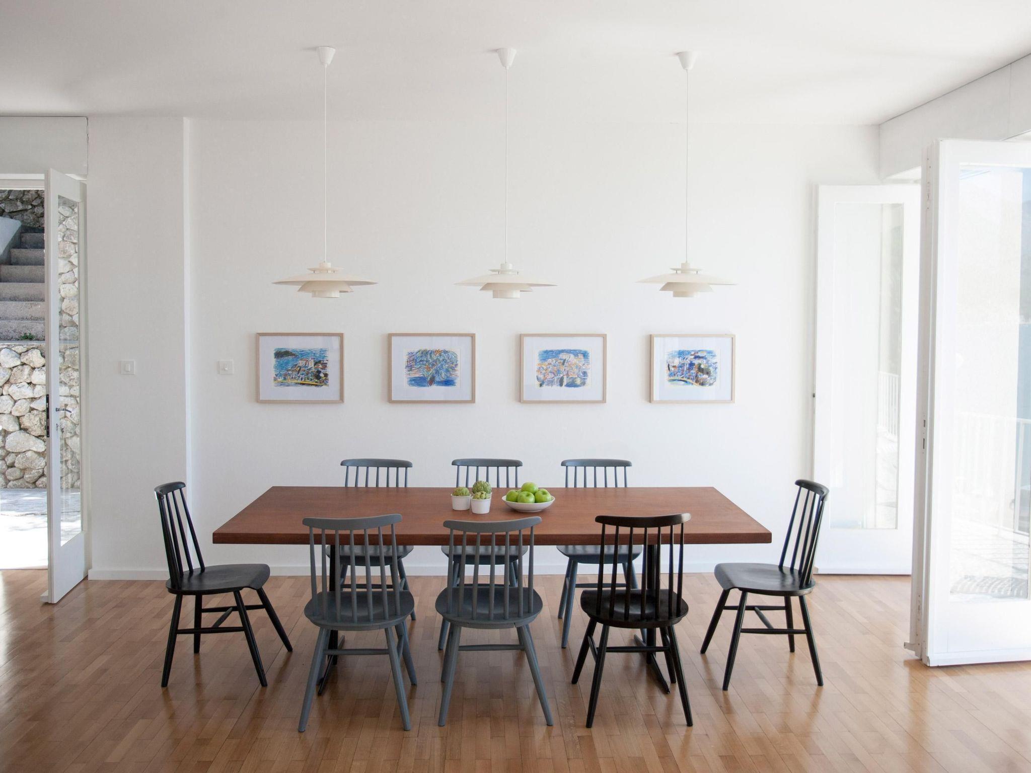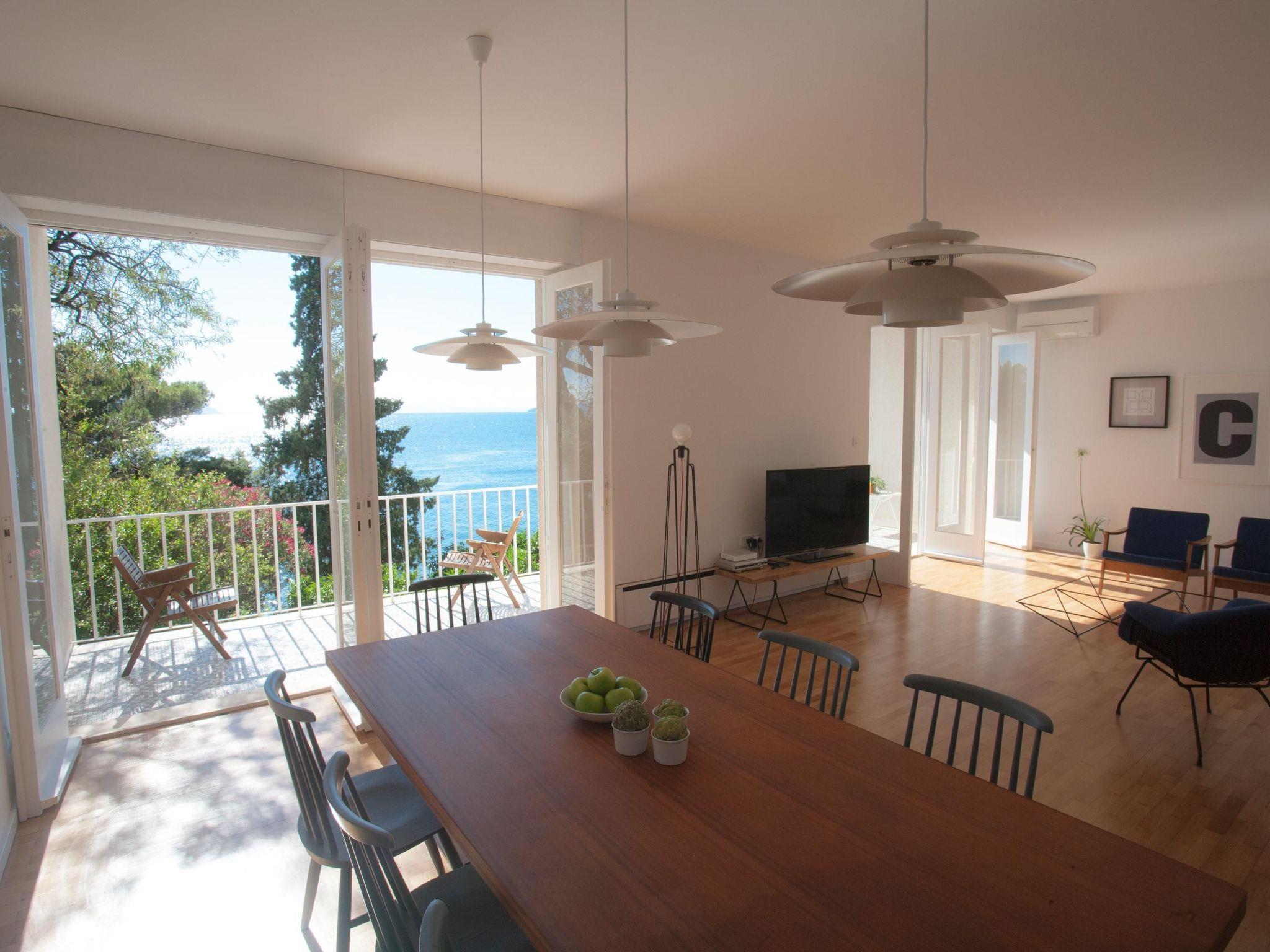 The villa is one of the best examples of the modern architecture of the early 1960s in Dalmatia. The house was built by the legendary, post-modern architect Ivo Vitic and was completely renovated n 2014. It is ideal for friends, families or couples who would like to spend a holiday together in a private atmosphere. The villa with a quality interior provides a total of 315m² of living space on two floors for up to ten people, with five bedrooms and two modern bathrooms. The ground floor has two entrances and consists of a hallway, three comfortable bedrooms (two with a sea view) for six people, a modern bathroom and generous stairs leading up to the first floor. The magnificent lounge on the first floor with a big, open fireplace and a dining space measures 50m² and has four glass doors opening onto the big balcony, affording a wonderful view of the Adriatic archipelago. This floor has the master bedroom with a double bed and sea view, a bedroom with two single beds, and a lovely bathroom with a bath. The lounge has an adjoining studio area and a big, fully-equipped, high-tech kitchen with an induction hob, fridge, oven, microwave, dishwasher, washing machine, espresso machine, toaster, mixer, juicer and hand mixer. The kitchen has a back door leading out onto several garden terraces, which are also accessible from the front and the side of the villa. Free wireless Internet access and air conditioning are available. The house also has remote-controlled blonds, a quality Sonos stereo system so you can listen to your music collection in every room of the house, and a 50” LCD TV with Internet.