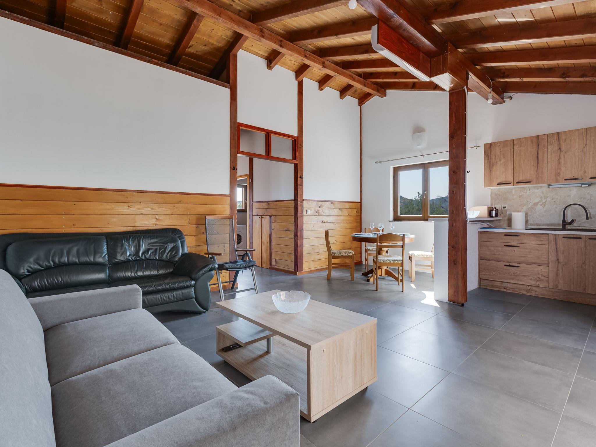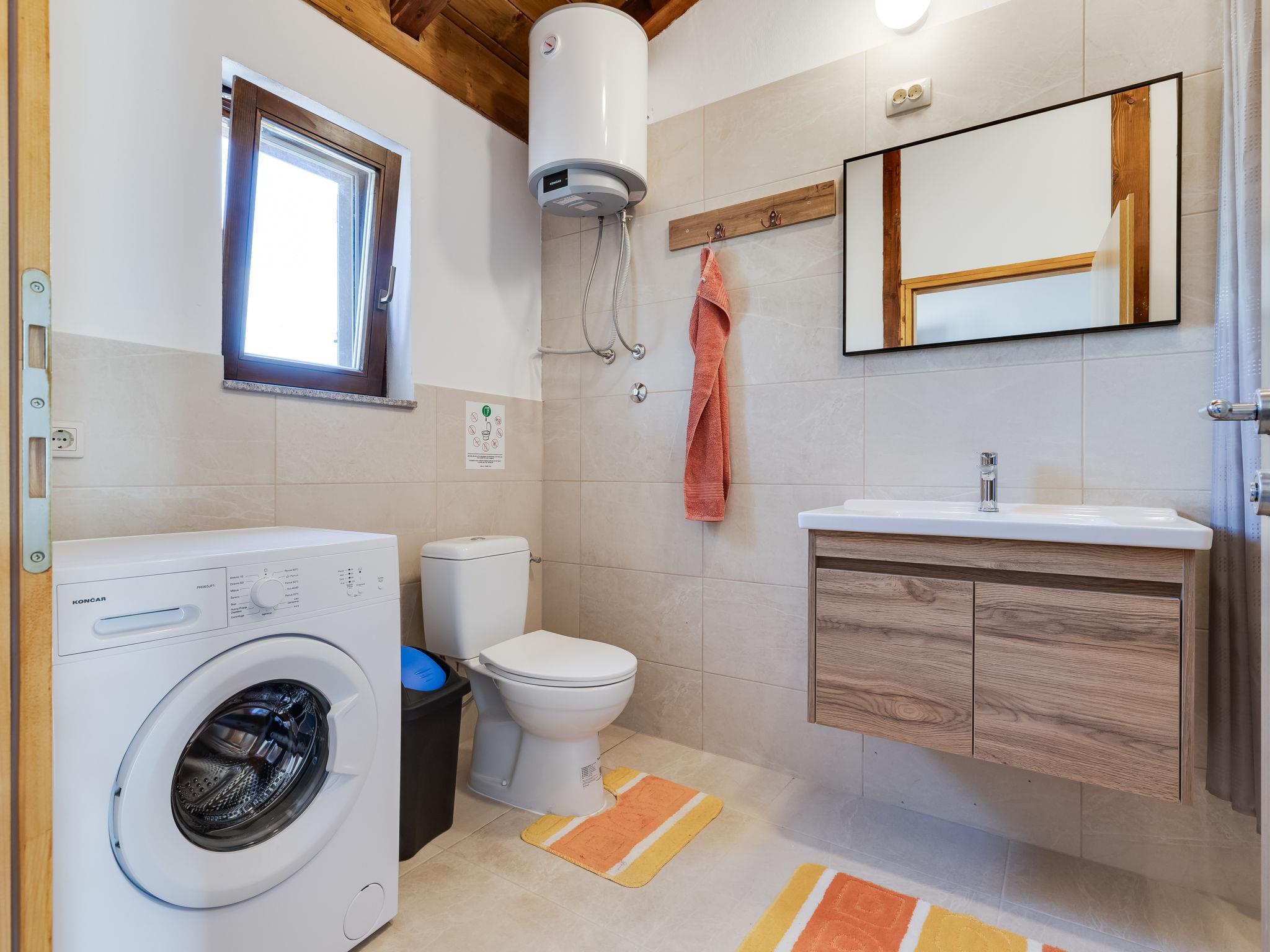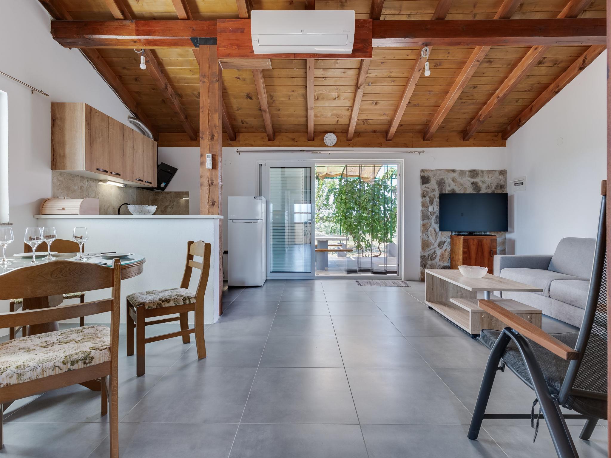2-room house 50 m2, south-west facing position. Living/dining room with 1 double sofabed (160 cm, length 200 cm), TV (flat screen), air conditioning. Exit to the terrace. 1 room with 1 double bed (160 cm, length 200 cm). Open kitchen (oven, 4 ceramic glass hob hotplates, kettle, microwave, freezer, electric coffee machine). Shower/WC. No heating option. Facilities: hair dryer. Internet (WiFi, free). Please note: suitable for families. Fire extinguisher.