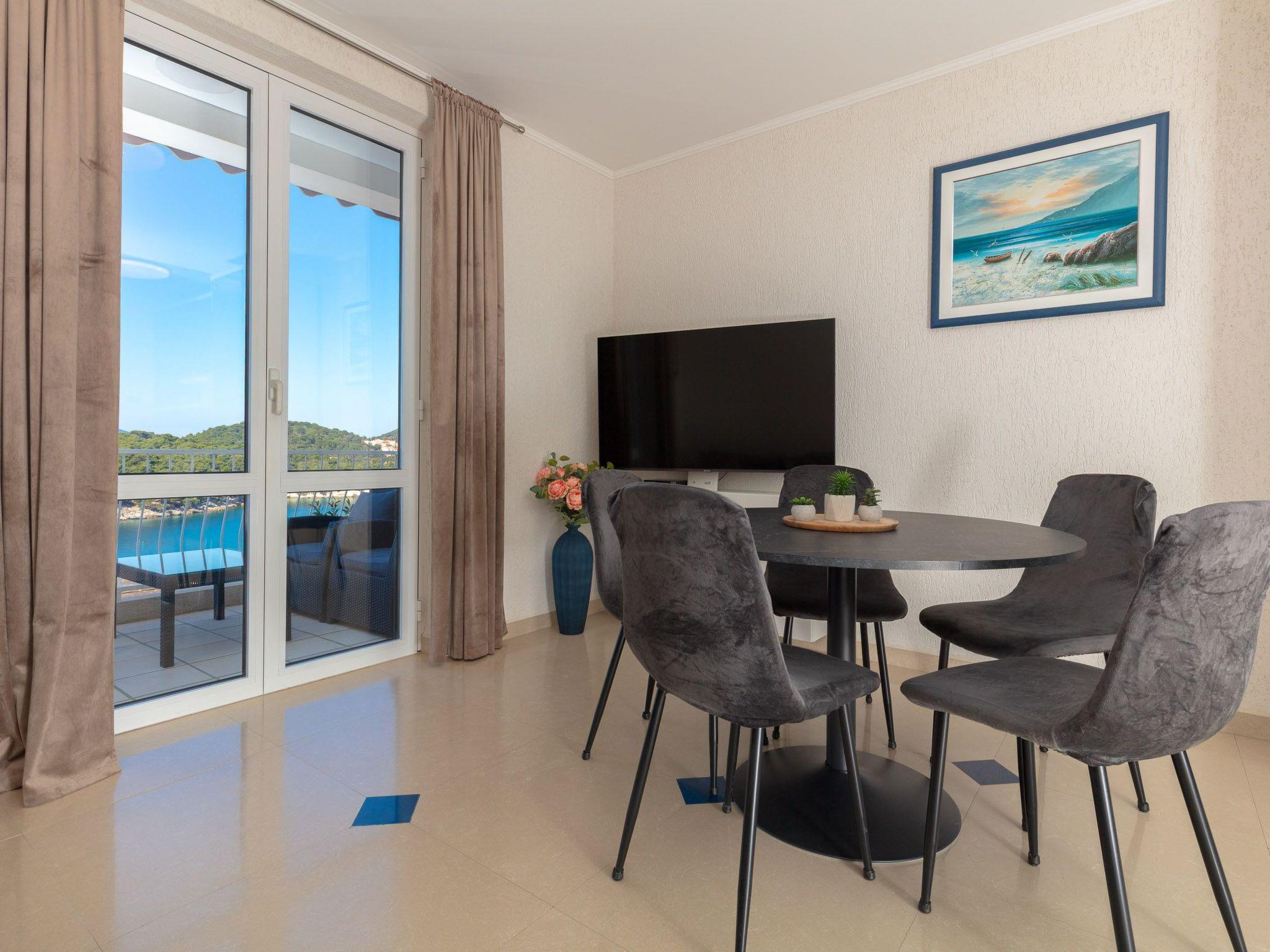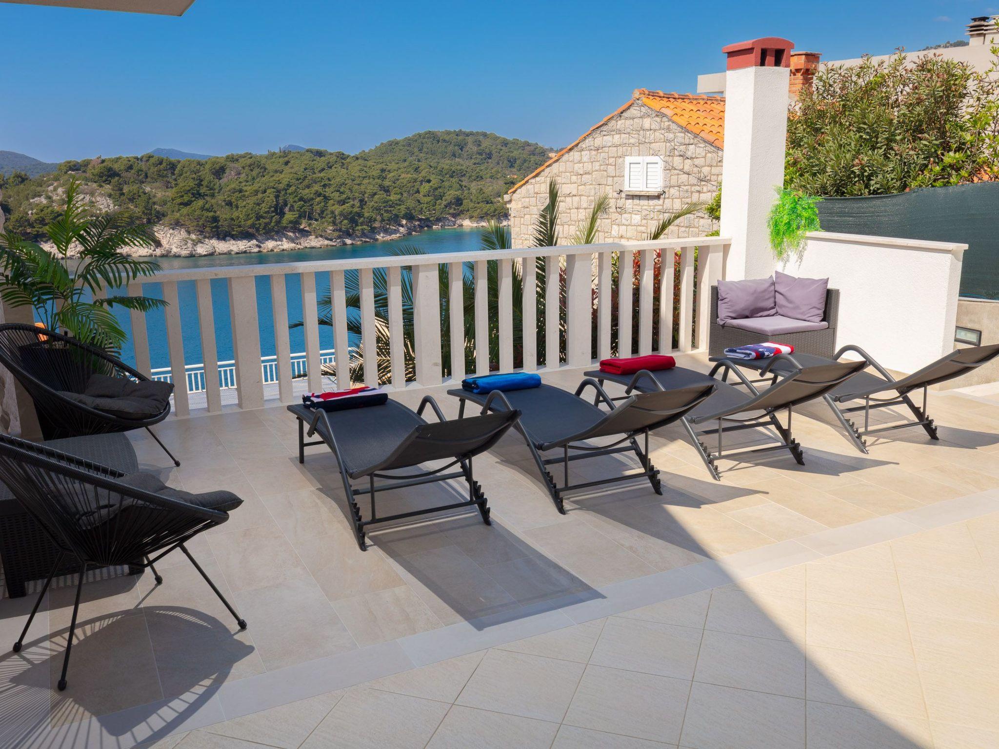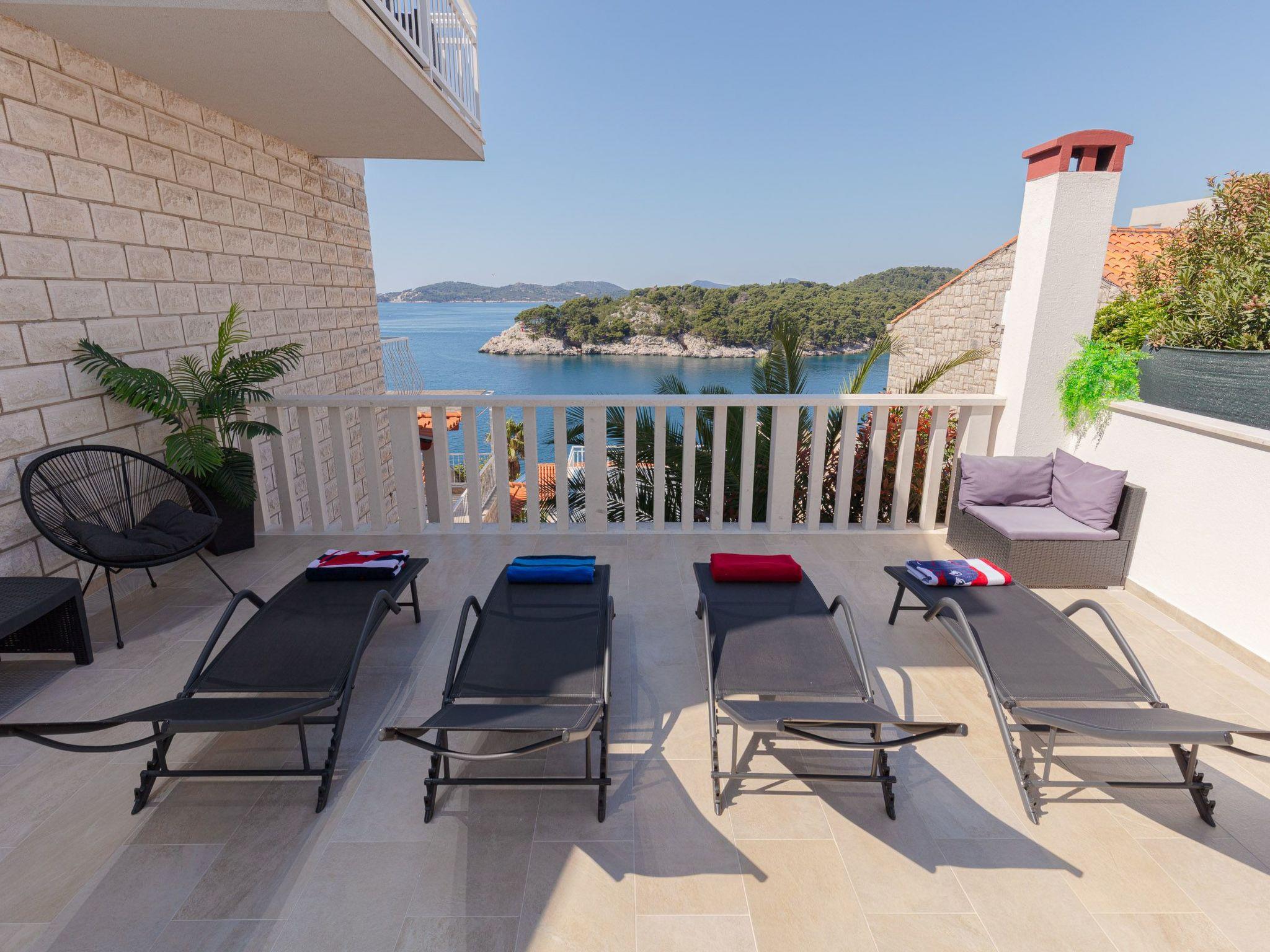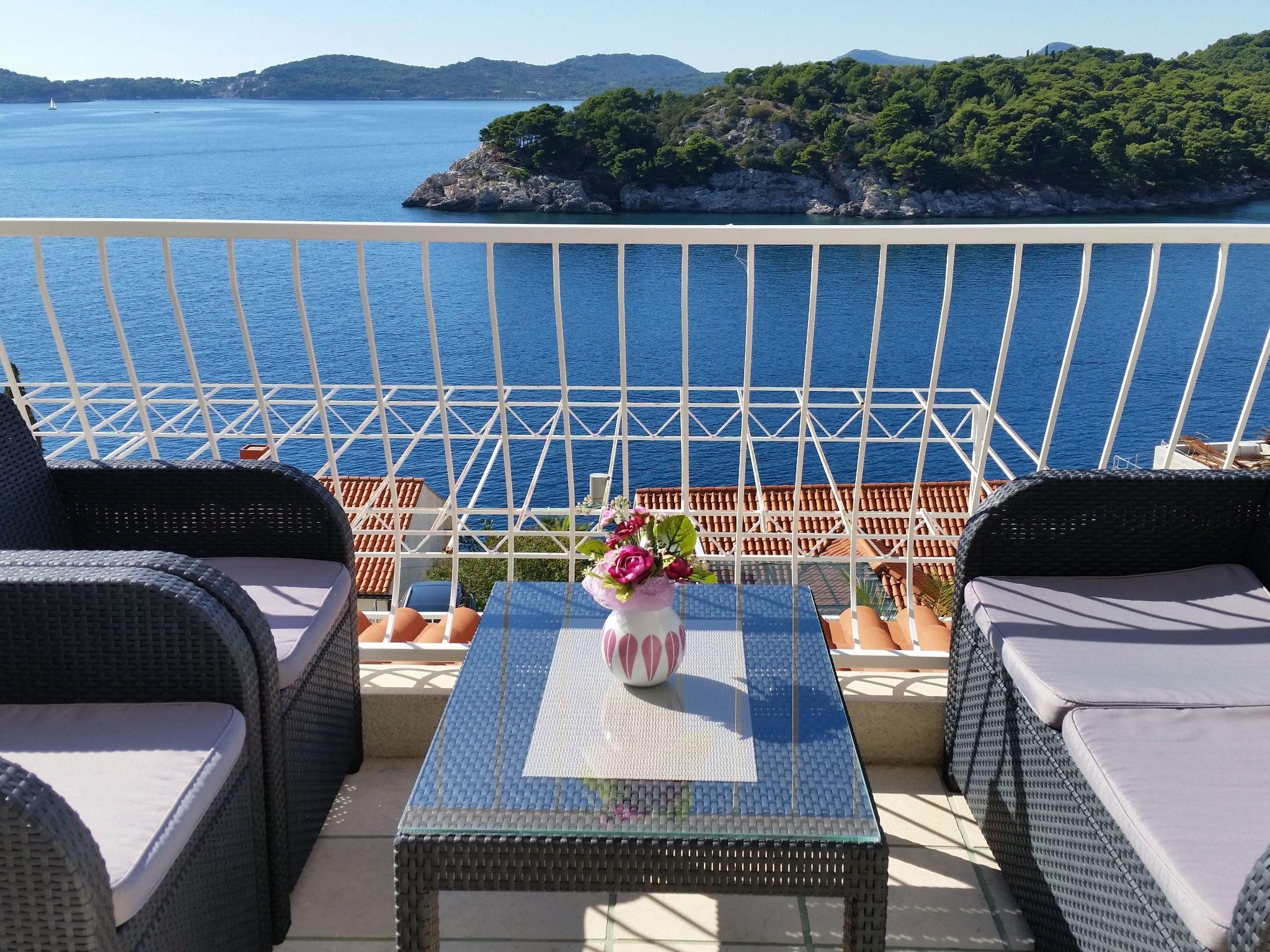 The balcony with a view of the Elaphiti Islands has enough space for a dining table. Shared swimming pool at the terrace. Private parking spaces are provided.