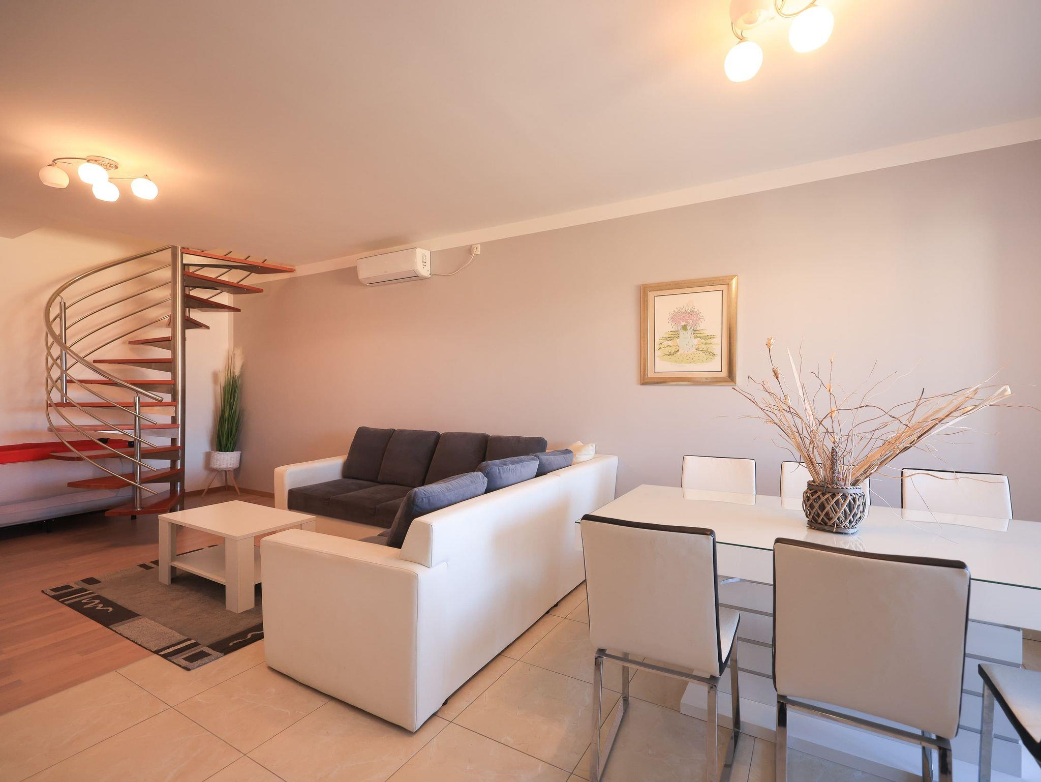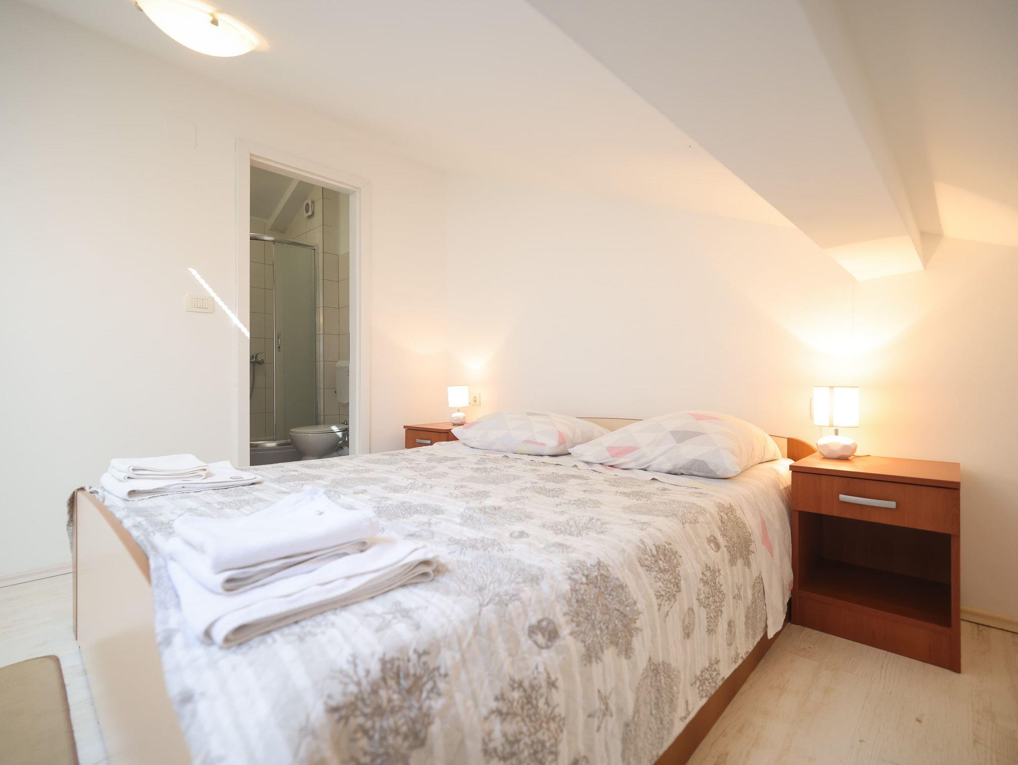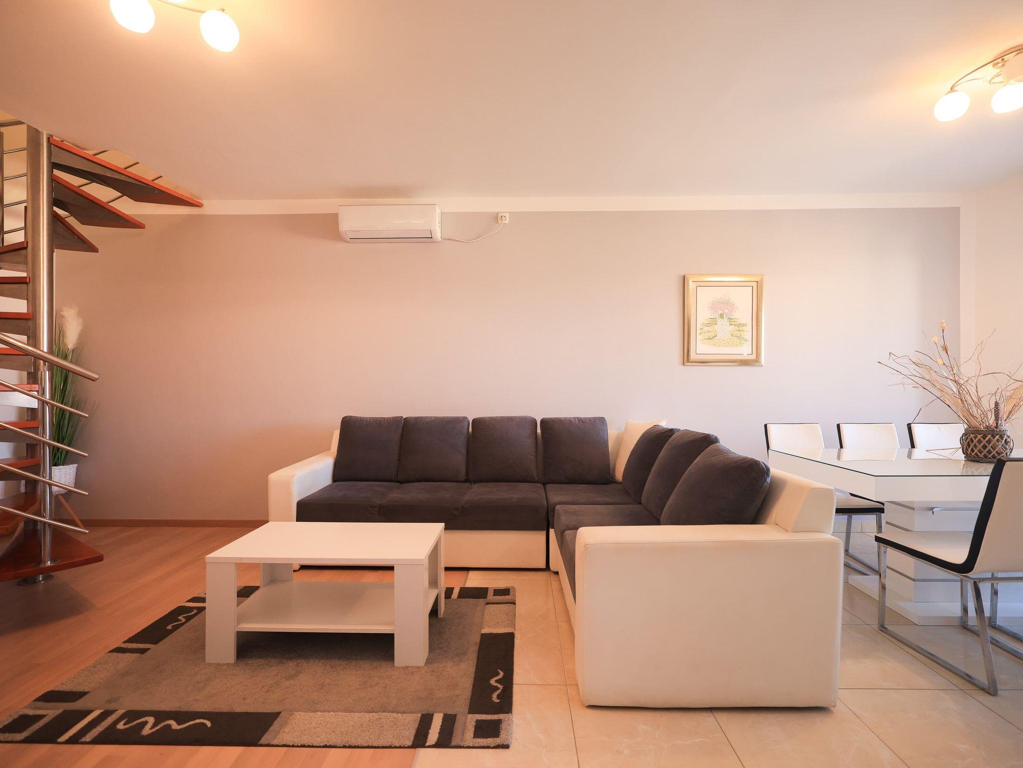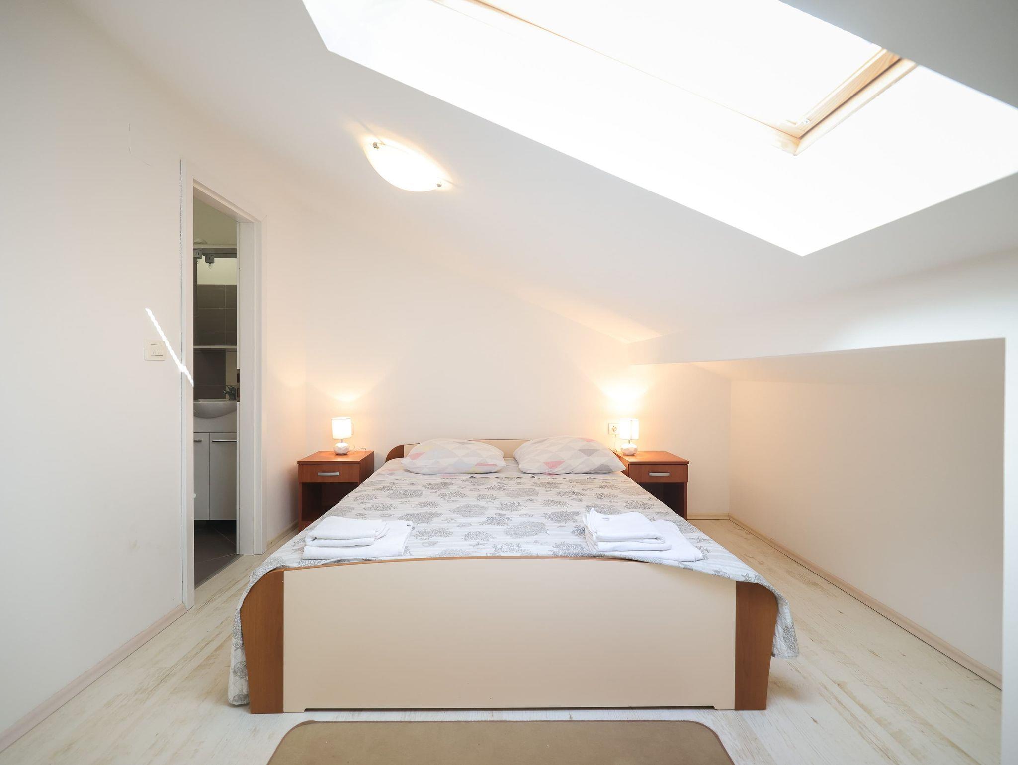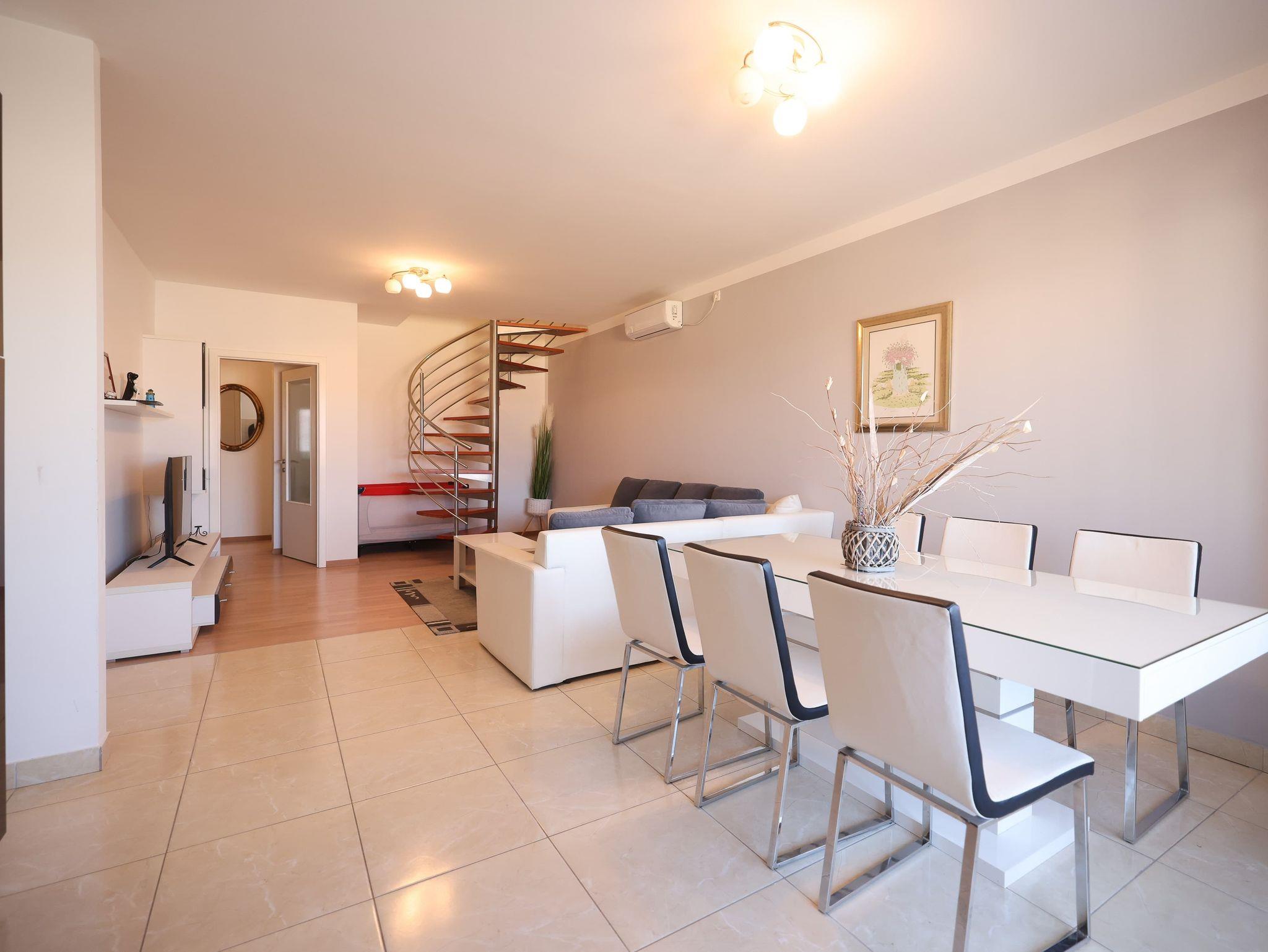 Ferienwohnung bietet Platz für 5 Gäste. Die Betten sind in Schlafzimmern, die es 3 gibt, innerhalb einer Gesamtfläche von 105m2, angeordnet. Die Gäste haben eine eigene Terrasse zur Verfügung, auf der sie in warmen Sommernächten genießen können. Für vollen Genuss und Entspannung gibt es einen privaten Grill für Gäste dieser Unterkunft. IM PREIS INBEGRIFFEN: Kurtaxe, Endreinigung, Klimatisierung, Parkplatz, Internet, Kinderbett, Bügeleisen, Bügelbrett, Föhn. VERBINDLICHE ZUSÄTZLICHE KOSTEN: Aufzahlung für Kurzaufenthalte (prozentualer Zuschlag pro Nächtigungsanzahl: 30% - 1, 20% - 2, 10% - 3). Die Verfügbarkeit zusätzlicher Dienstleistungen in Ihrem reservierten Termin und die Preise derselben (falls nicht aufgeführt) müssen im Voraus überprüft werden. Zusätzliche Dienstleistungen die in der Zahlungsaufforderung nicht aufgeführt sind werden direkt beim Vermieter bezahlt, angenommen der Gast nutzt auch diese.
