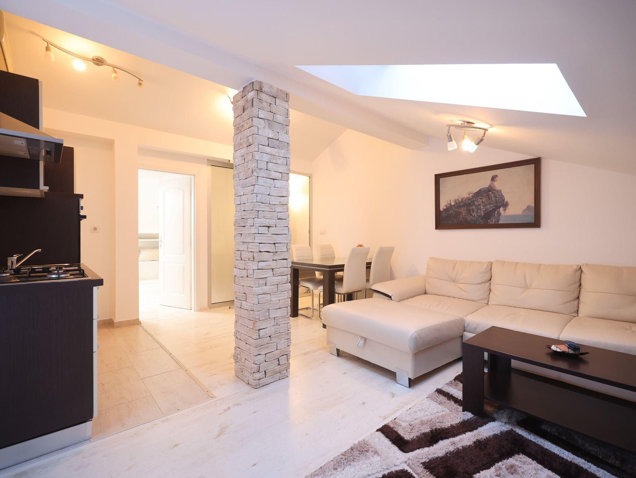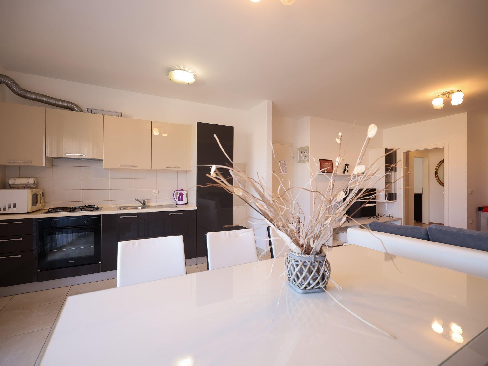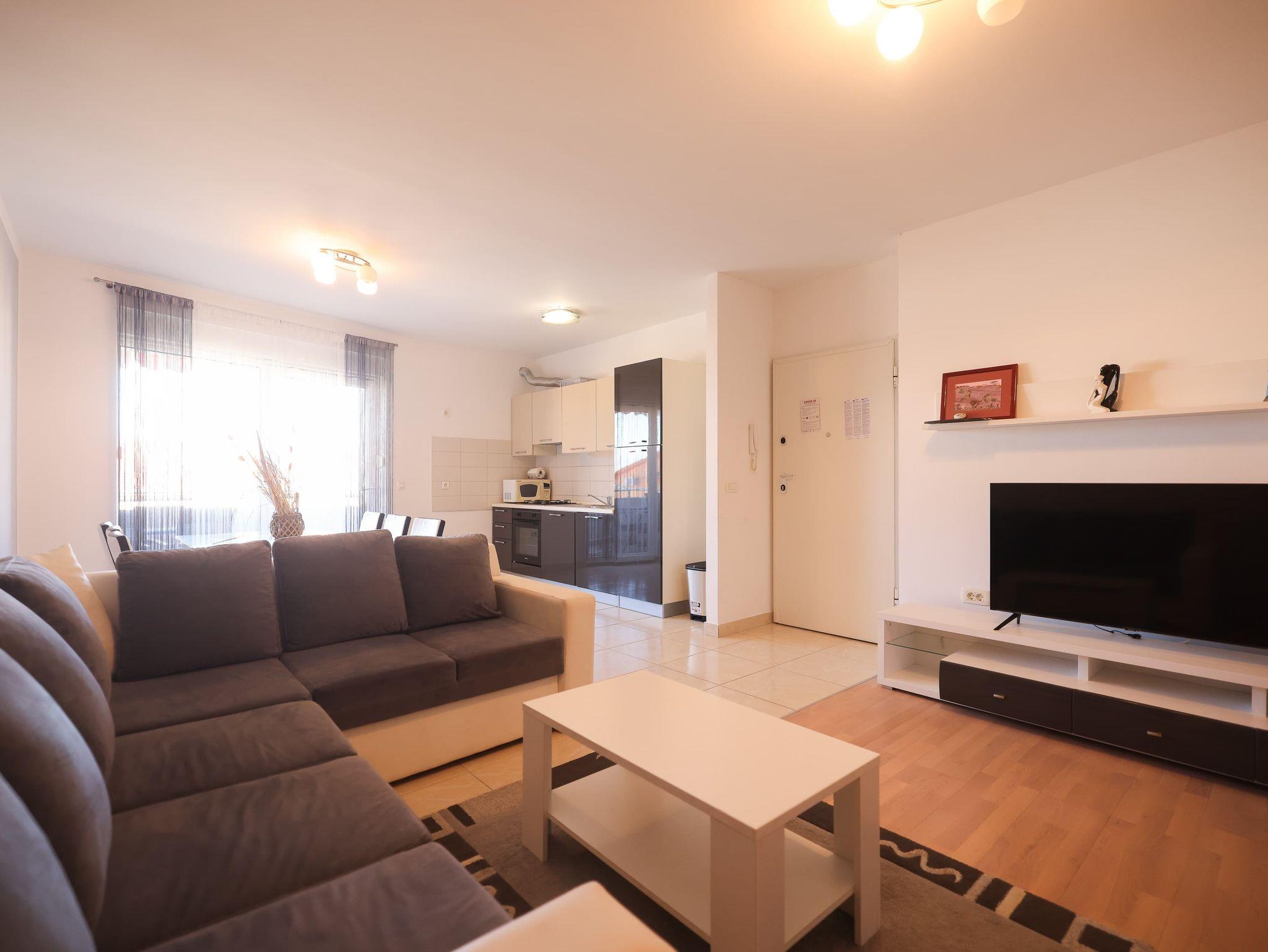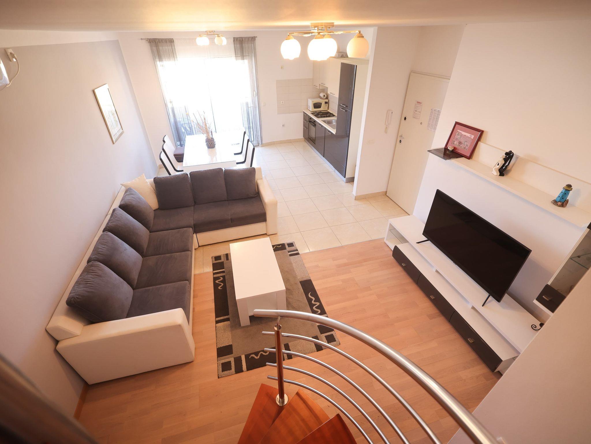 Ferienwohnung bietet Platz für 5 Gäste. Die Betten sind in Schlafzimmern, die es 3 gibt, innerhalb einer Gesamtfläche von 105m2, angeordnet. Die Gäste haben eine eigene Terrasse zur Verfügung, auf der sie in warmen Sommernächten genießen können. Für vollen Genuss und Entspannung gibt es einen privaten Grill für Gäste dieser Unterkunft. IM PREIS INBEGRIFFEN: Kurtaxe, Endreinigung, Klimatisierung, Parkplatz, Internet, Kinderbett, Bügeleisen, Bügelbrett, Föhn. VERBINDLICHE ZUSÄTZLICHE KOSTEN: Aufzahlung für Kurzaufenthalte (prozentualer Zuschlag pro Nächtigungsanzahl: 30% - 1, 20% - 2, 10% - 3). Die Verfügbarkeit zusätzlicher Dienstleistungen in Ihrem reservierten Termin und die Preise derselben (falls nicht aufgeführt) müssen im Voraus überprüft werden. Zusätzliche Dienstleistungen die in der Zahlungsaufforderung nicht aufgeführt sind werden direkt beim Vermieter bezahlt, angenommen der Gast nutzt auch diese.
