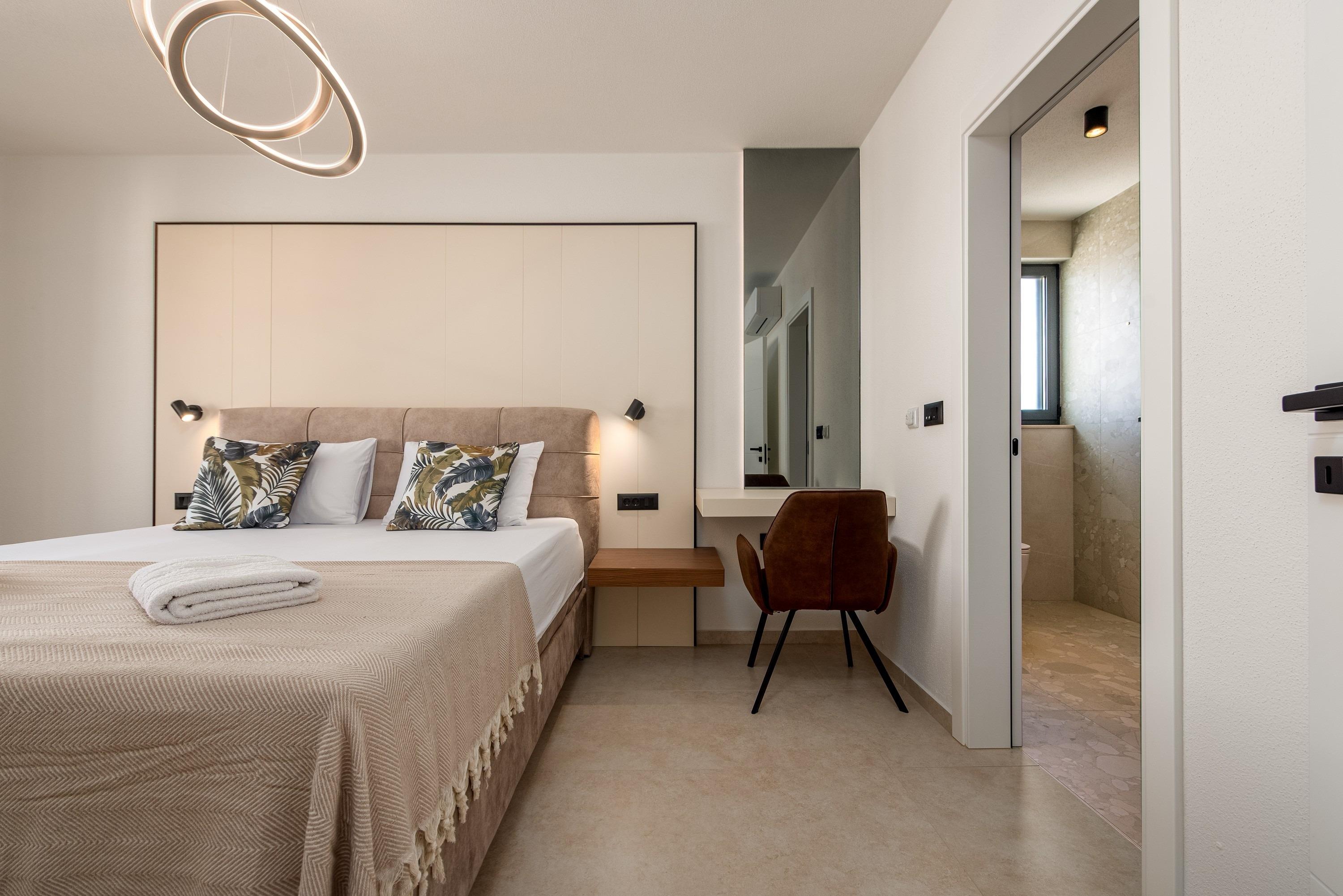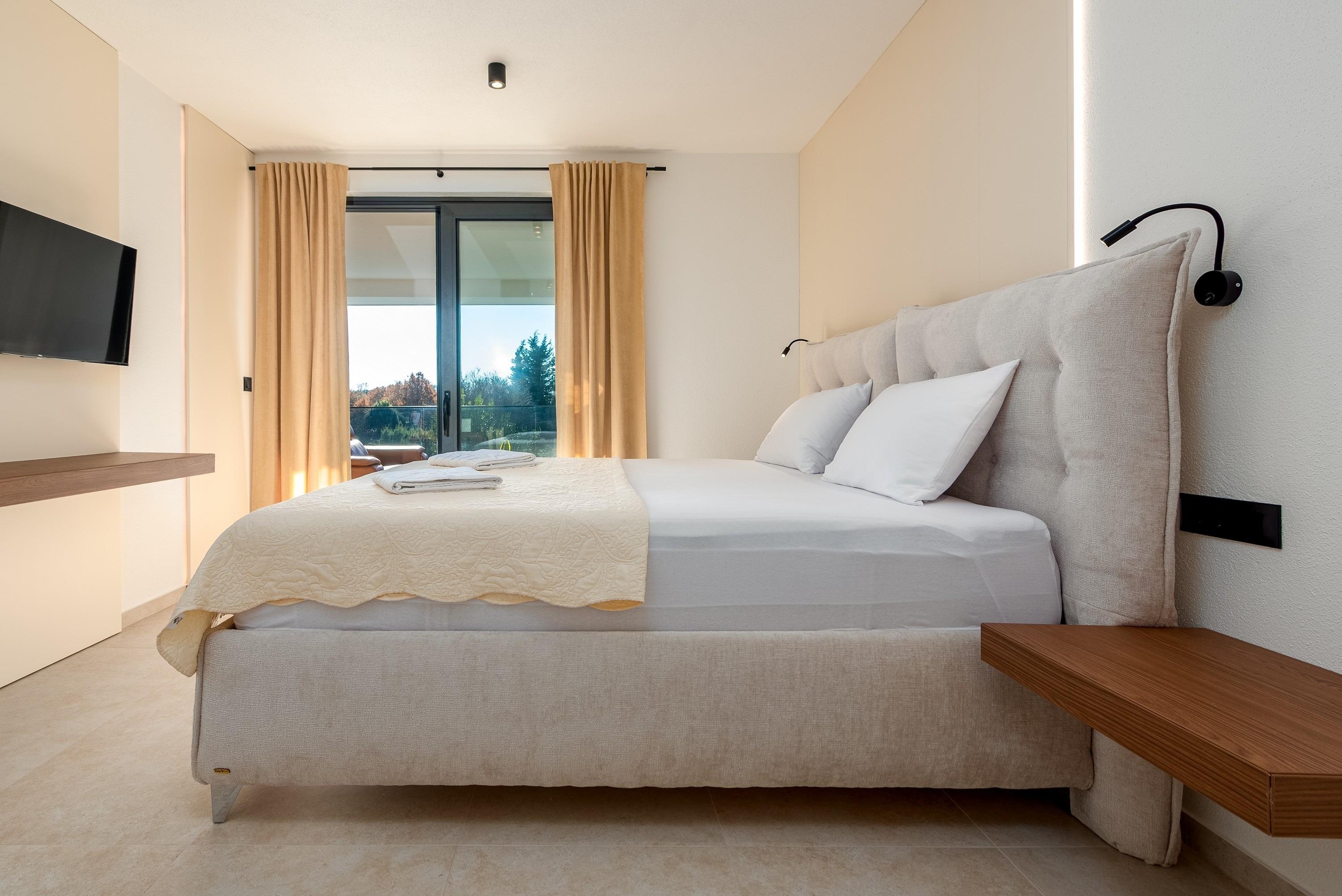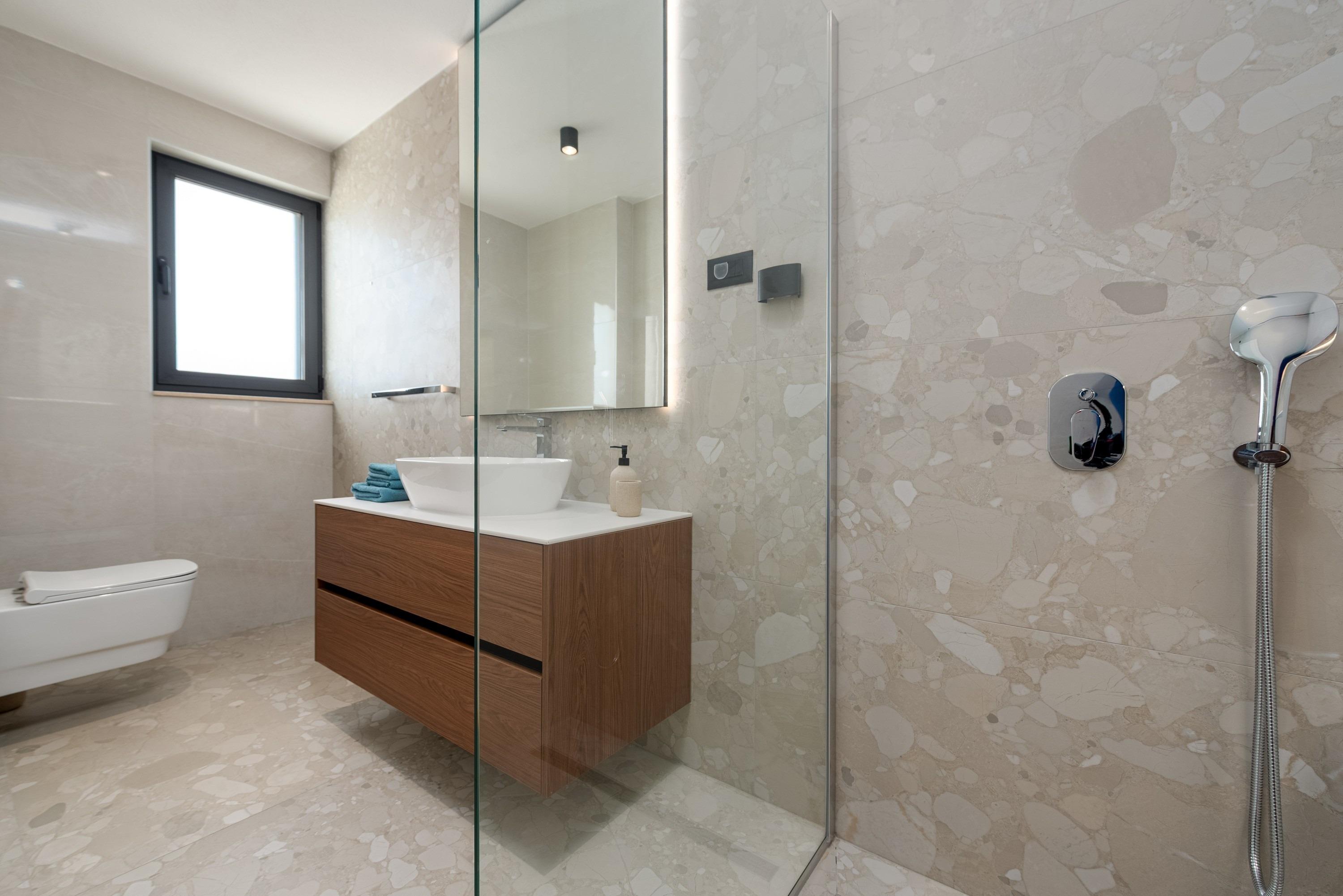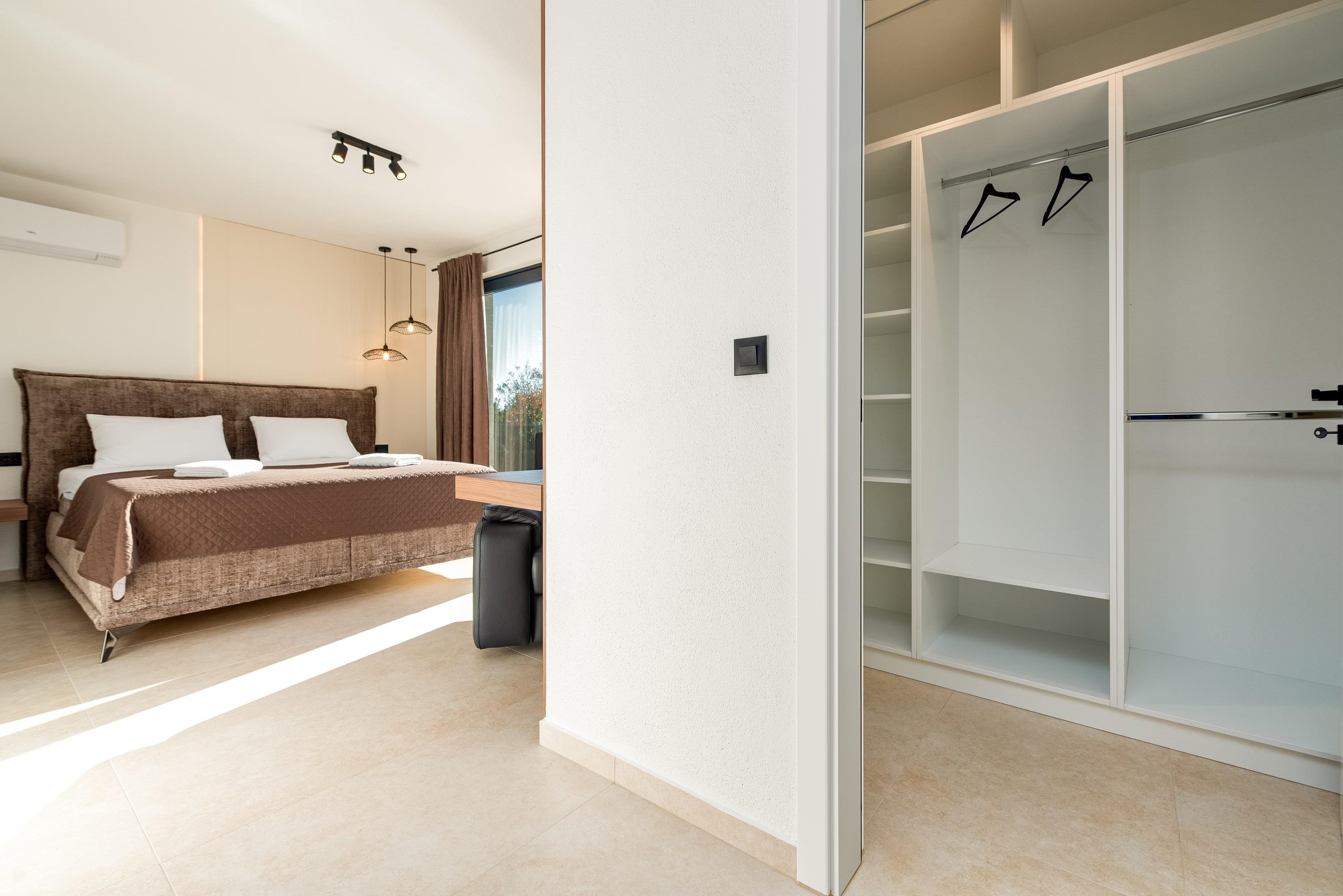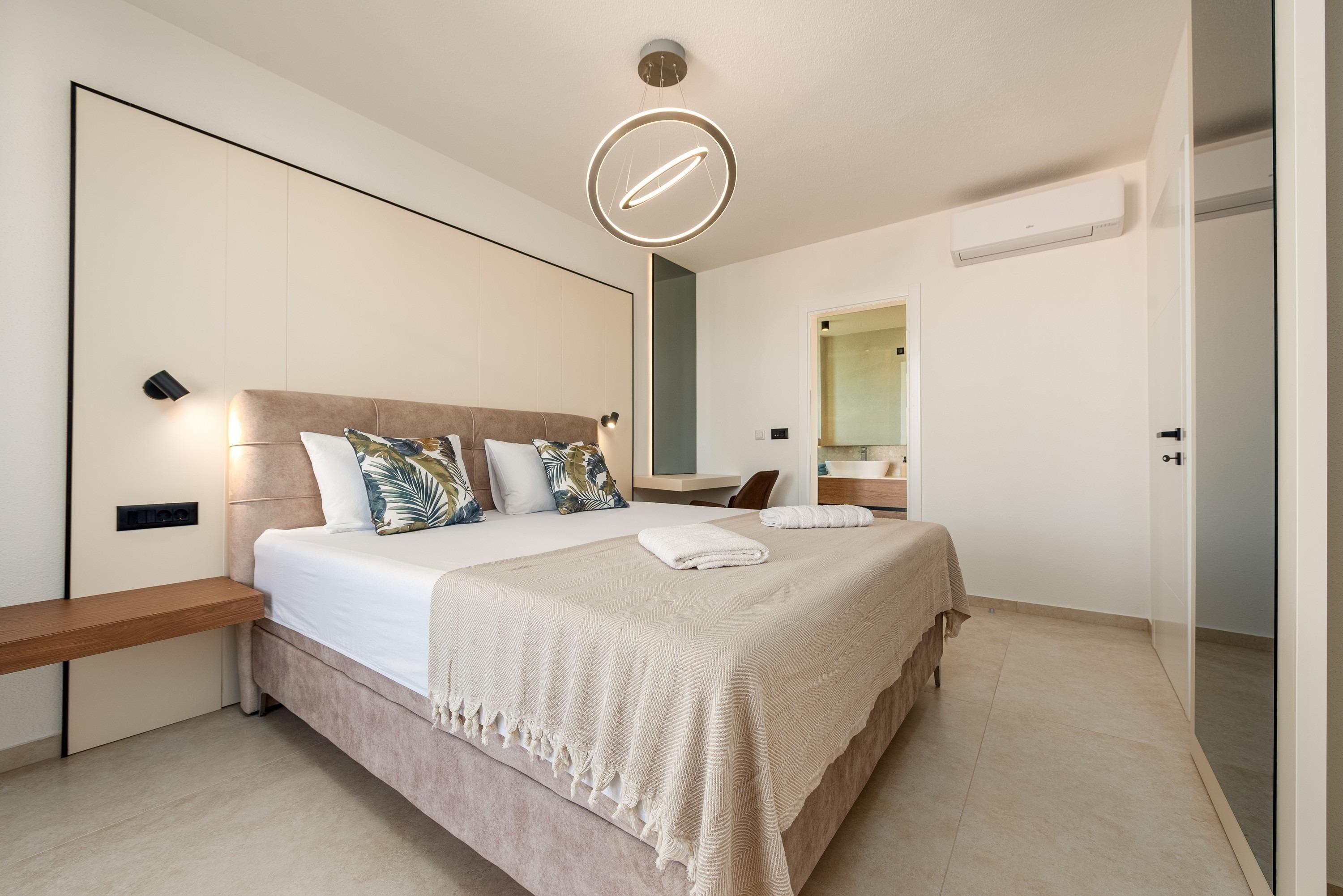 Im Erdgeschoss der Villa befinden sich ein stilvoll eingerichtetes Wohnzimmer mit Blick auf den Pool, ein Esszimmer mit voll ausgestatteter Küche, ein separates WC, ein Abstellraum mit Waschküche inklusive Waschmaschine und Trockner sowie ein Schlafzimmer mit Doppelbett und eigenem Badezimmer mit Dusche, Klimaanlage, Sat-TV und Safe. Im ersten Stock der Villa befinden sich vier Schlafzimmer mit Doppelbetten, jeweils mit eigenem Badezimmer mit Dusche, einem privaten, überdachten Balkon mit Tisch und Stühlen sowie Sat-TV, Klimaanlage und Safe. Im zweiten Stock der Villa befindet sich eine Dachterrasse mit teilweisem Meerblick, einem Whirlpool, Sonnenliegen, einer Sitzecke und einer Außenküche. Die Terrasse im Erdgeschoss (25 m²) umfasst einen Essbereich mit Platz für 10 Personen und Zugang zu einem einzigartigen, 8 Meter langen Swimmingpool mit 10 Sonnenliegen, einer Außendusche und einem Grill.
