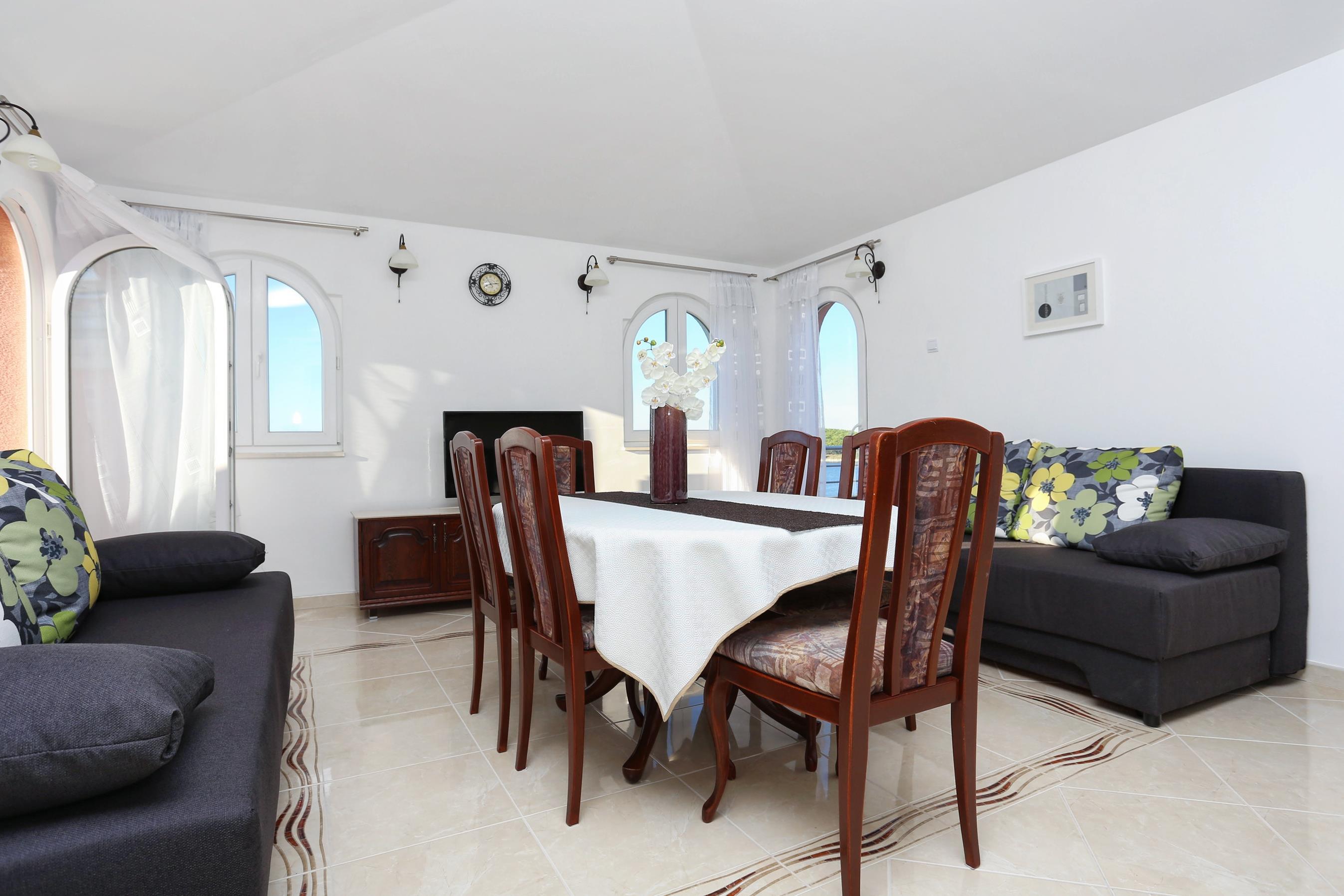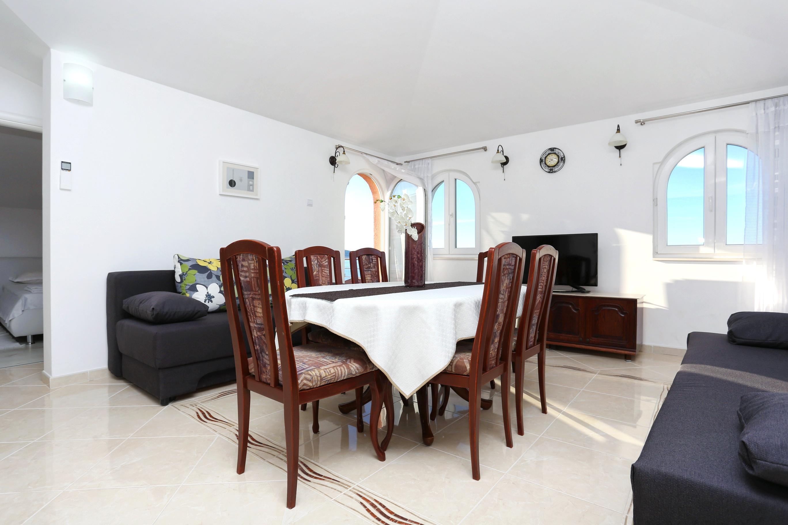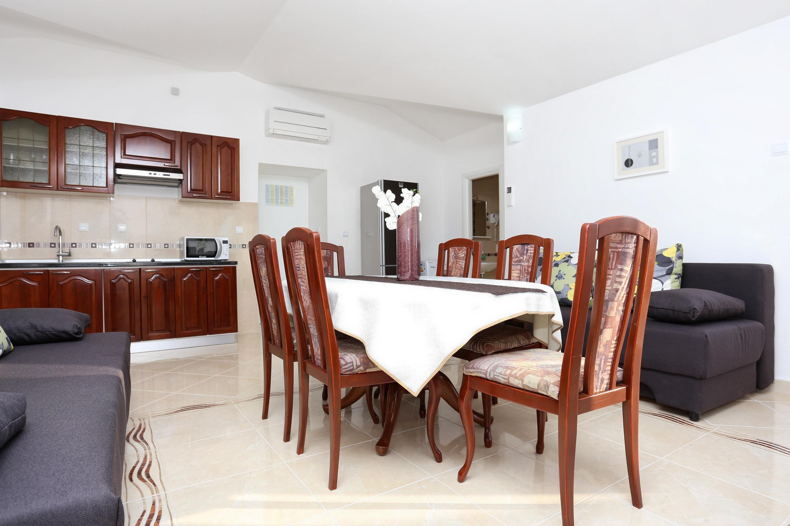 Apartment can accommodate 6 guests. Beds are situated in 2 sleeping rooms, but also in the living room, within 57m2. Guests can use a private balcony to enjoy the warm summer evenings. The apartment offers the sea view. Food can be prepared using barbecue which is shared with other guests too.