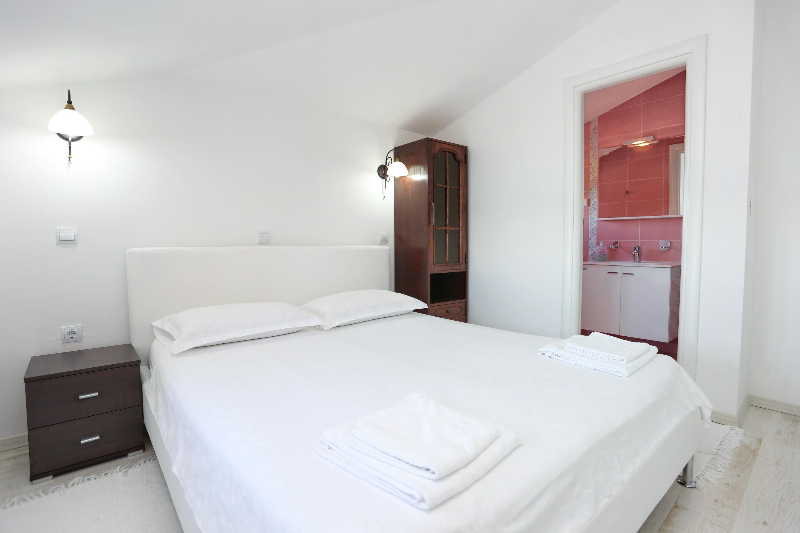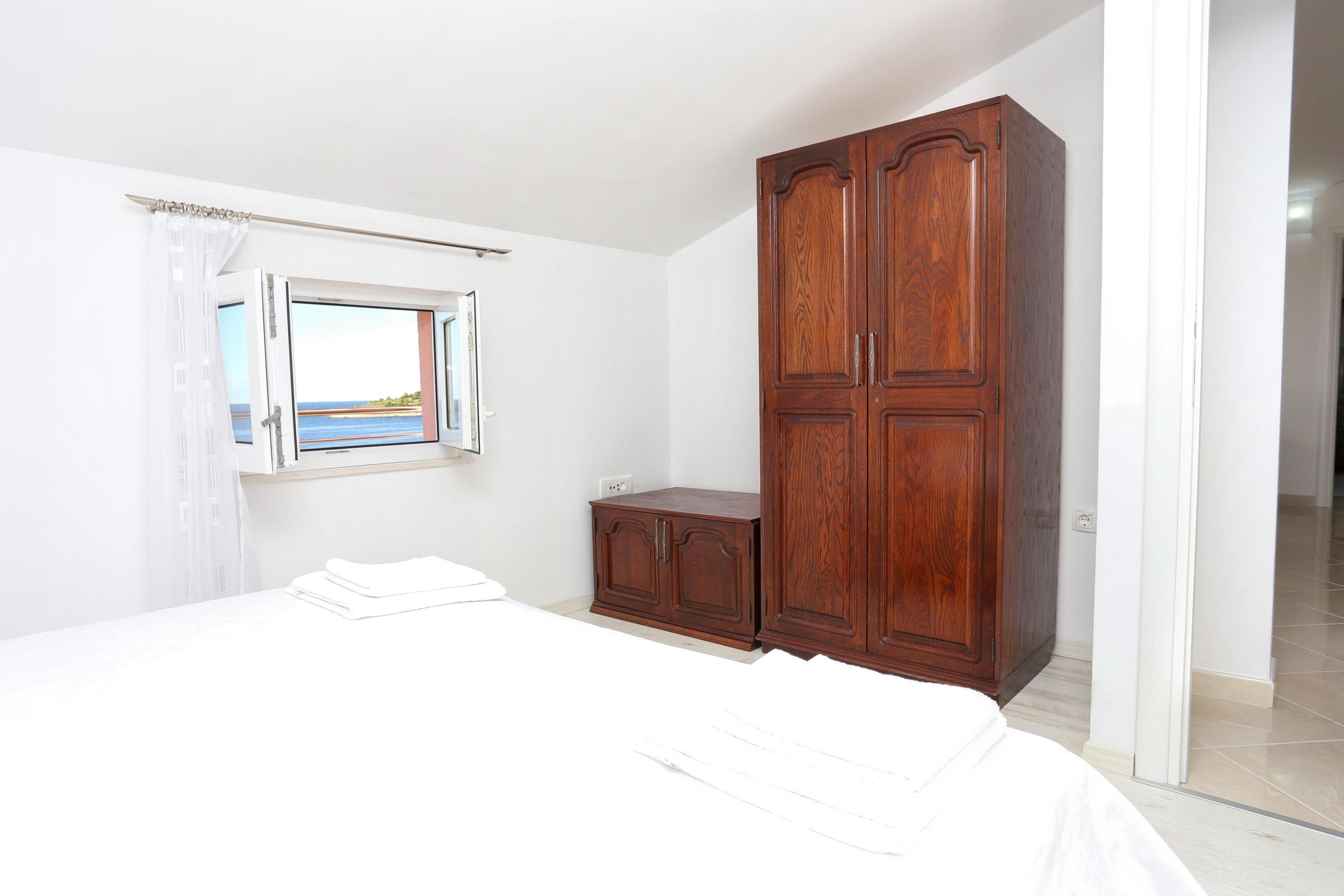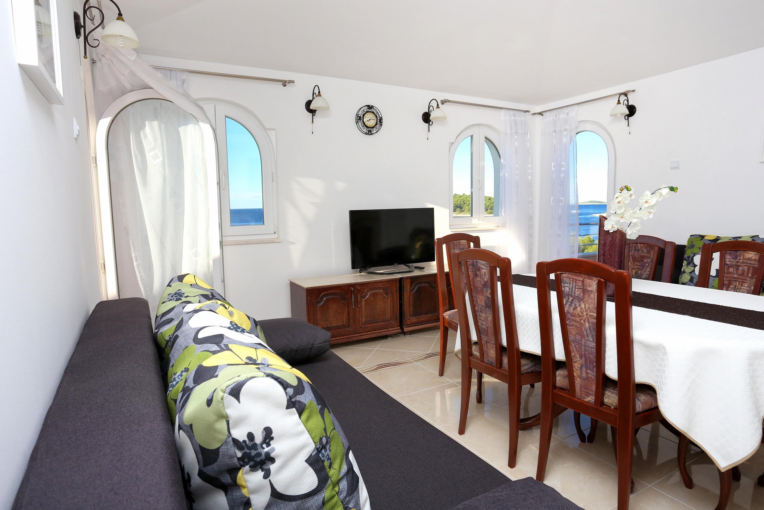 Apartment can accommodate 6 guests. Beds are situated in 2 sleeping rooms, but also in the living room, within 57m2. Guests can use a private balcony to enjoy the warm summer evenings. The apartment offers the sea view. Food can be prepared using barbecue which is shared with other guests too.