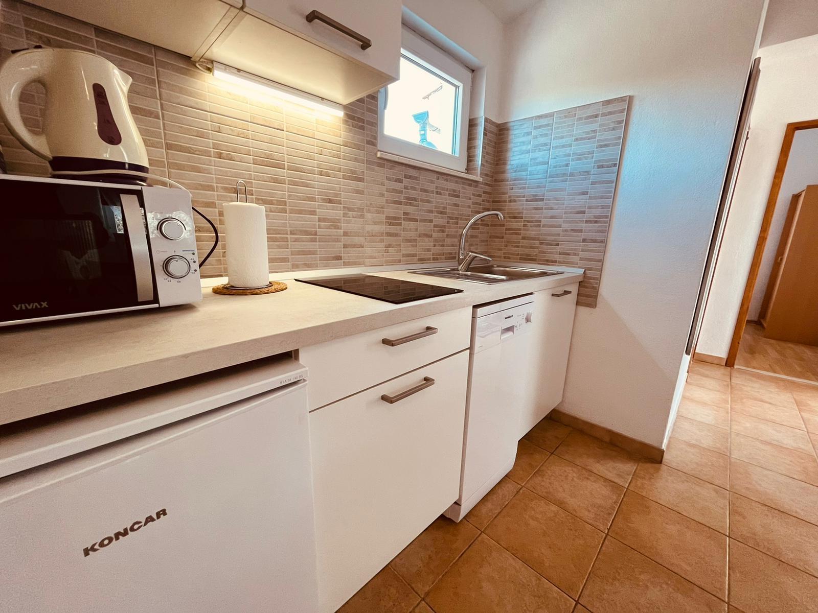 Kitchen (3 m2): Standard equipment: Refrigerator, Stove, Sink, On request: Microwave oven