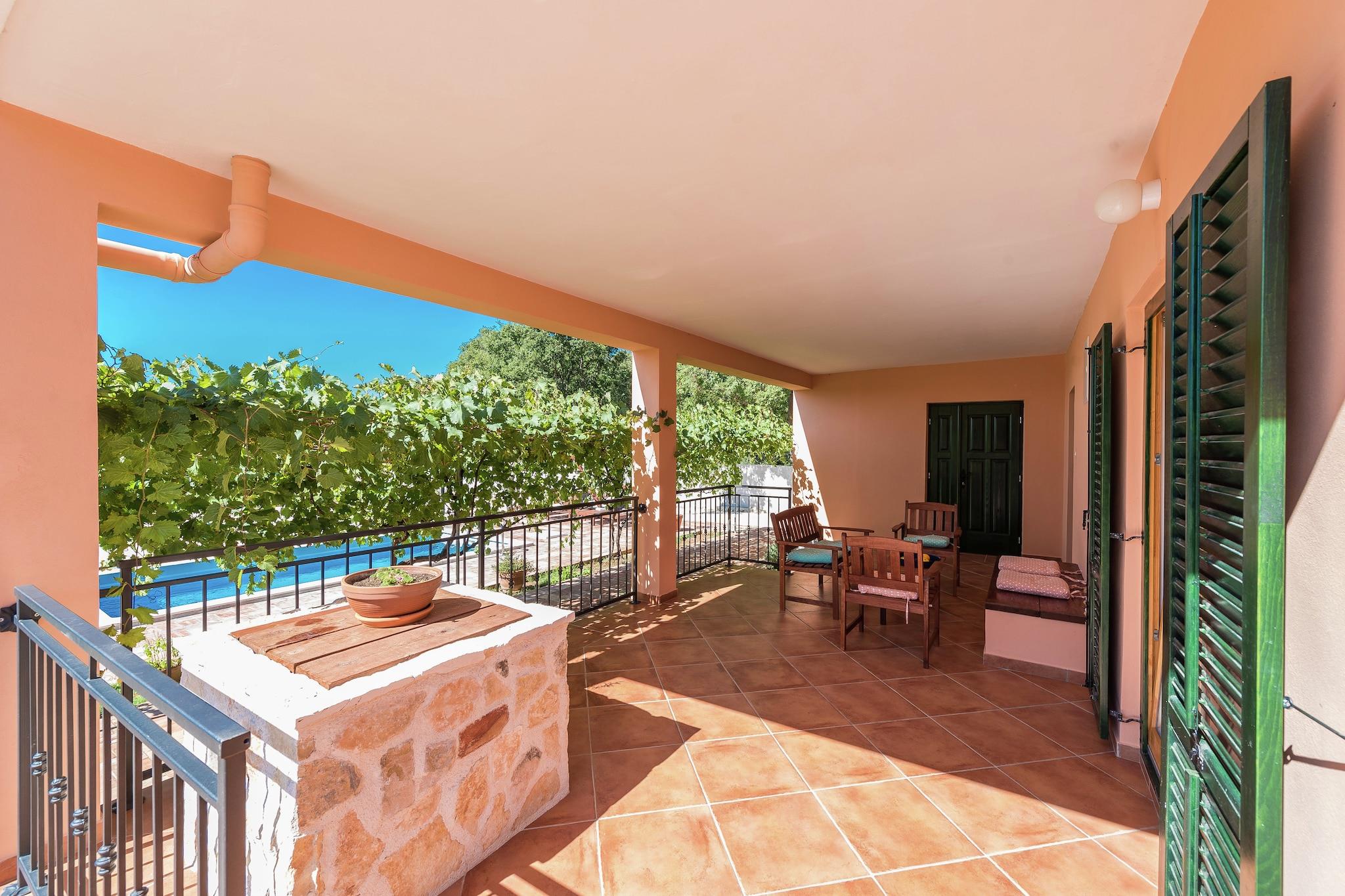 Ground floor: (open kitchen(cooker(4 ring stoves, electric), microwave, fridge-freezer), Living/diningroom(double sofa bed, TV(flatscreen, satellite), dining table, balcony or terrace, heating(wood), air conditioning), bedroom(single bed, double bed), bedroom(single bed, double bed), bathroom(shower, washbasin, toilet, washing machine)) sun shower, terrace(private, 25 m2), garden(private, fenced), garden furniture, BBQ, parking, swimming pool(private, 5 x 4 m.), boules court, sand pit, play equipment